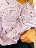 Liliowy kardigan z warkoczami.Doskonałej jakości zapinany na centralne guziki z kryształkami, idealny na sezon jesienno-zimowy.