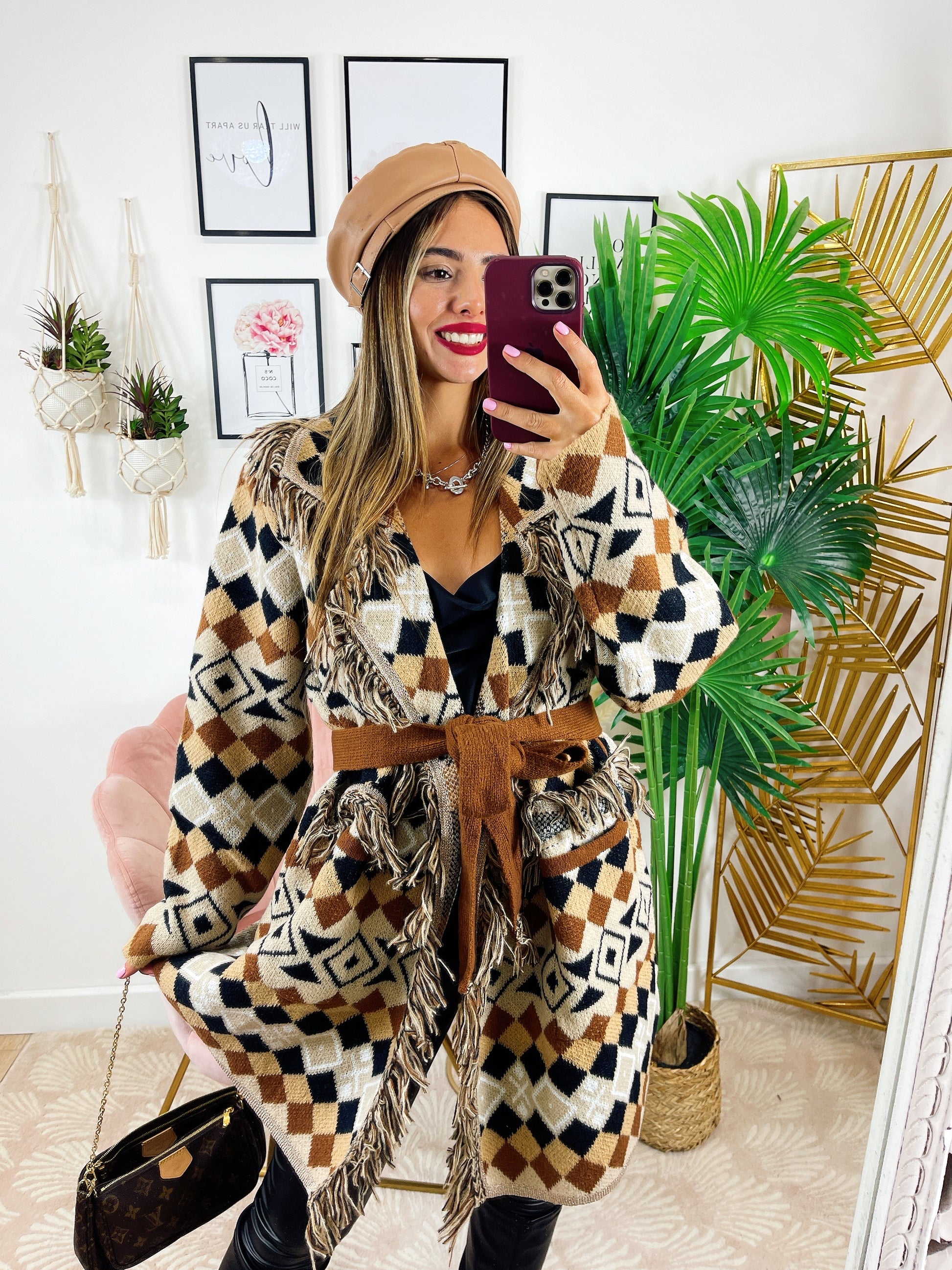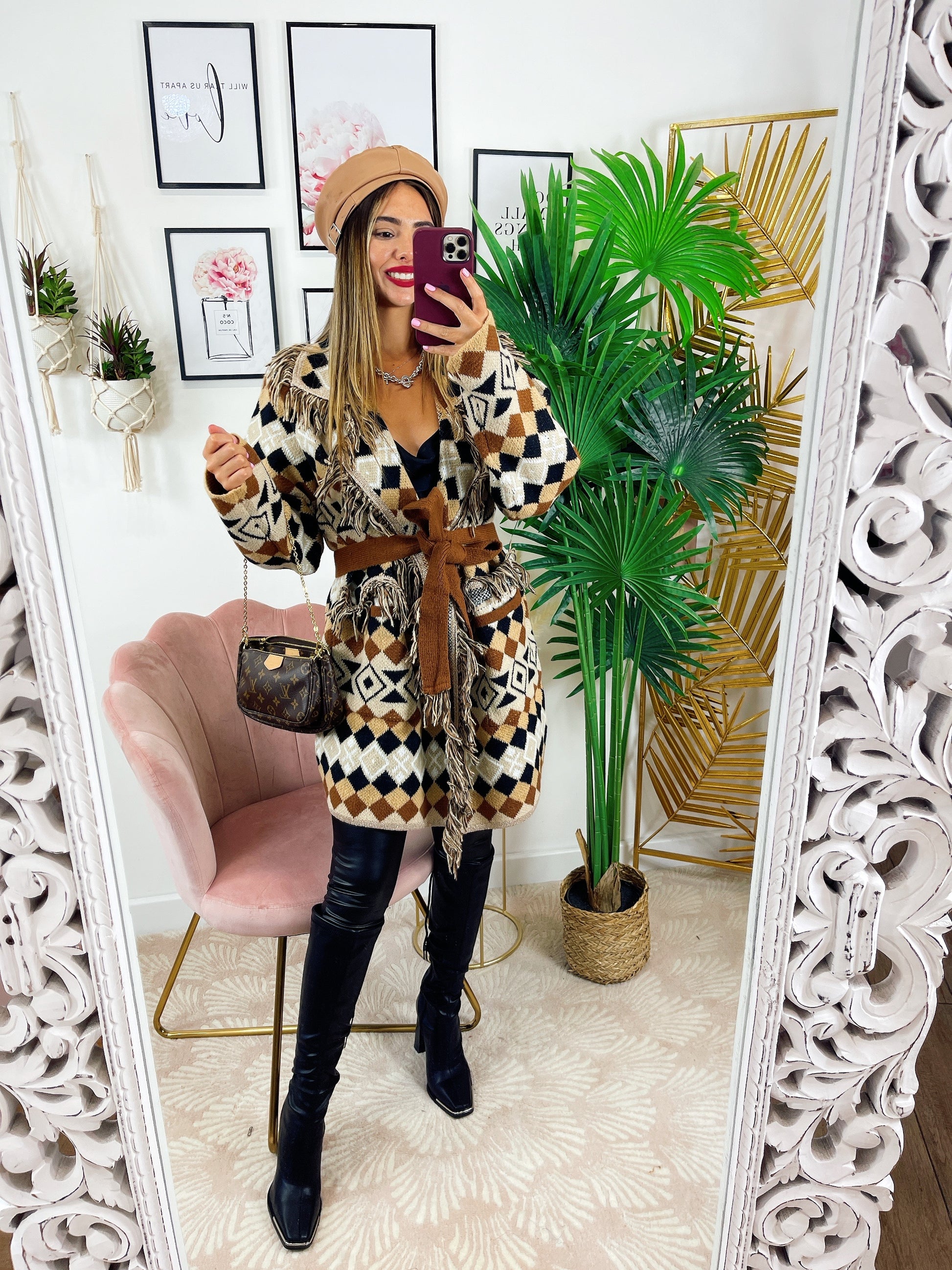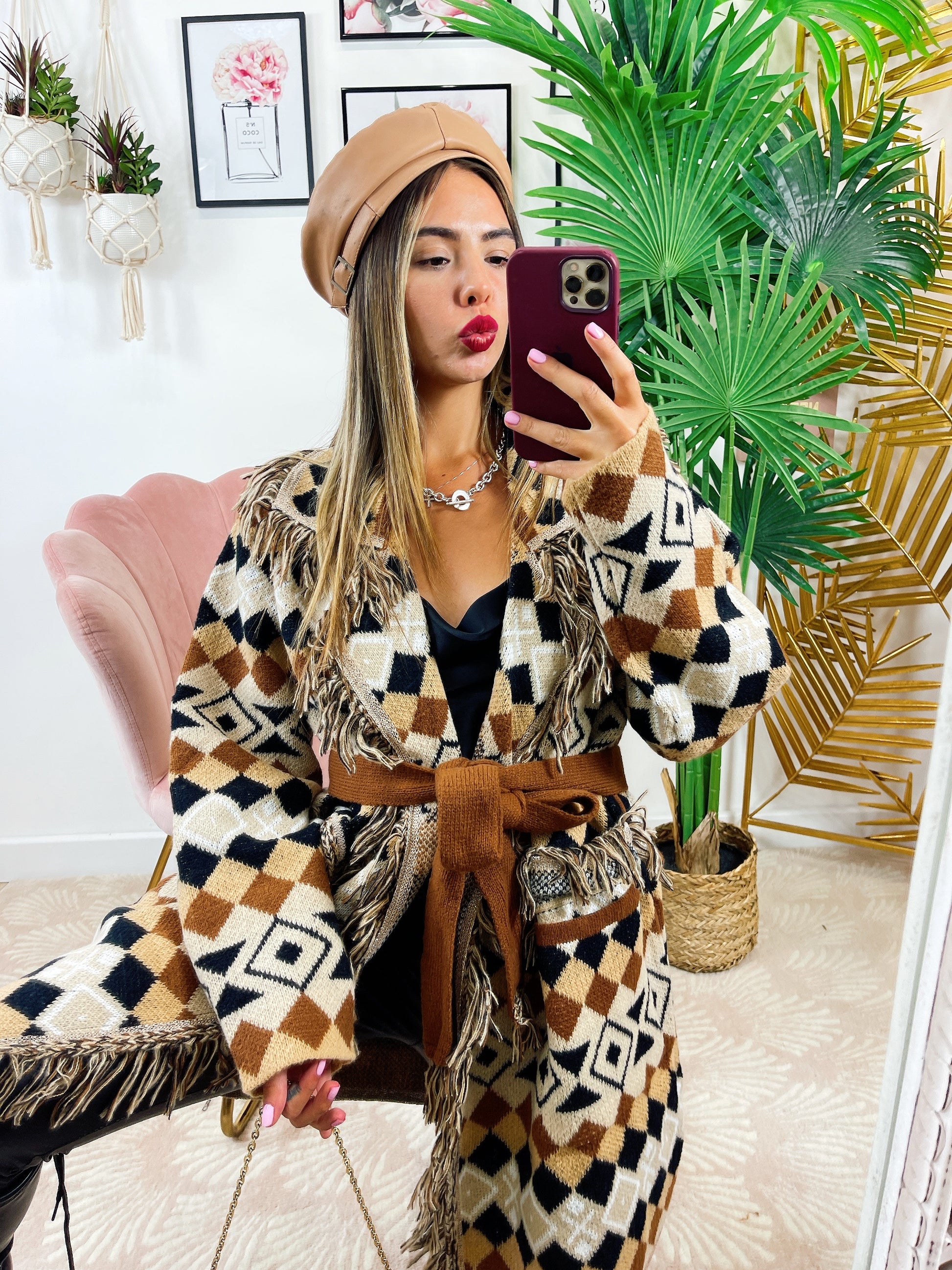 Kardigan ze średniej grubości materiału z frędzlami i paskiem w talii.