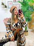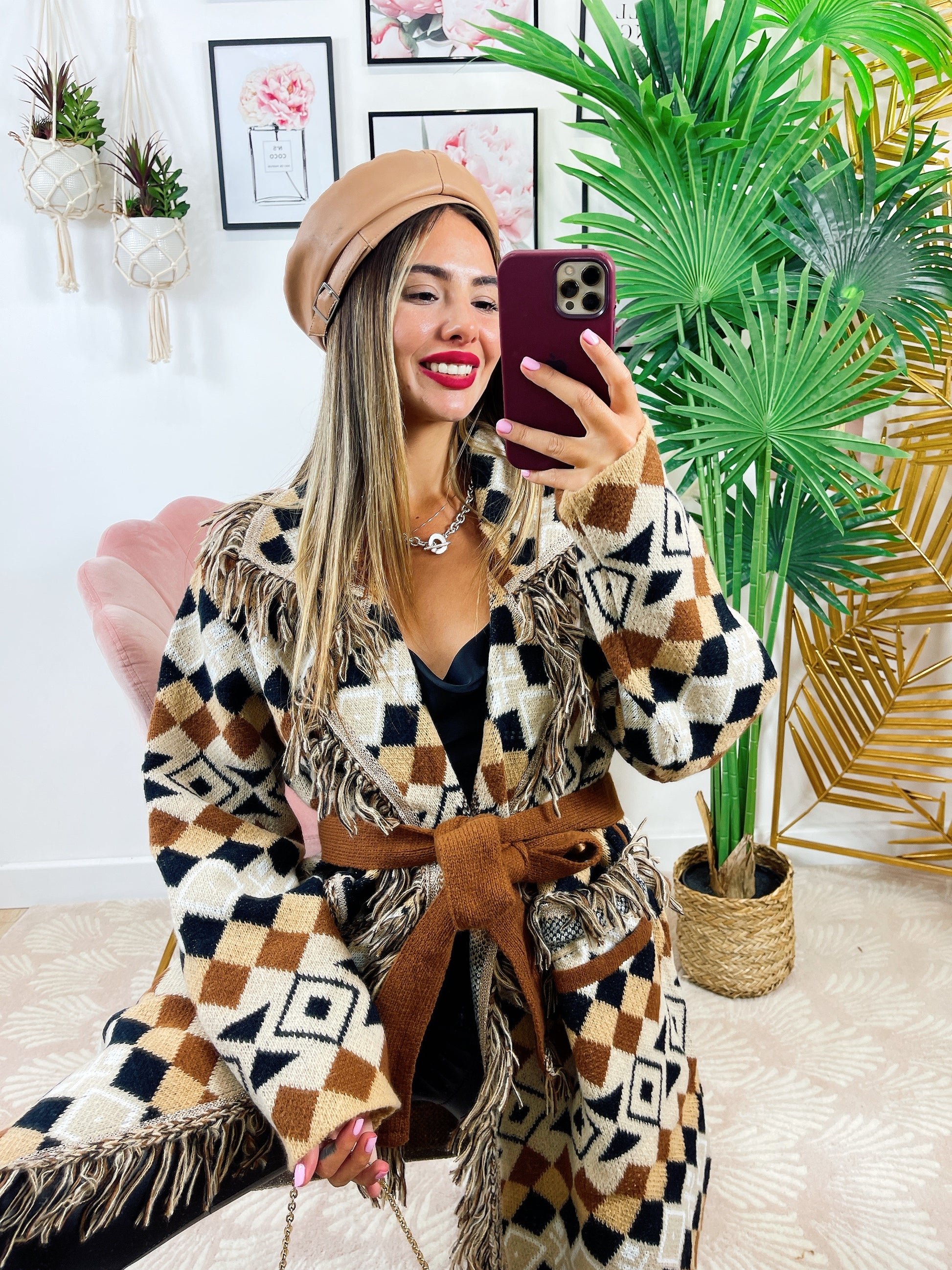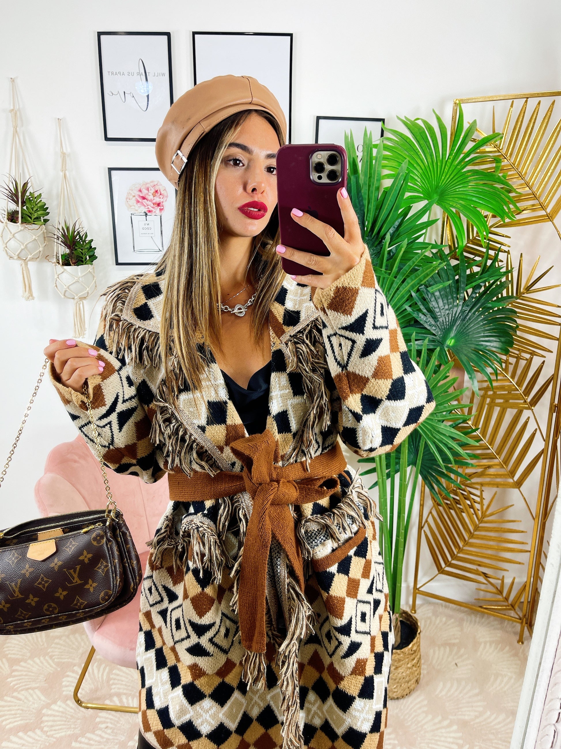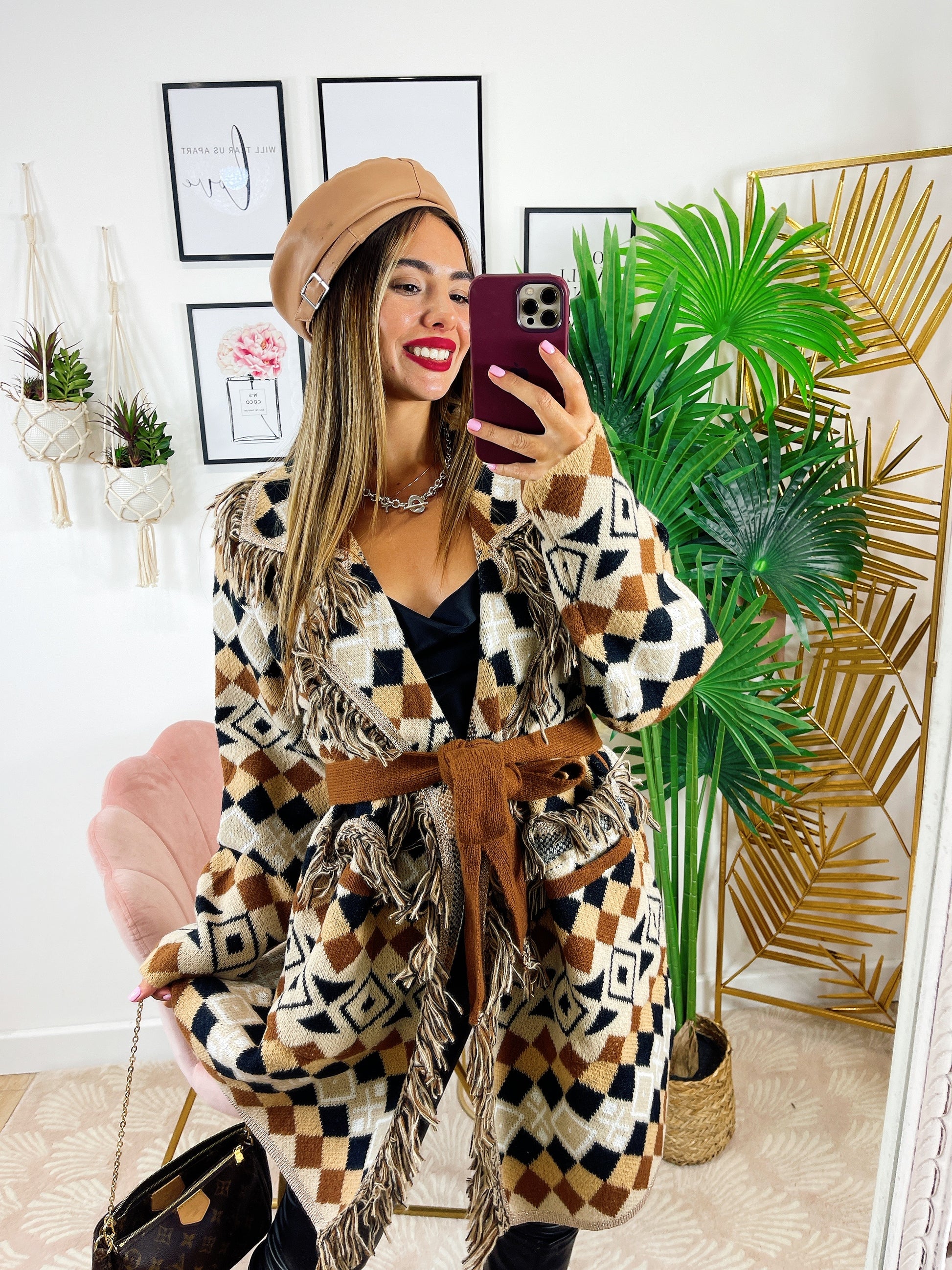 Kardigan ze średniej grubości materiału z frędzlami i paskiem w talii.