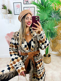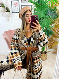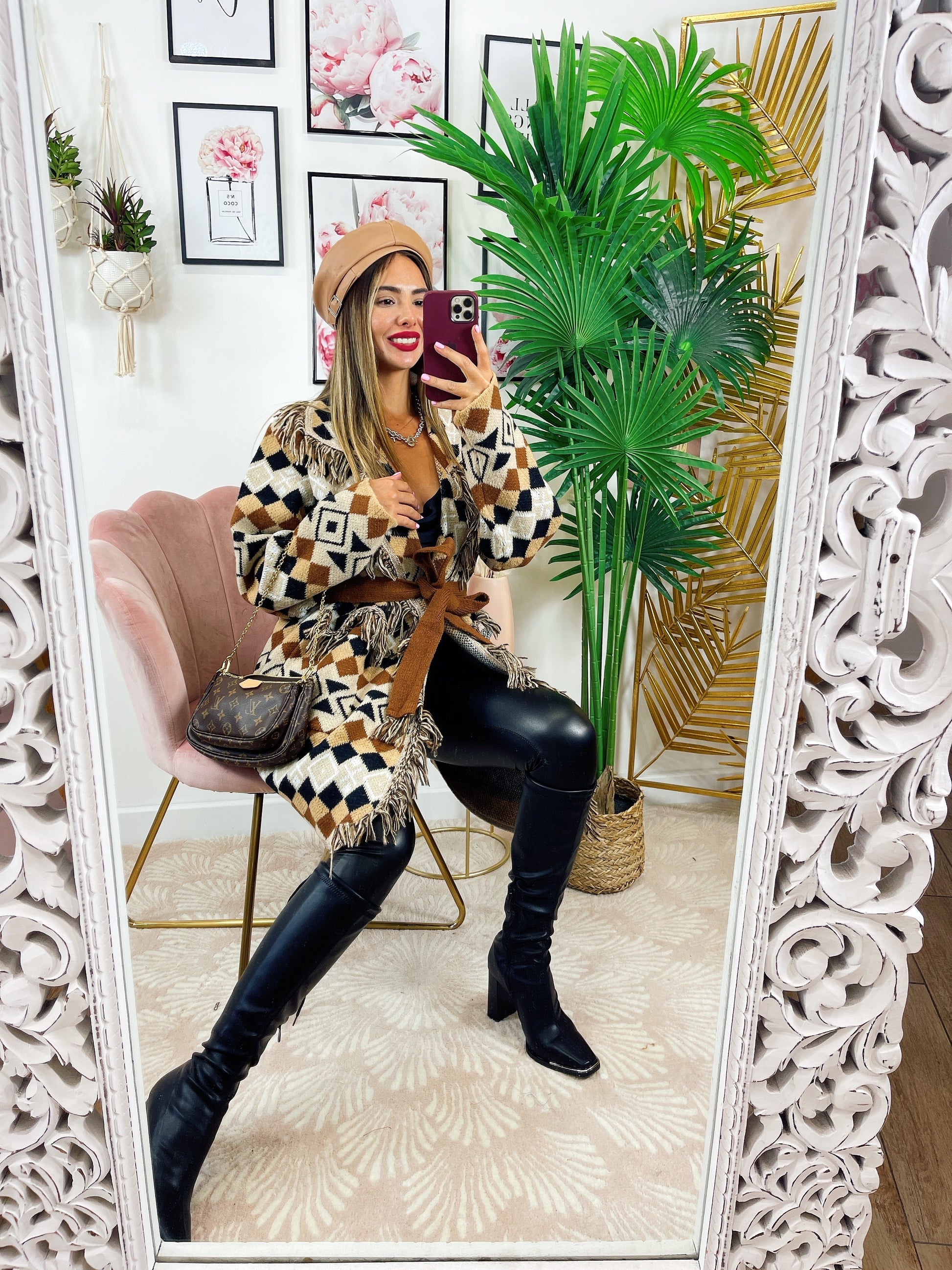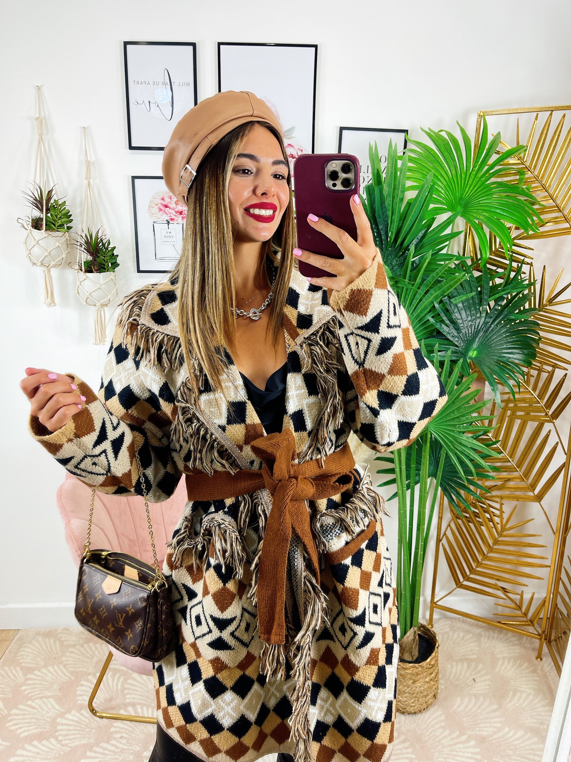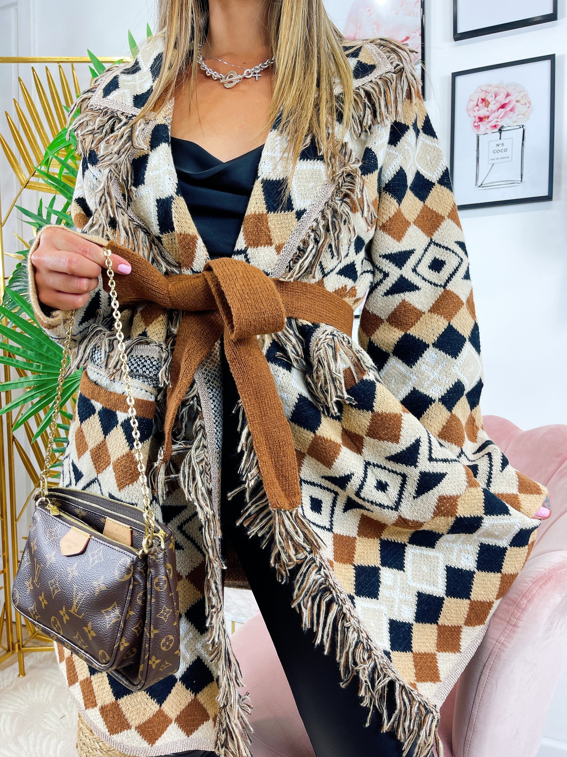 Długi kardigan z frędzlami i romby w delikatnych kolorach