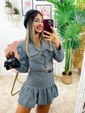 Komplet składający się z krótkiej kurtki i spódnicy z podszewką spodenek.