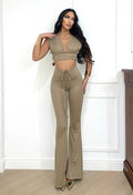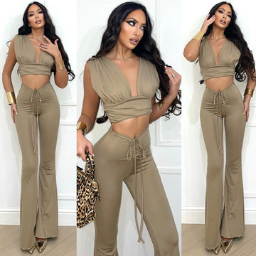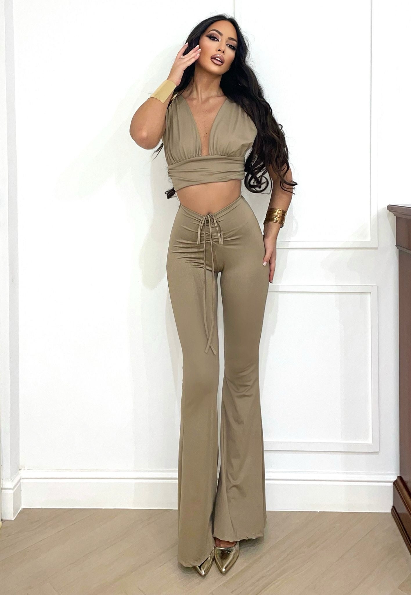 Completo in lycra due pezzi composto da top senza coppe e pantalone a zampa con arricciatura sul davanti regolabile