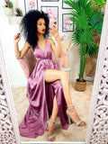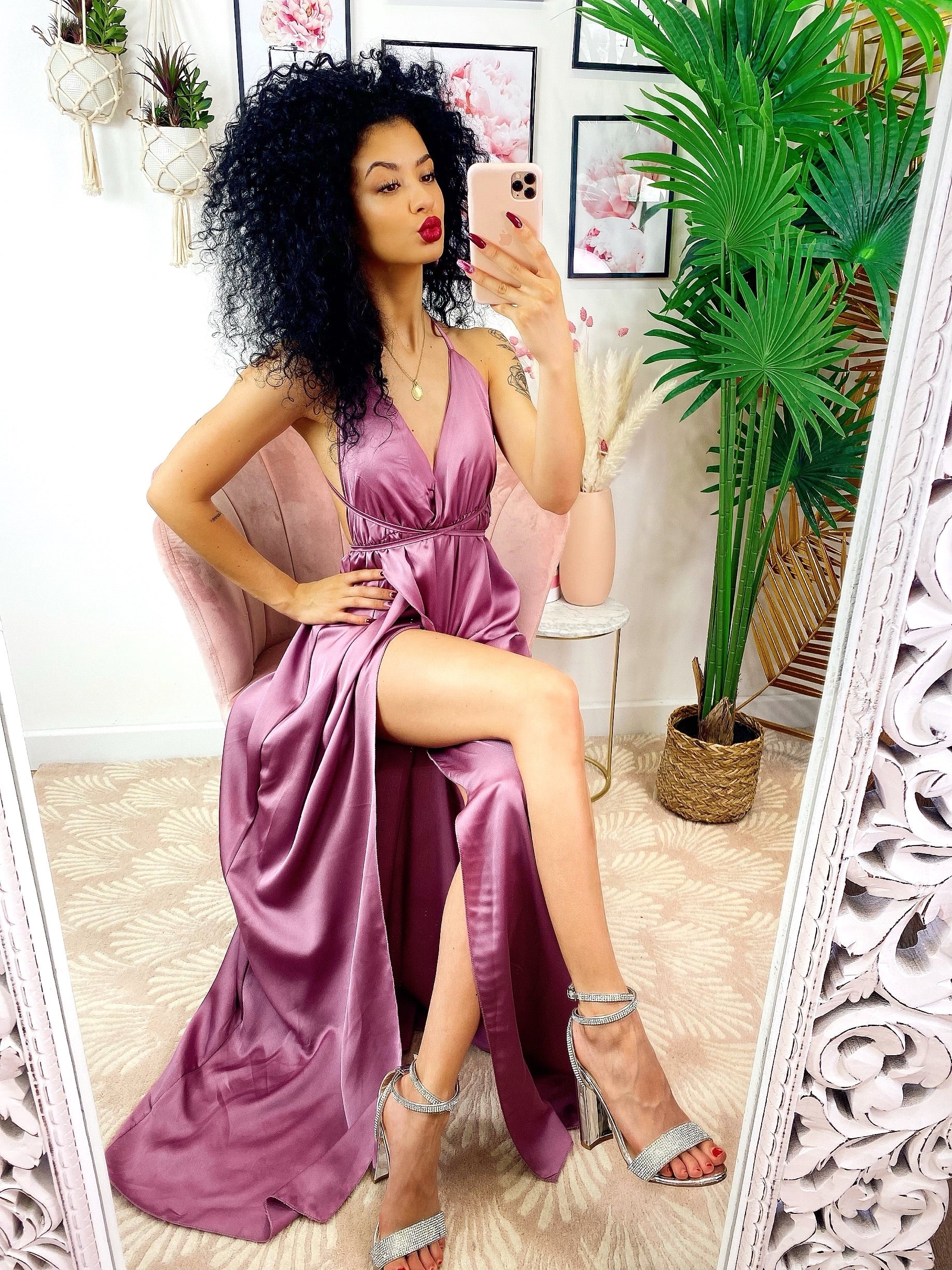 Sukienka Afrodyta, długa sukienka z rozcięciem maxi. Z miseczkami iz możliwością różnych sposobów krzyżowania: X za plecami lub tylko wokół szyi. W satynie.