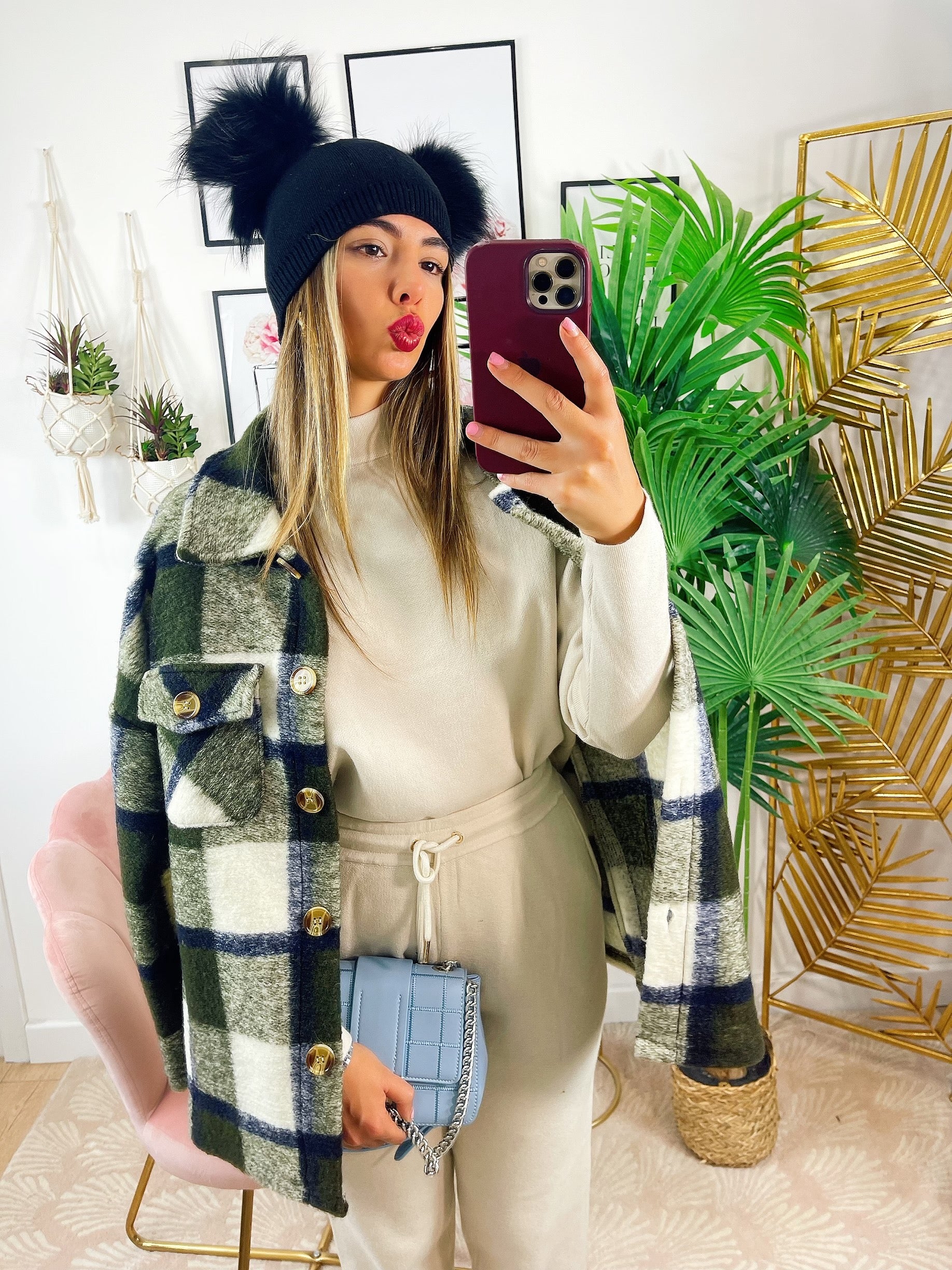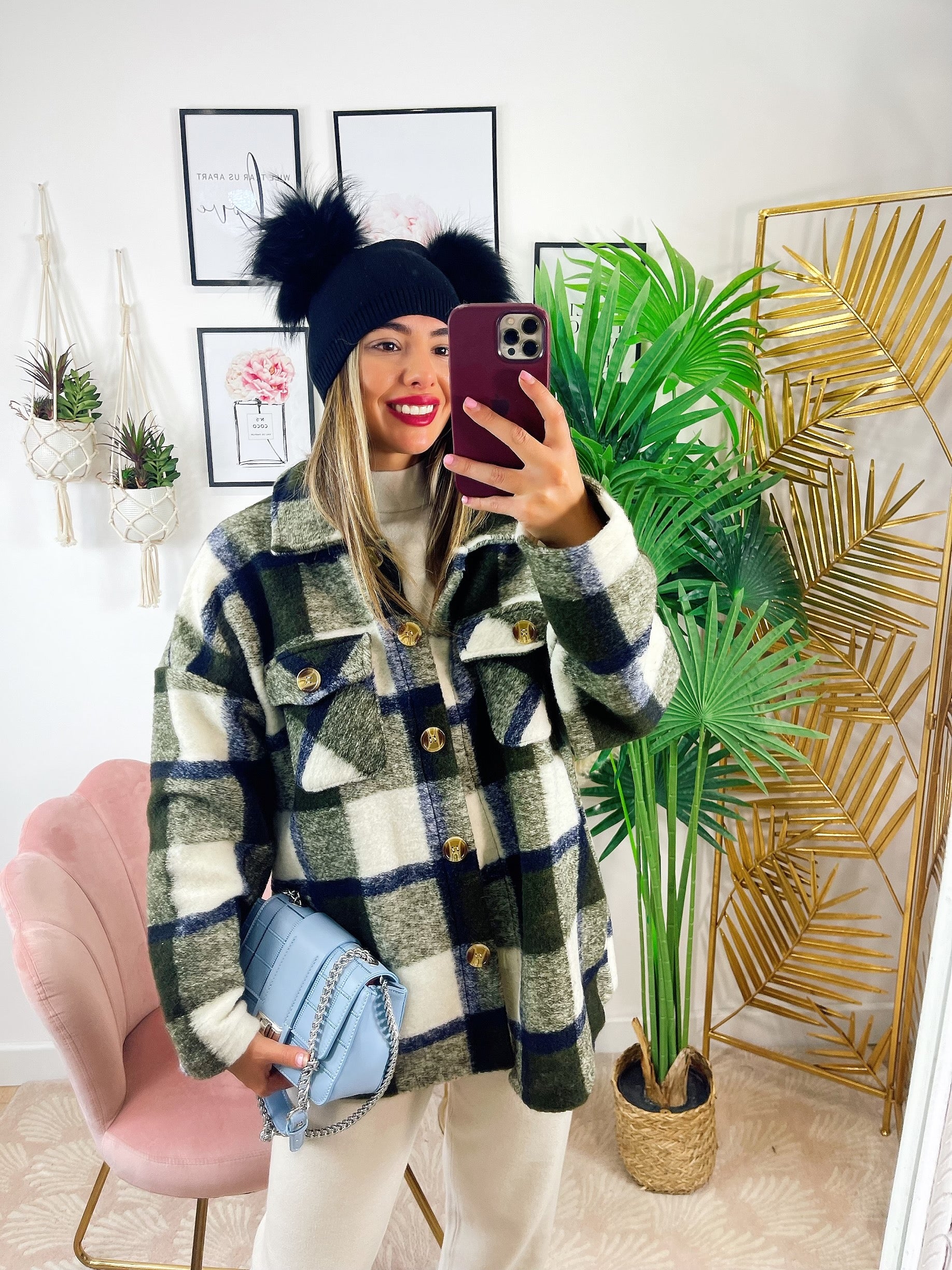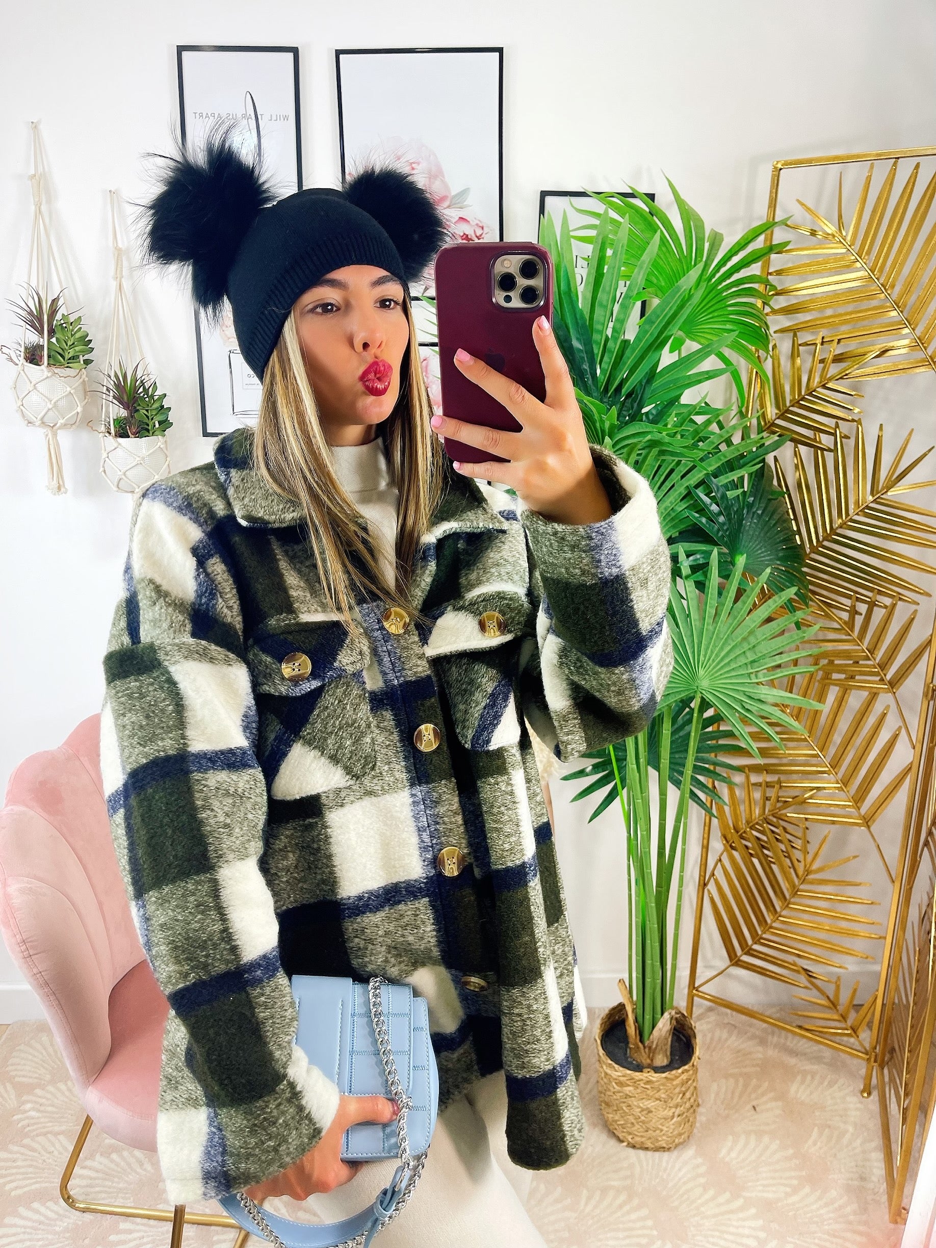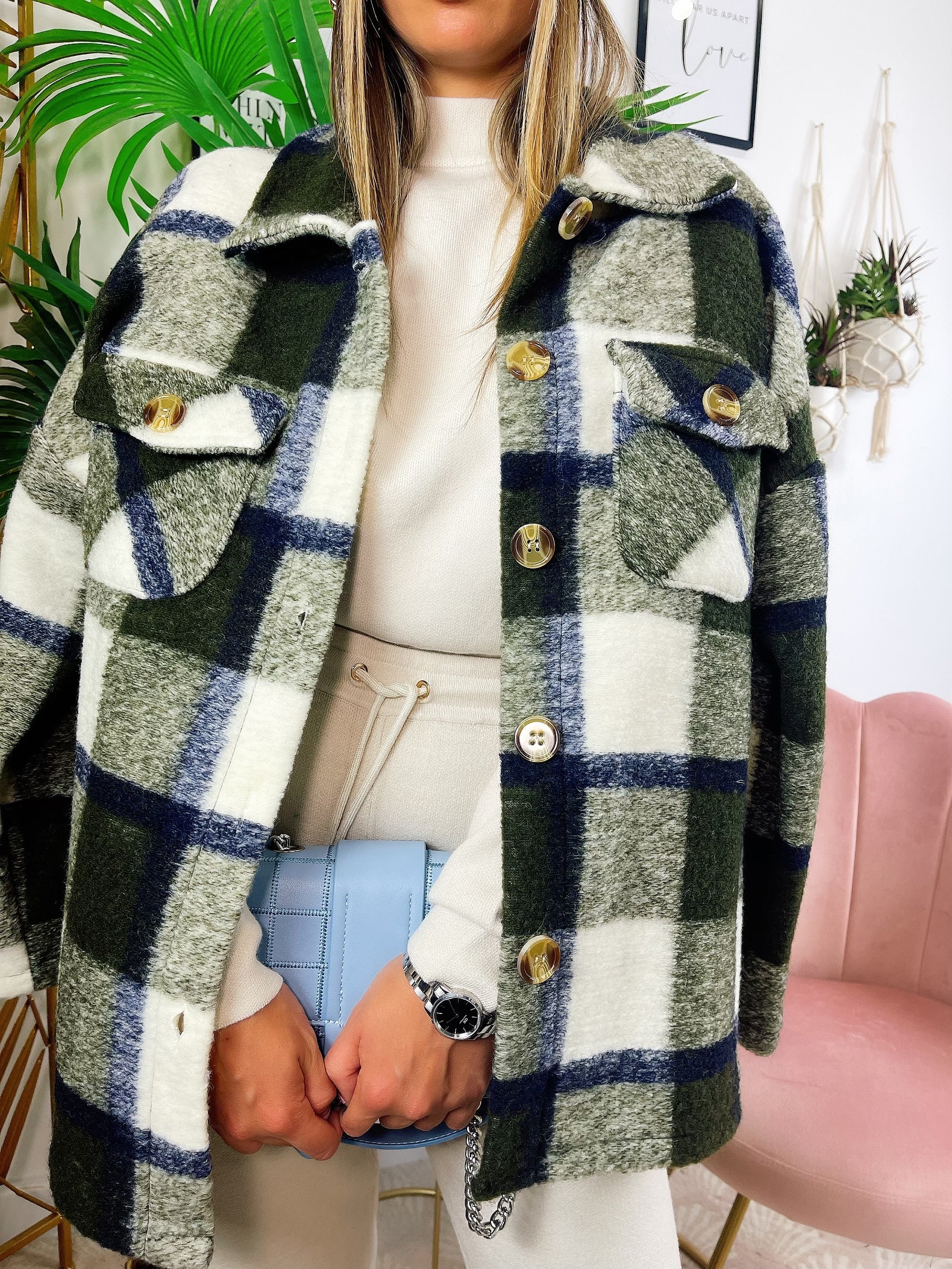 Kurtka w militarną zieloną kratę z niebieskimi detalami