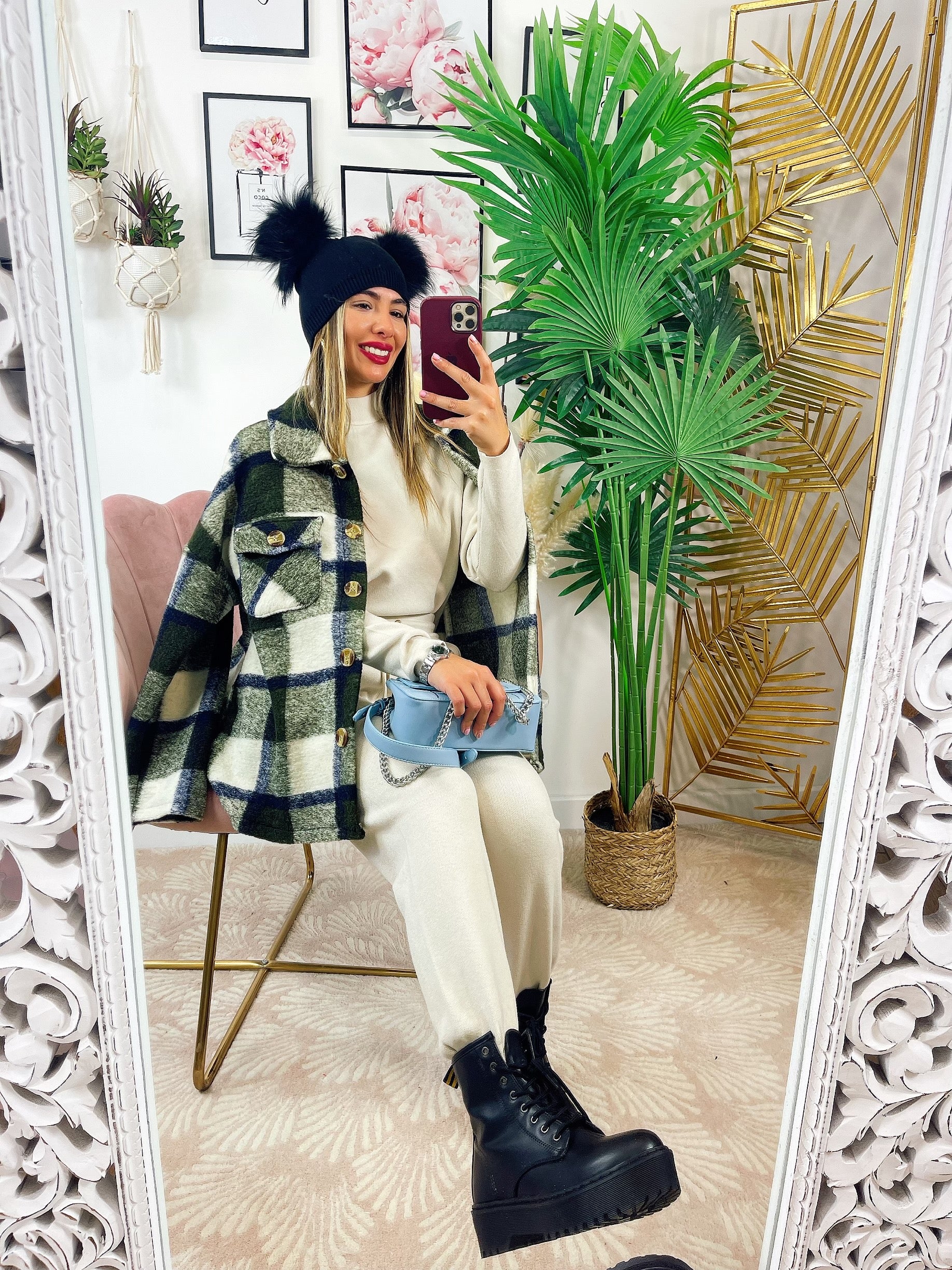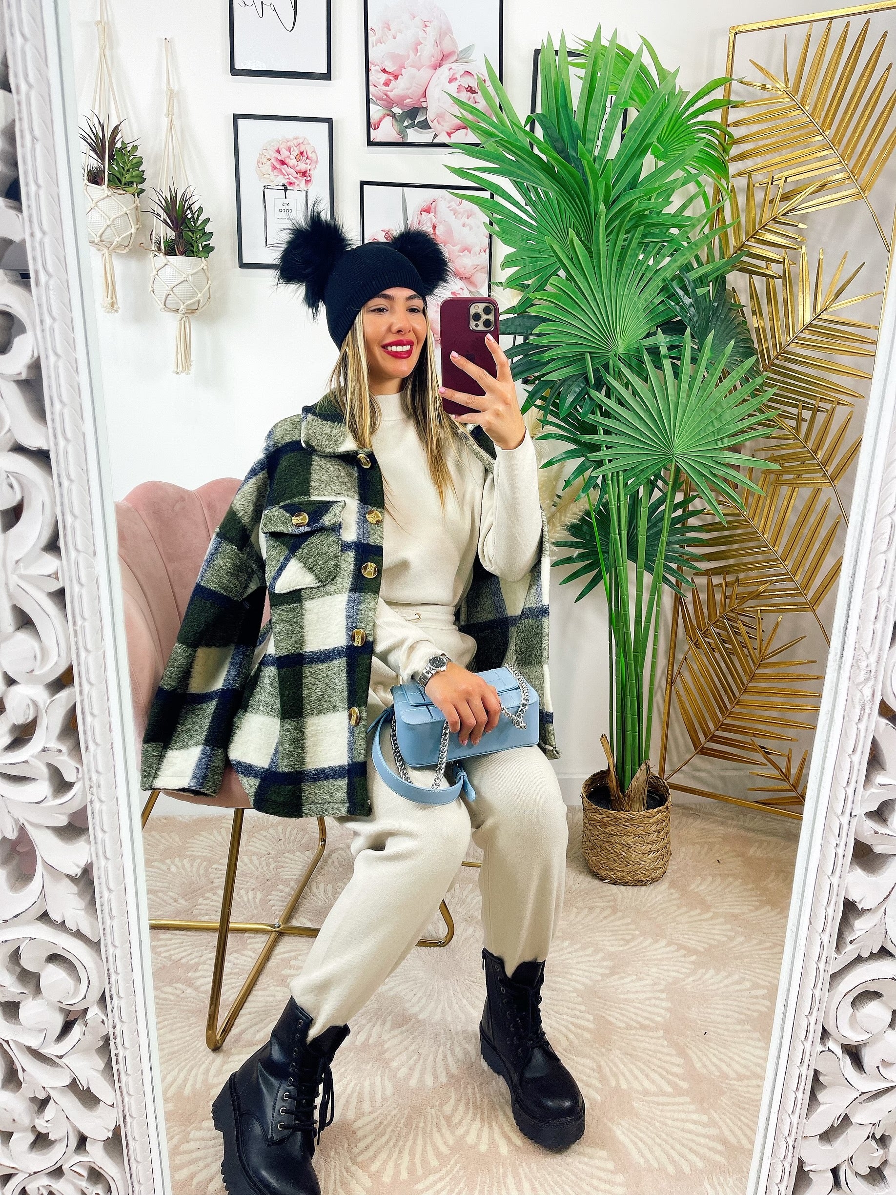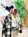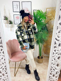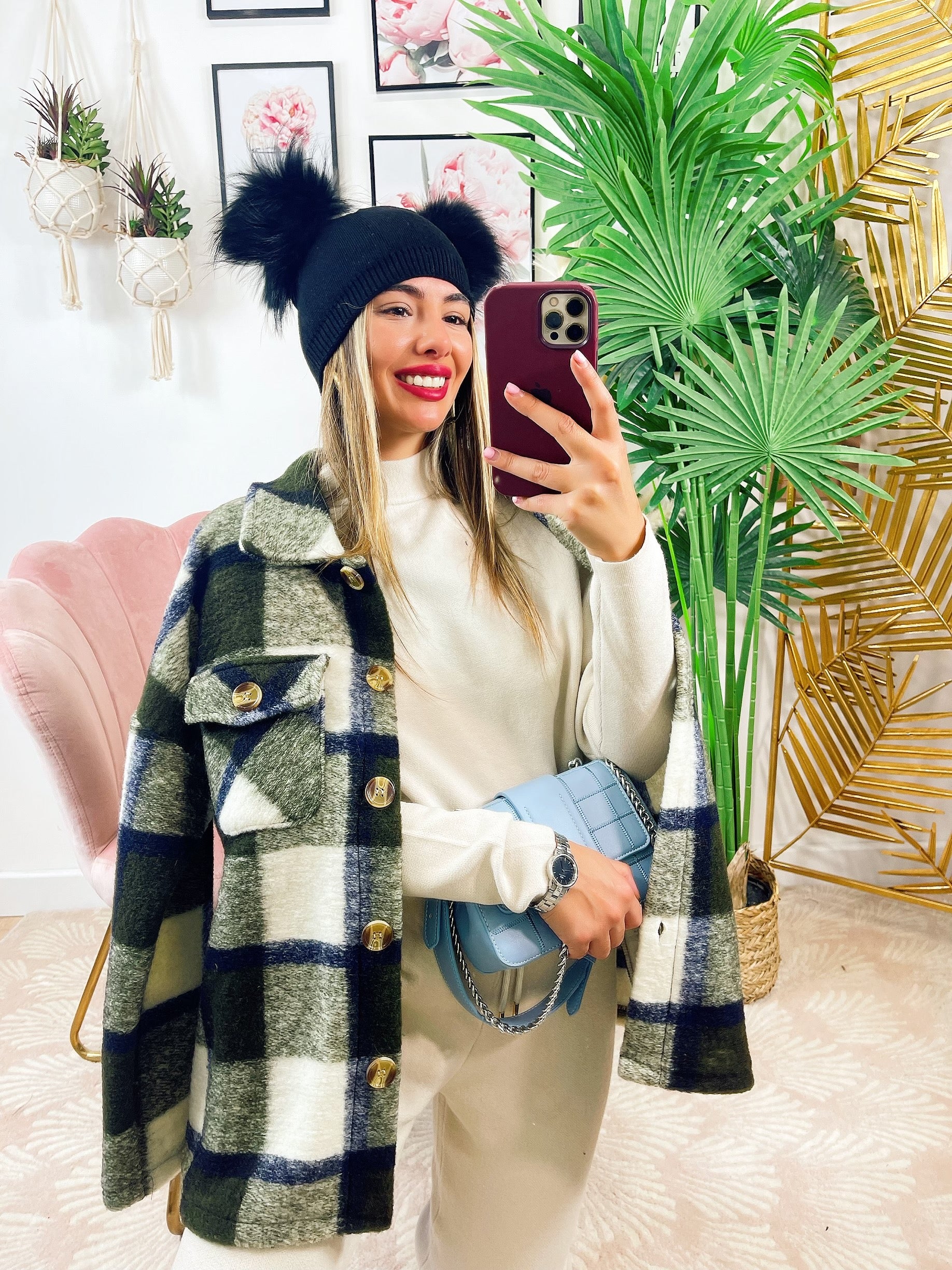 Kurtka w militarną zieloną kratę z niebieskimi detalami