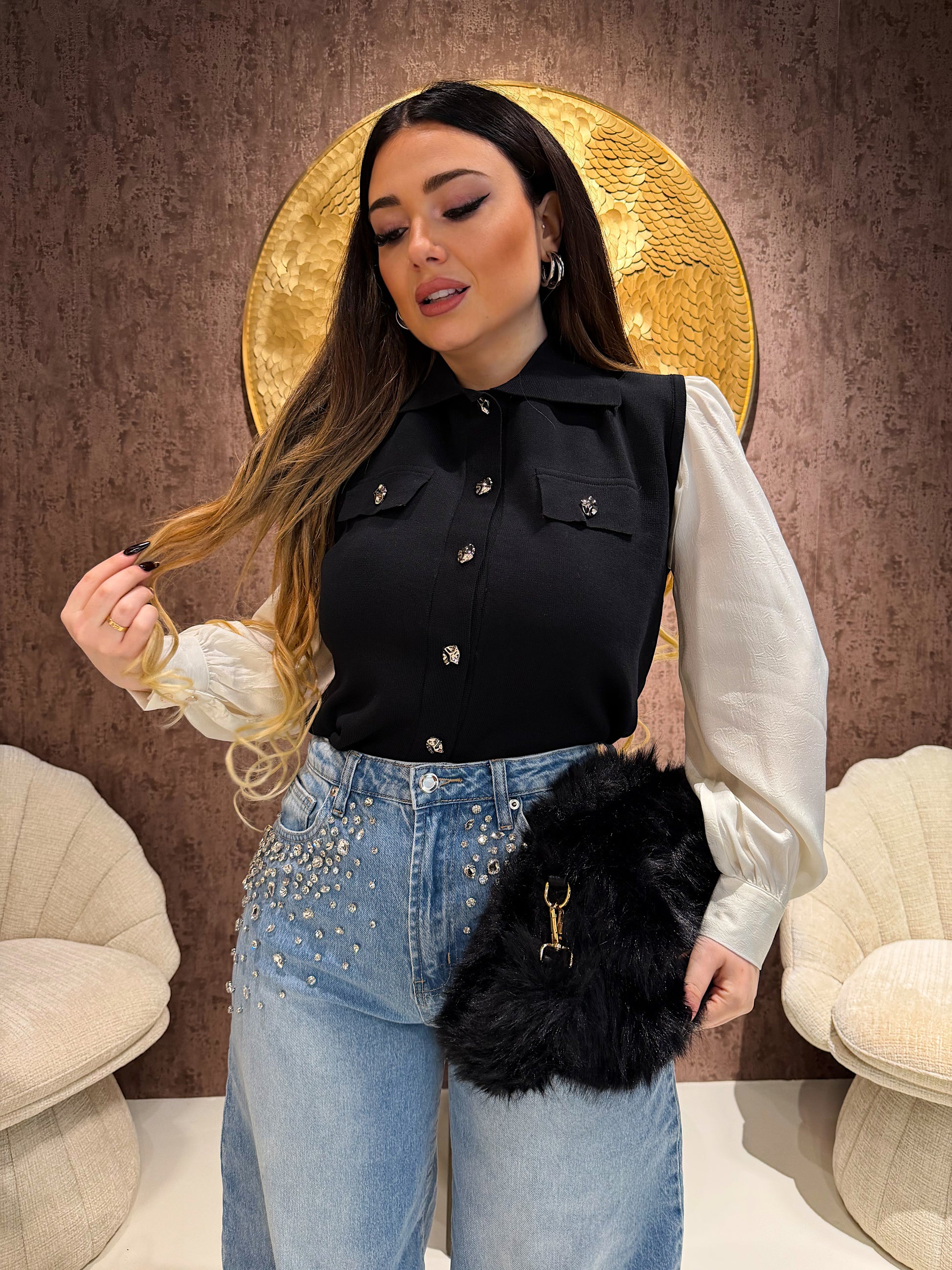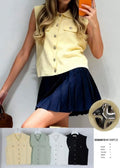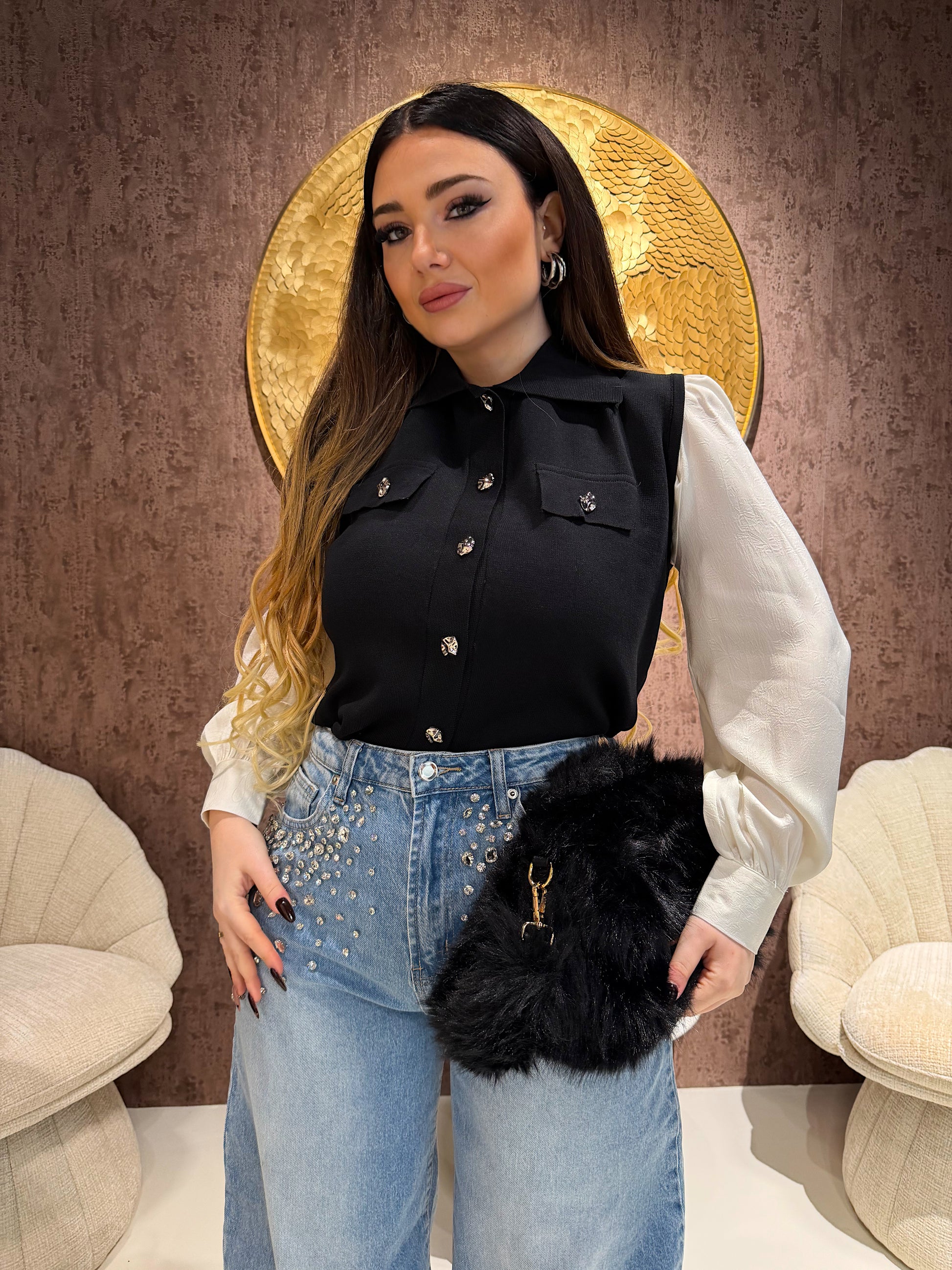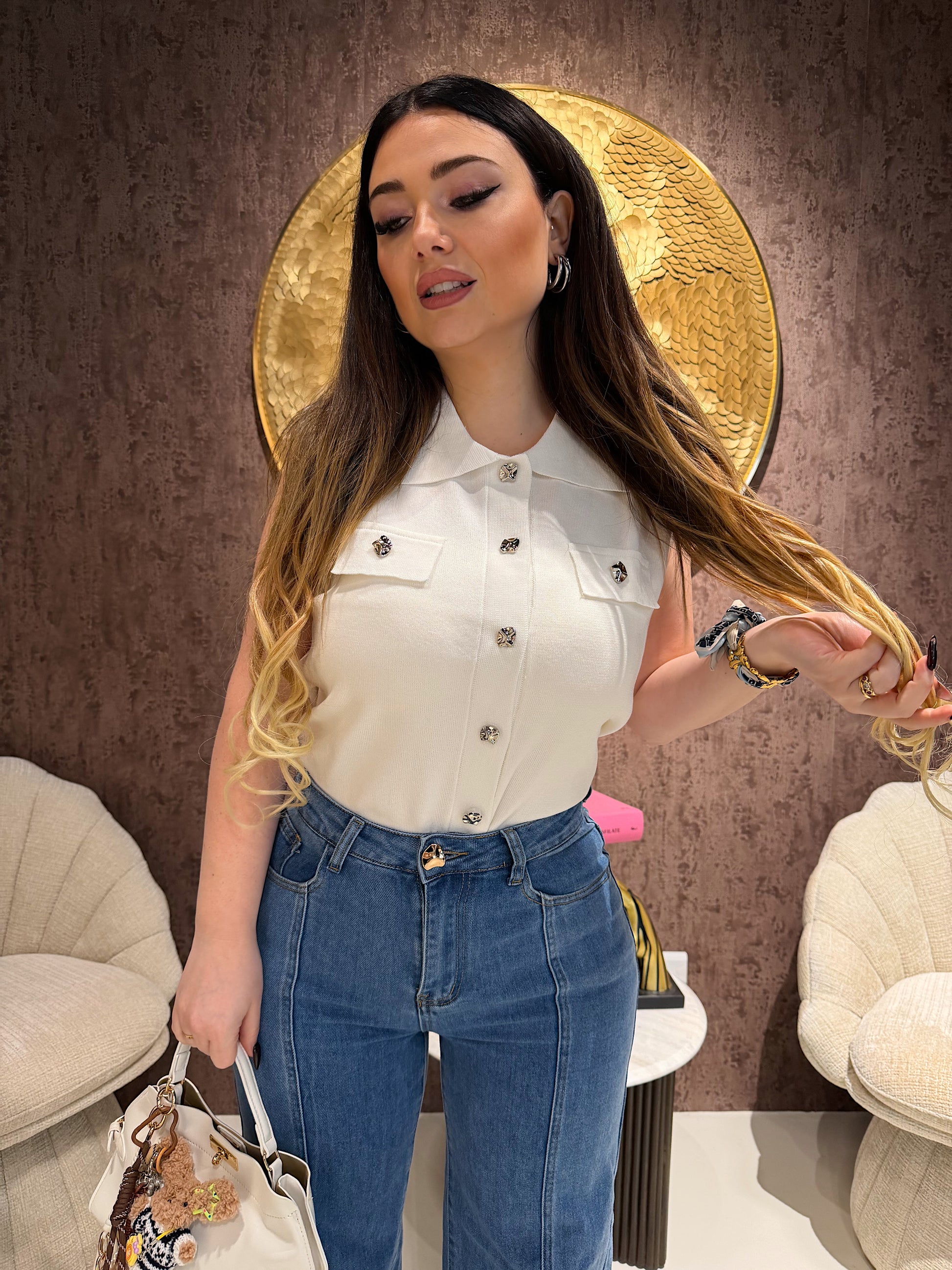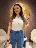 Il modello senza maniche valorizza le spalle e slancia la figura, mentre i bottoni gioiello donano un tocco luminoso e sofisticato. Perfetta sia per outfit casual che per look più eleganti.