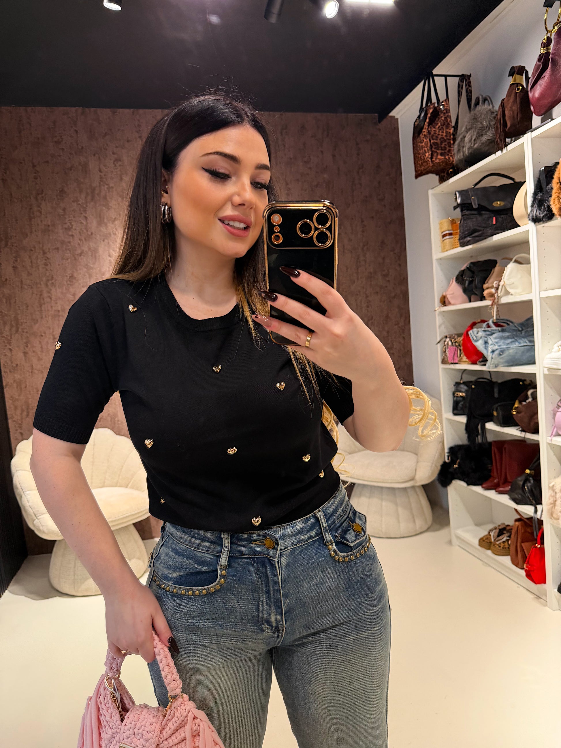 Maglia in maglia morbida dal design romantico e femminile, impreziosito da applicazioni a cuore dorate distribuite su tutta la superficie, che donano luce e un tocco prezioso al capo.