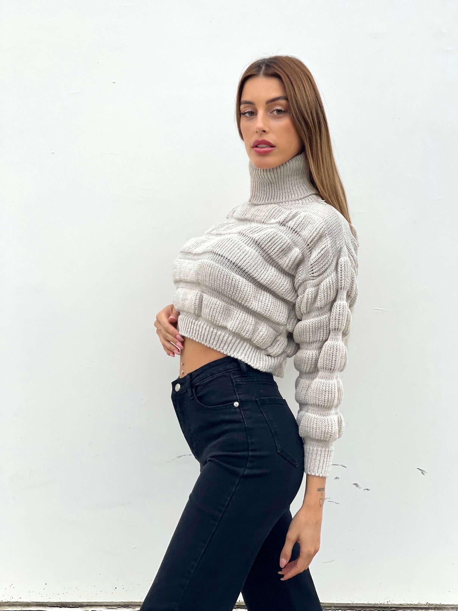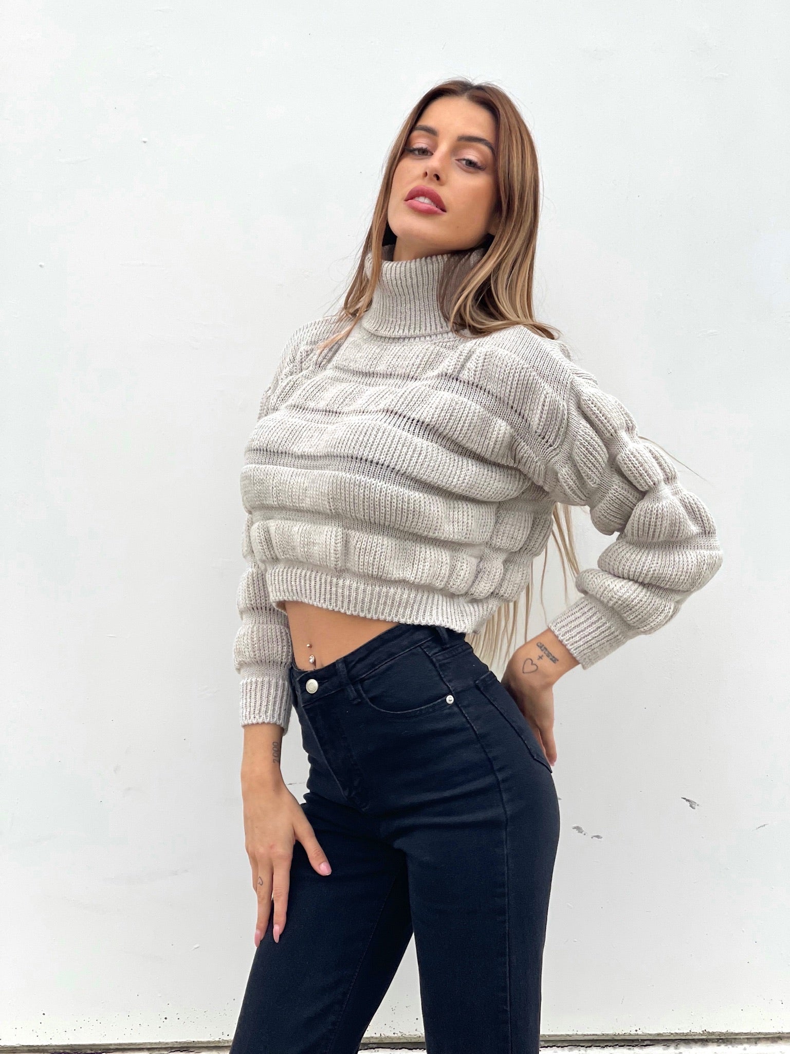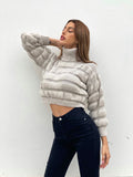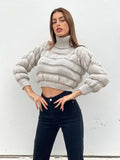 Sweter z zabudowanym dekoltem o szczególnej fakturze. Jeden rozmiar pasuje do wszystkich rozciągliwych materiałów