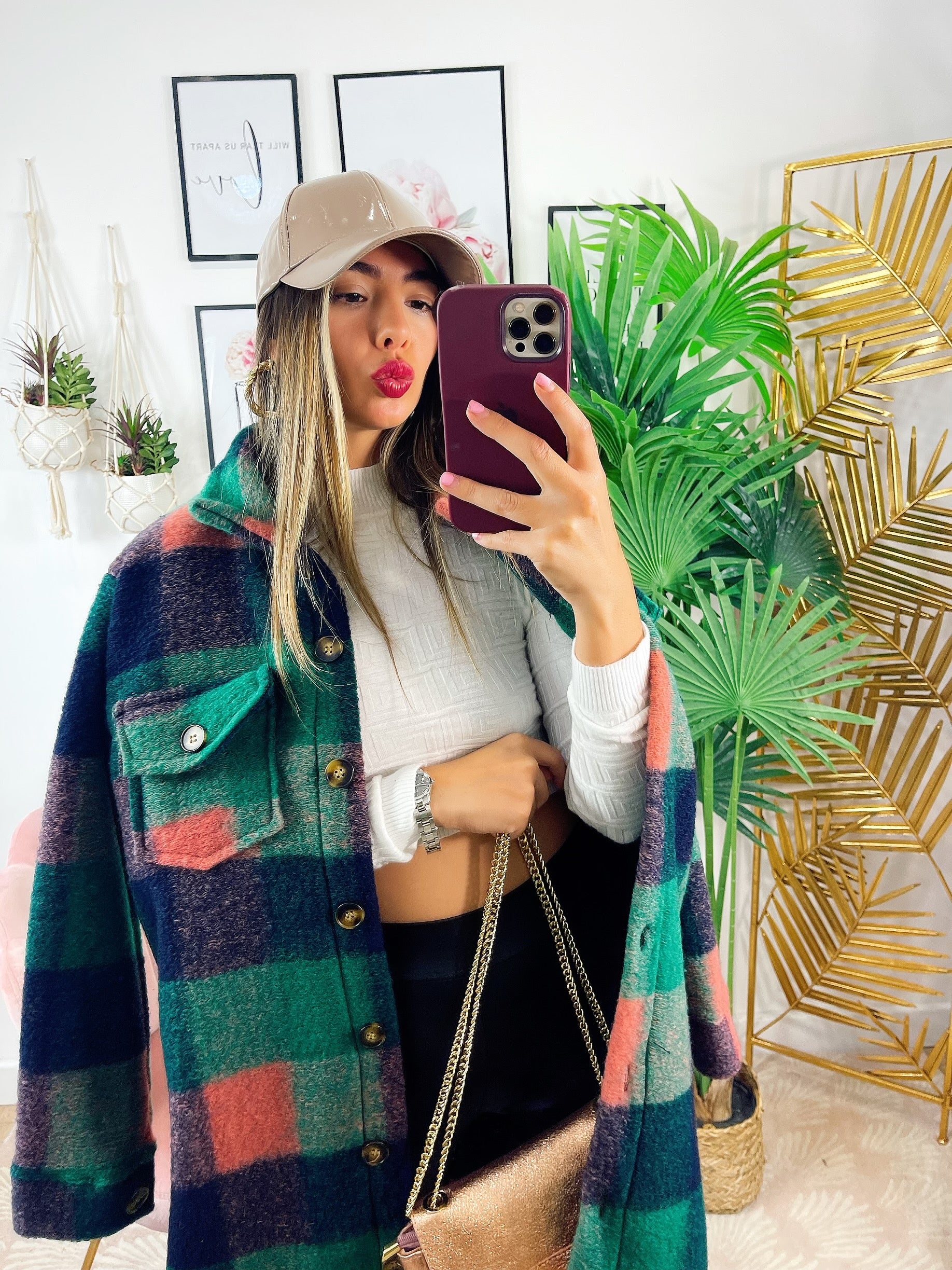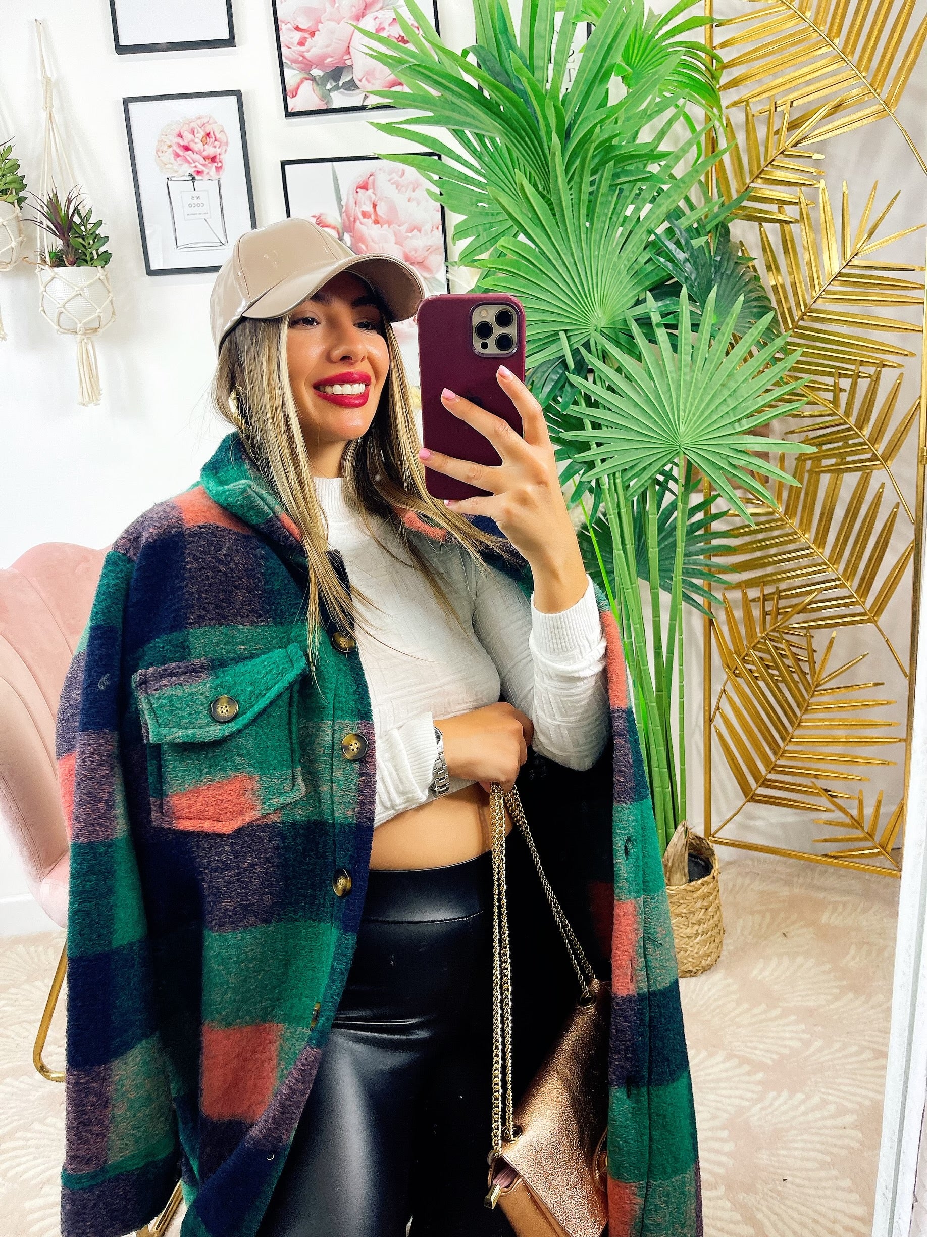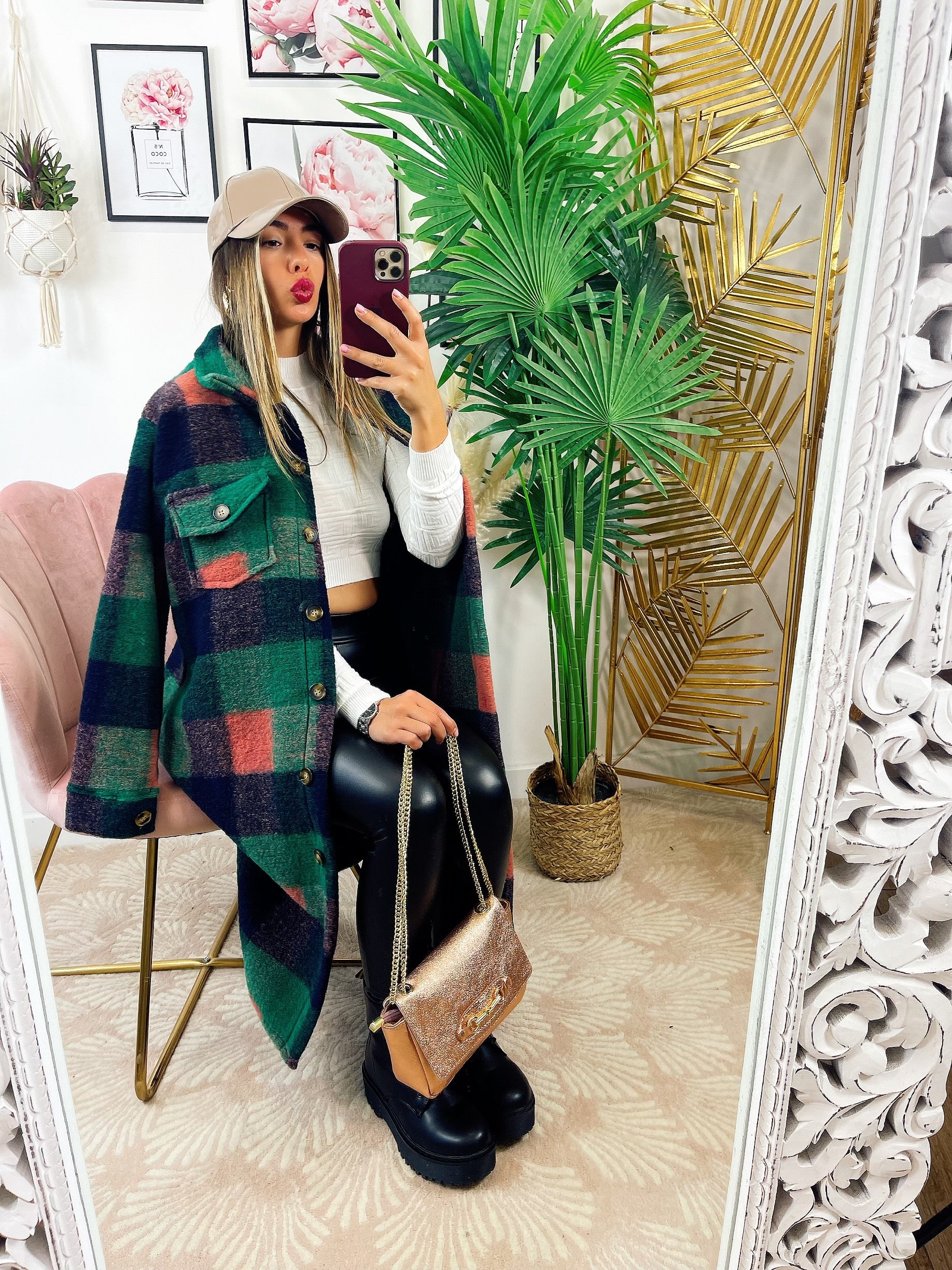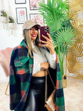 Koszula maxi w kratę z długim zielonym detalem