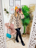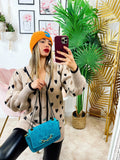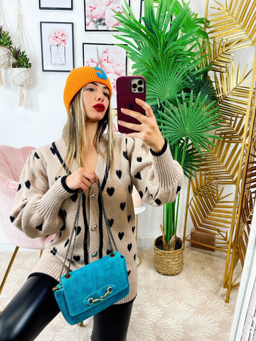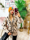 Sweter maxi w kolorze camelowym z serduszkami i biżuteryjnymi guzikami. Może służyć również jako sukienka mini
