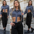 Pantalone in jeans cargo con taschoni. Chiusura con zip e bottone . Altezza modella 1,80 il pantalone non è così corto
