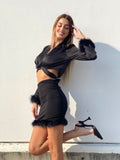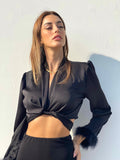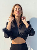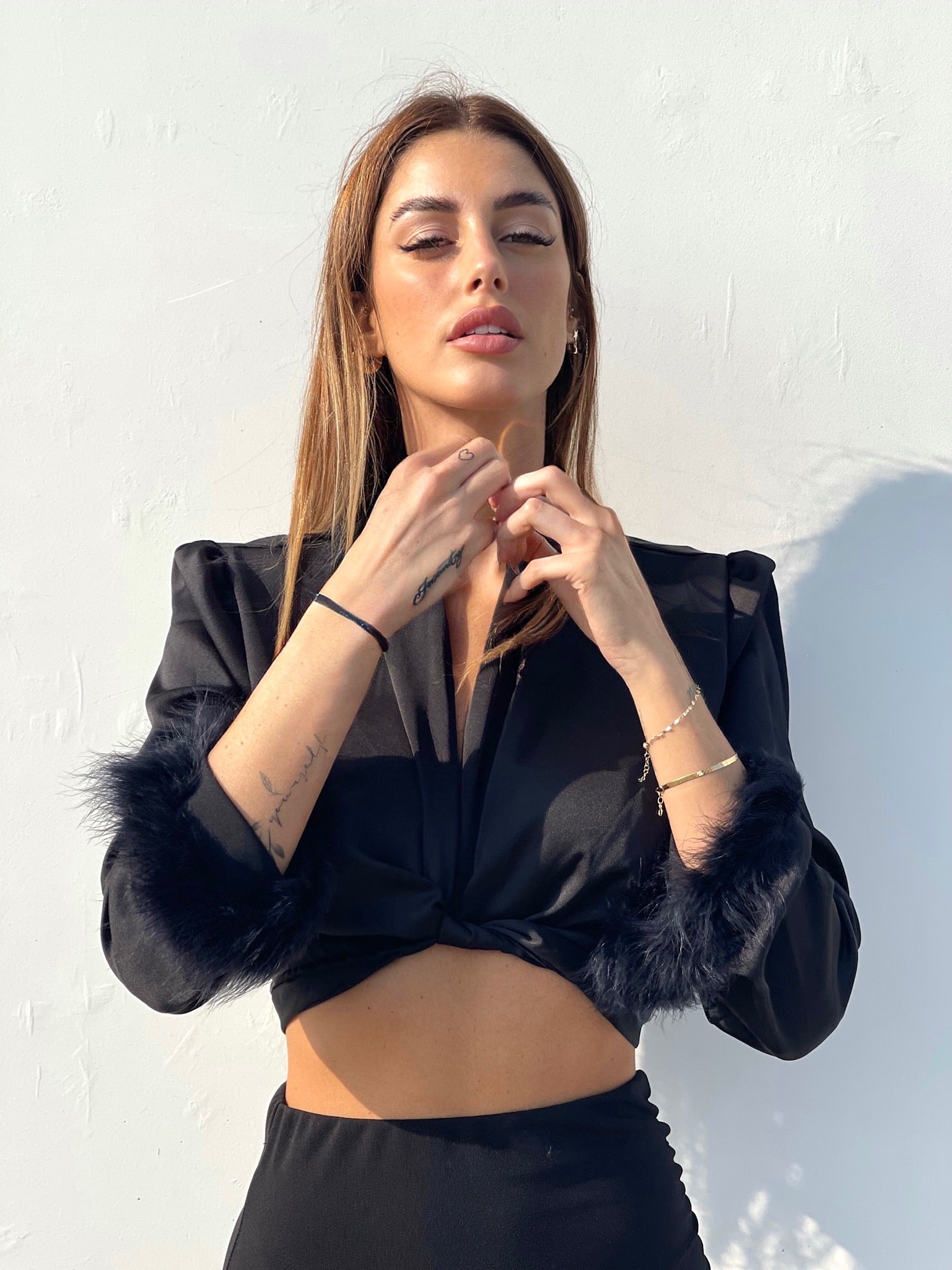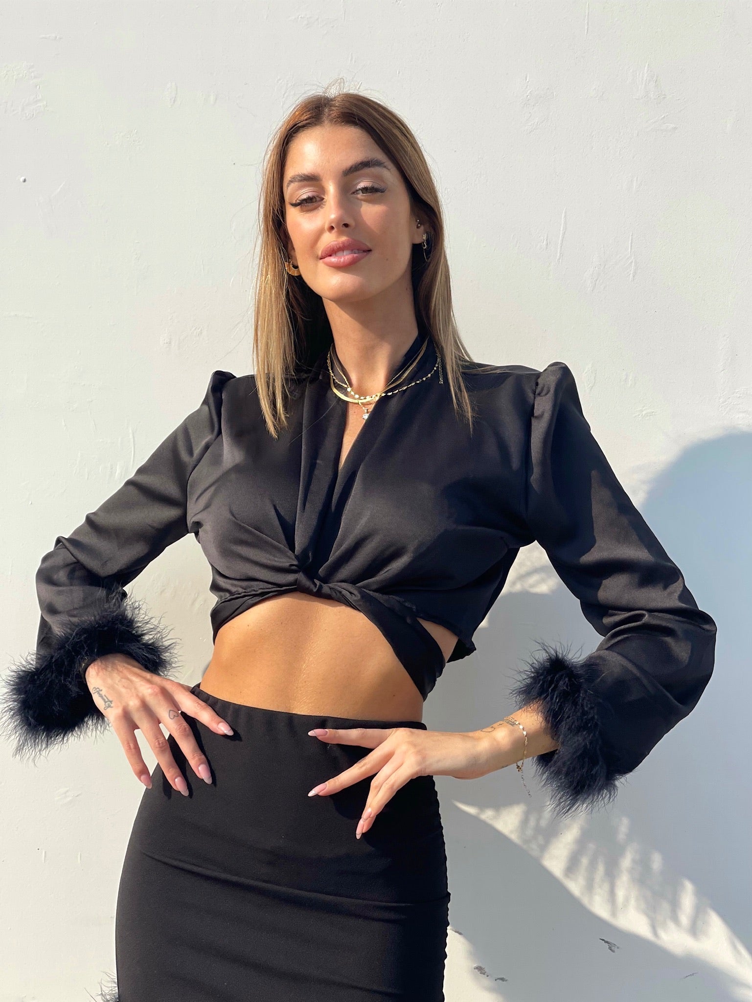 Czarny satynowy top z węzłem z przodu. Pióra na brzegu rękawów w kolorze tonacji