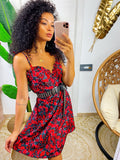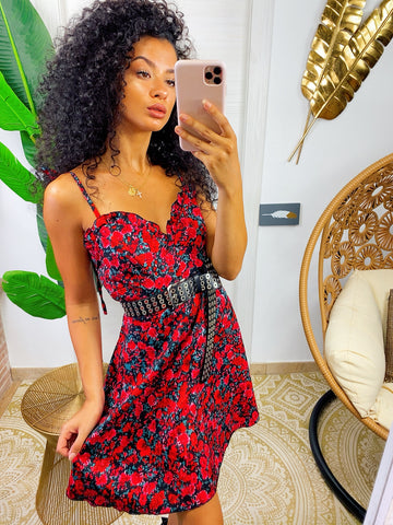 Abito a fiori con bretelline, stampa colorata e fresca. Tessuto rigido pesante.