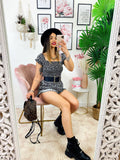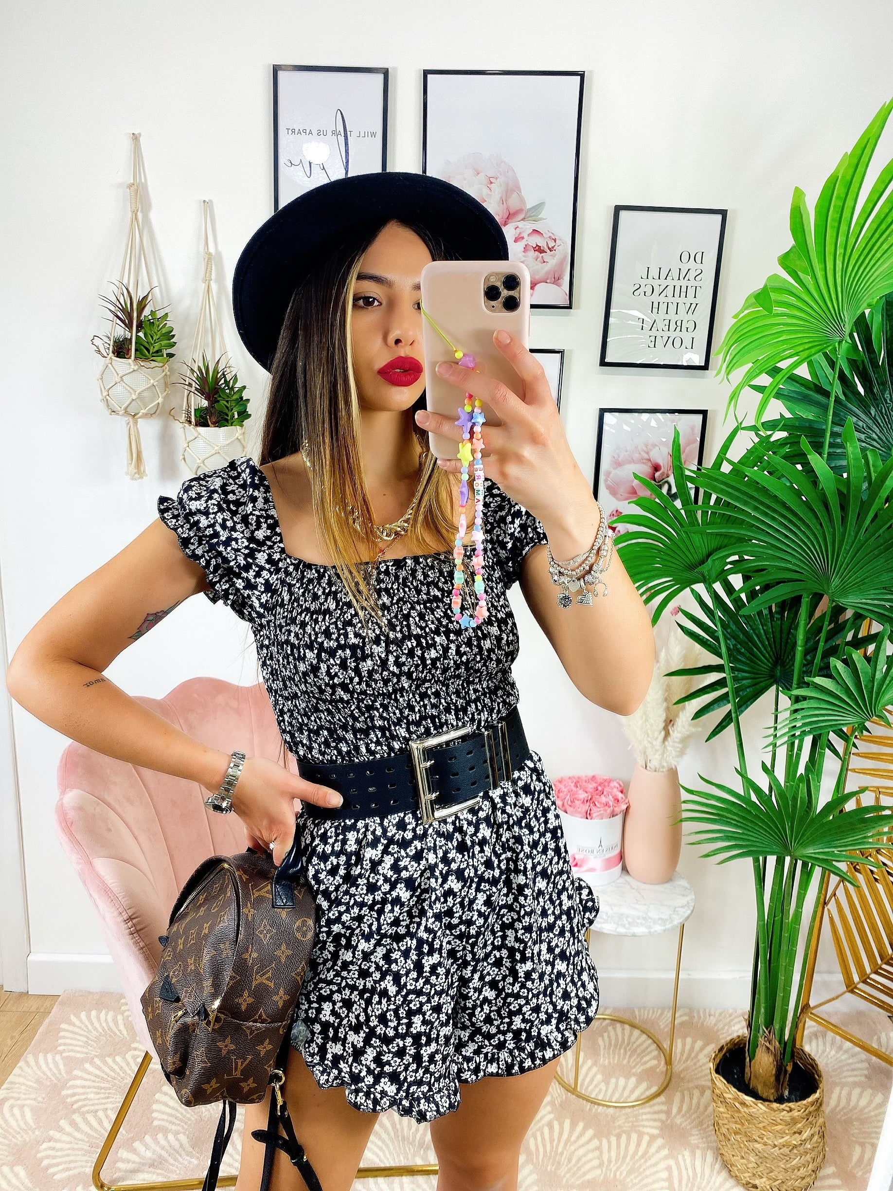 Tutina a fiorellini base nera Con scollo a barchetta, aderente al seno.