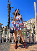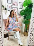 Abito a manica a giro primaverile con stampa , cintura in vita e schiena aperta.