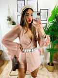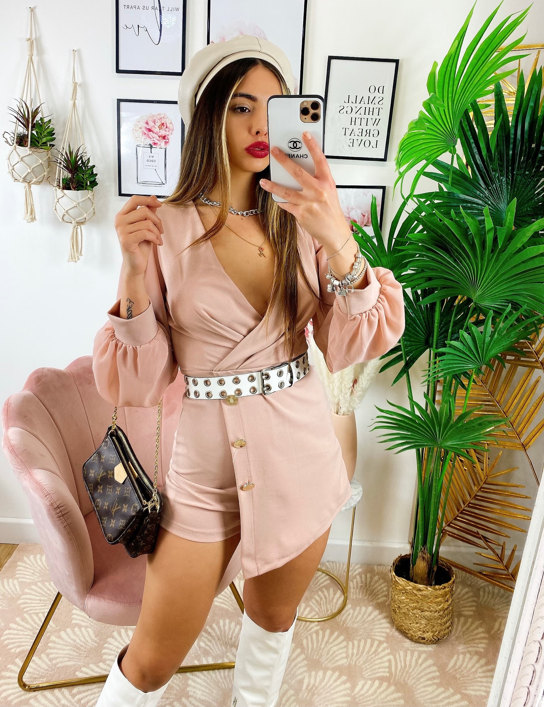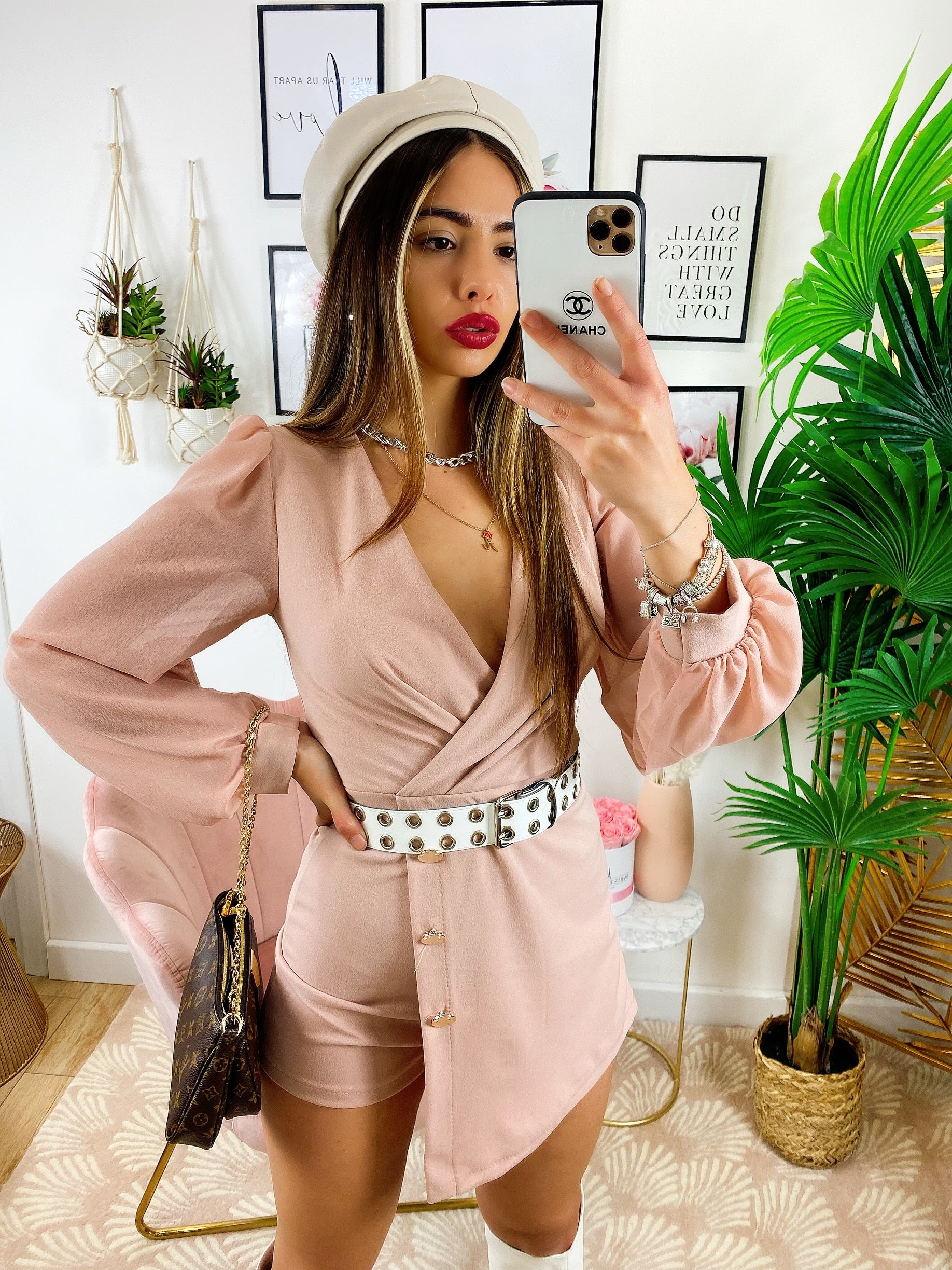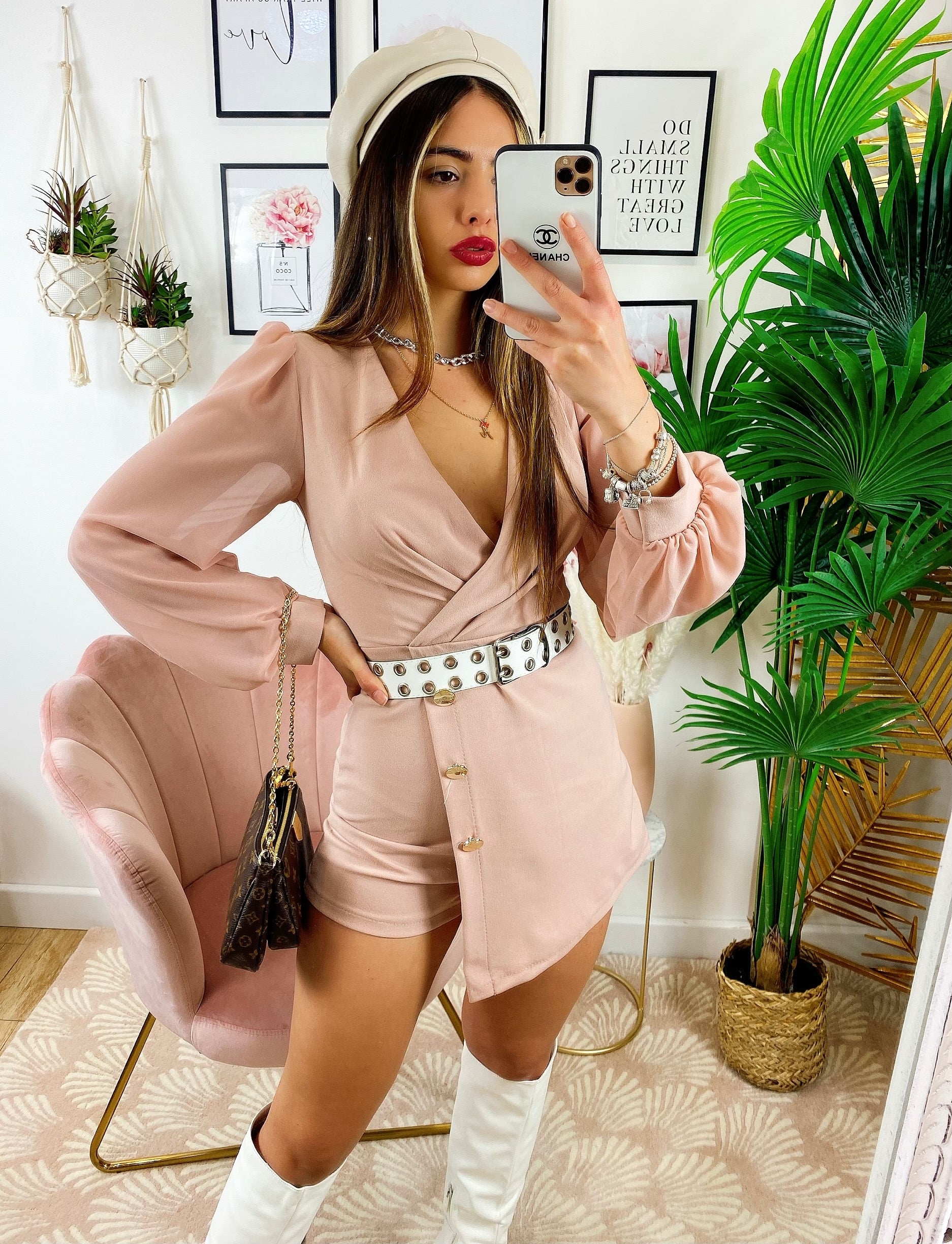 Tutina con chiusura a portafoglio, con coppe bottoni carta da zucchero. Polsino chiuso e chiusura con zip