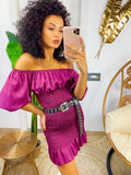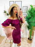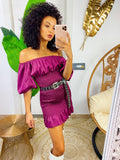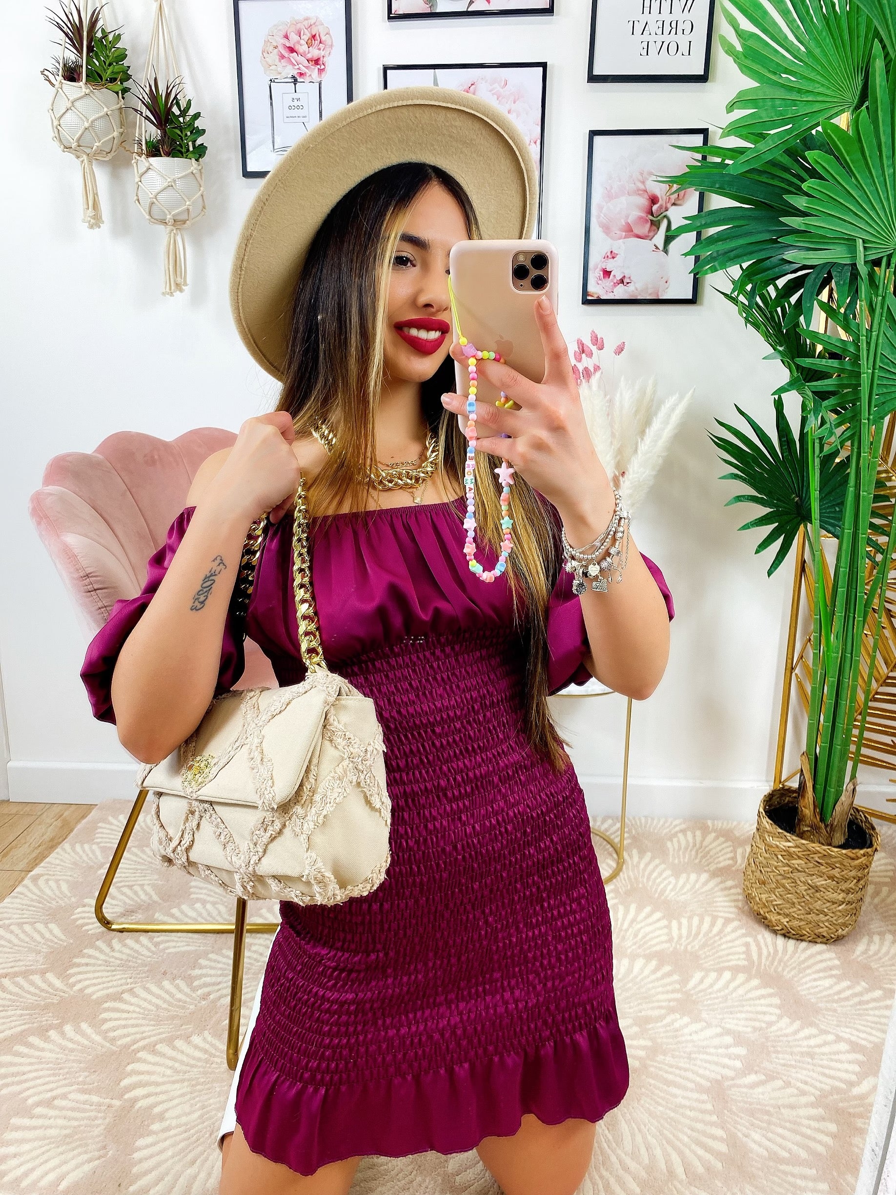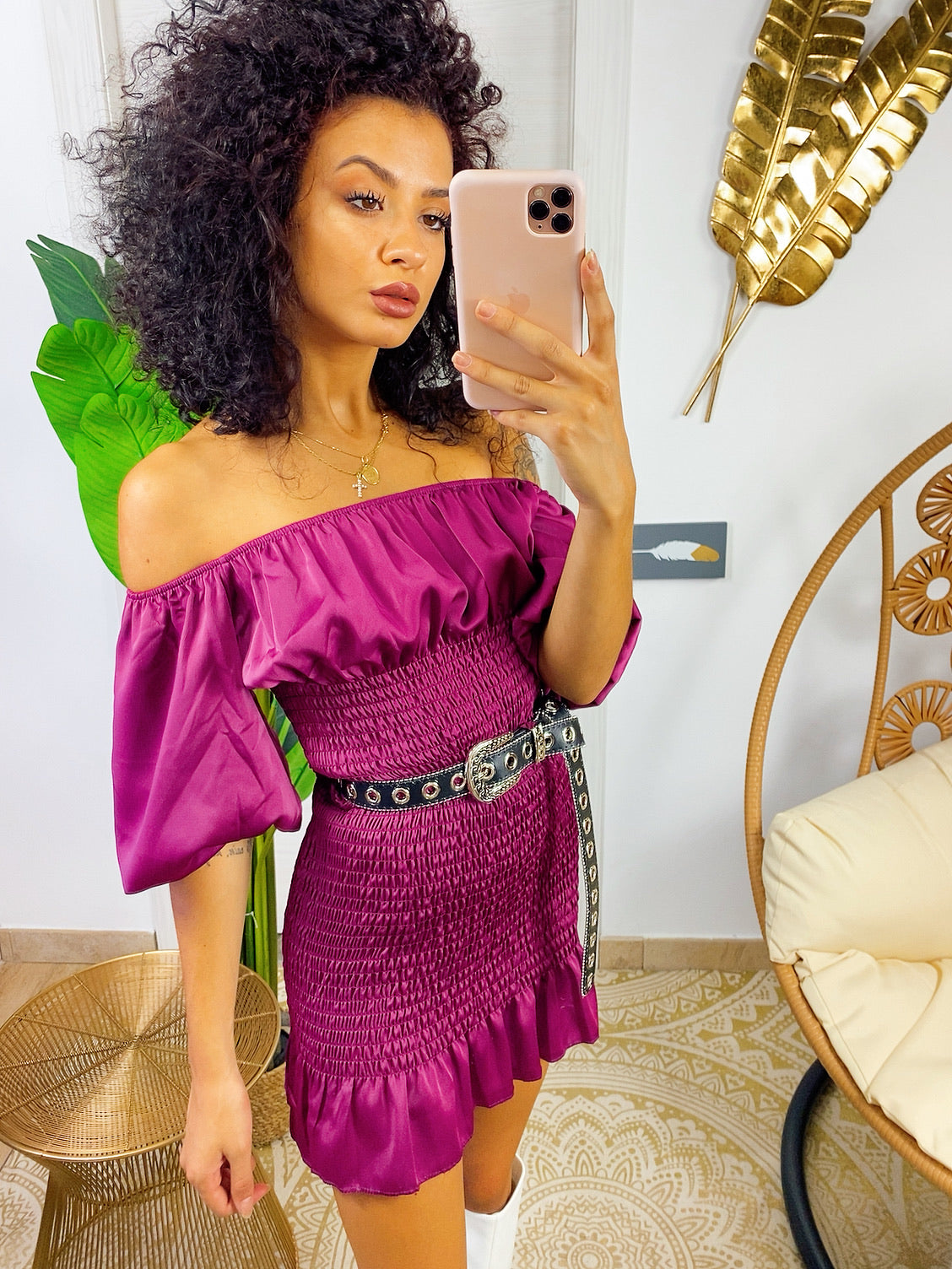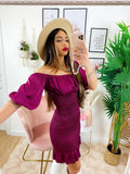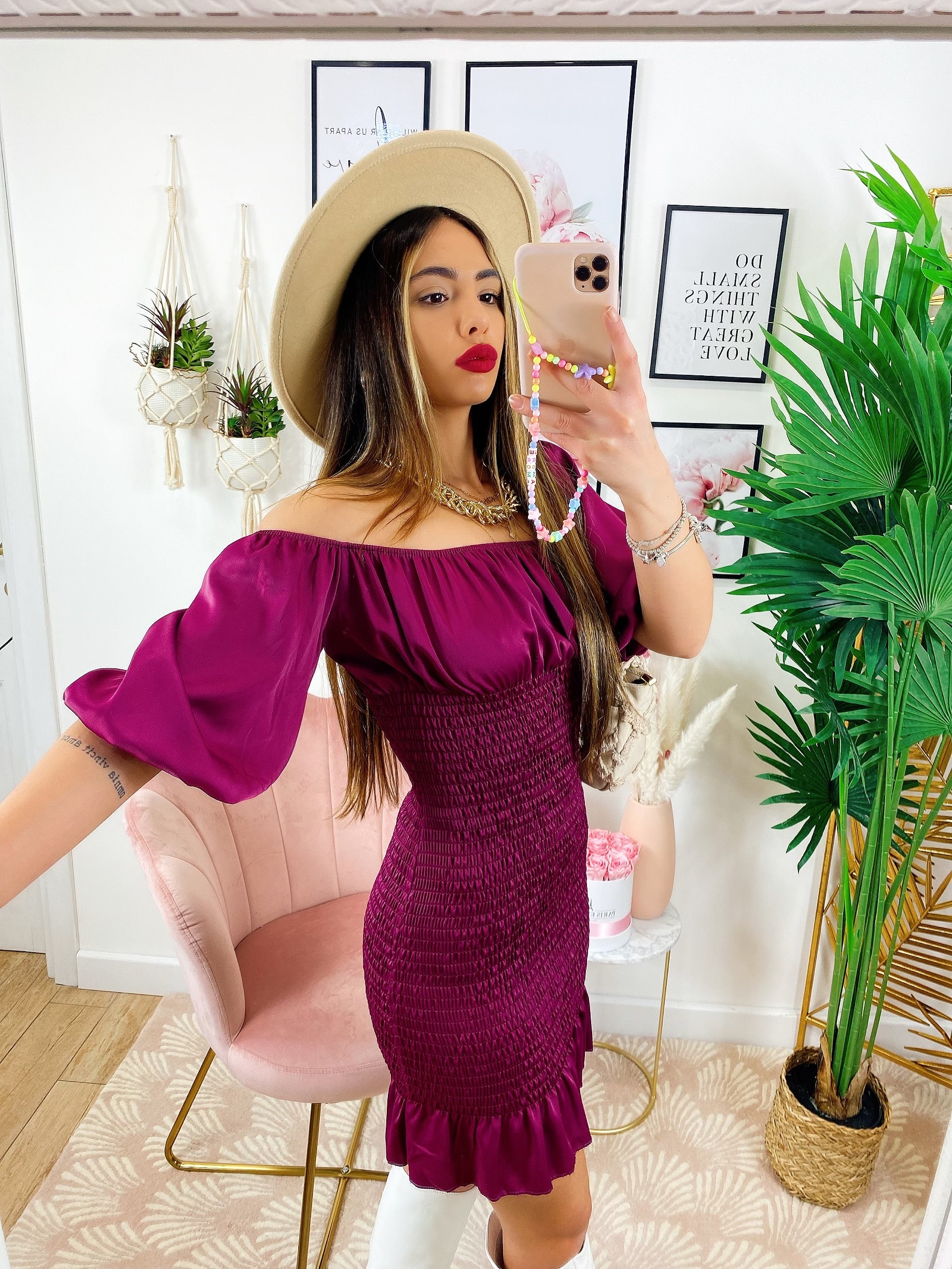 Abito aderente con arricciatura sul bustino. Tessuto arricciato e manica a palloncino.