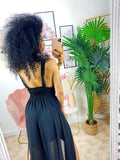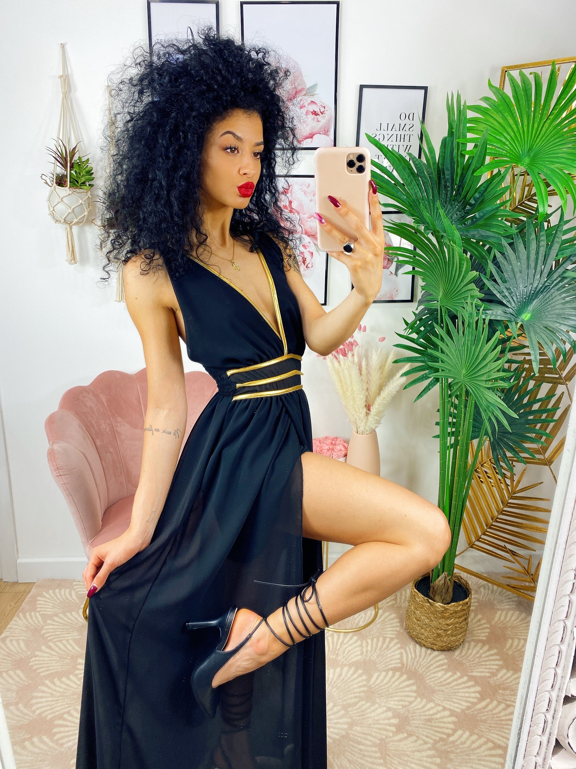 Abito lungo con maxi spacco e dettaglio oro, elasticizzato in vita e chiuso al livello reggiseno. Foderato non trasparente.