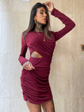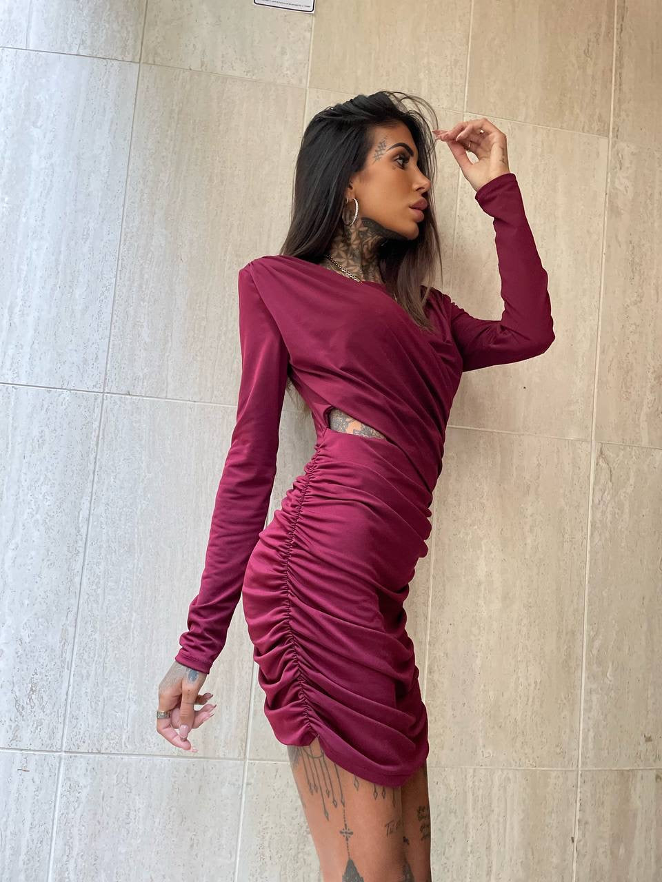 Abito bordeaux strutturato con mini oblò sull’ pancia, spalline e arricciatura nel dietro . Taglia unica