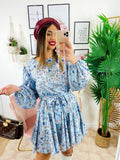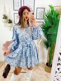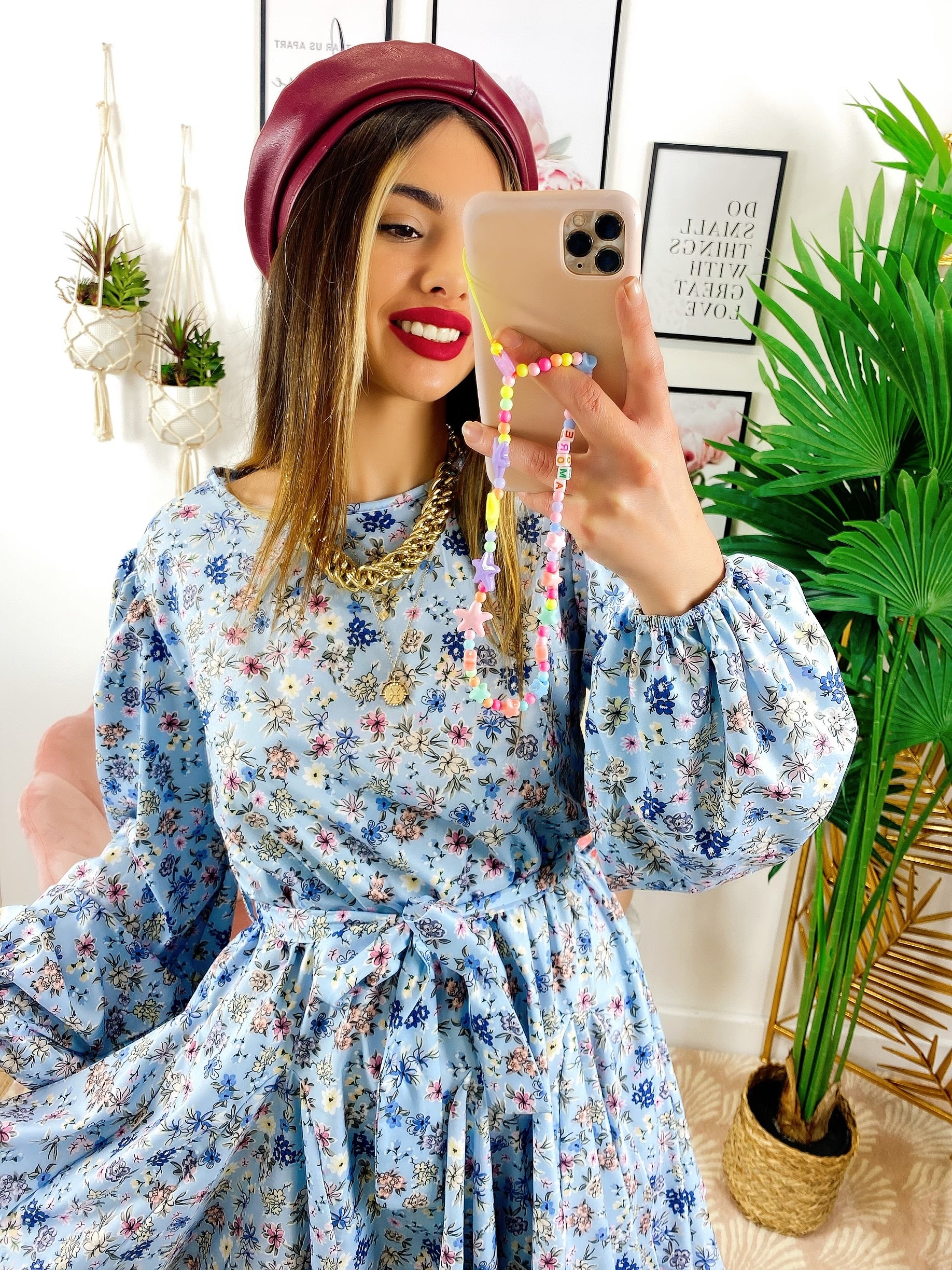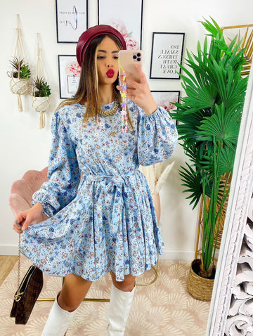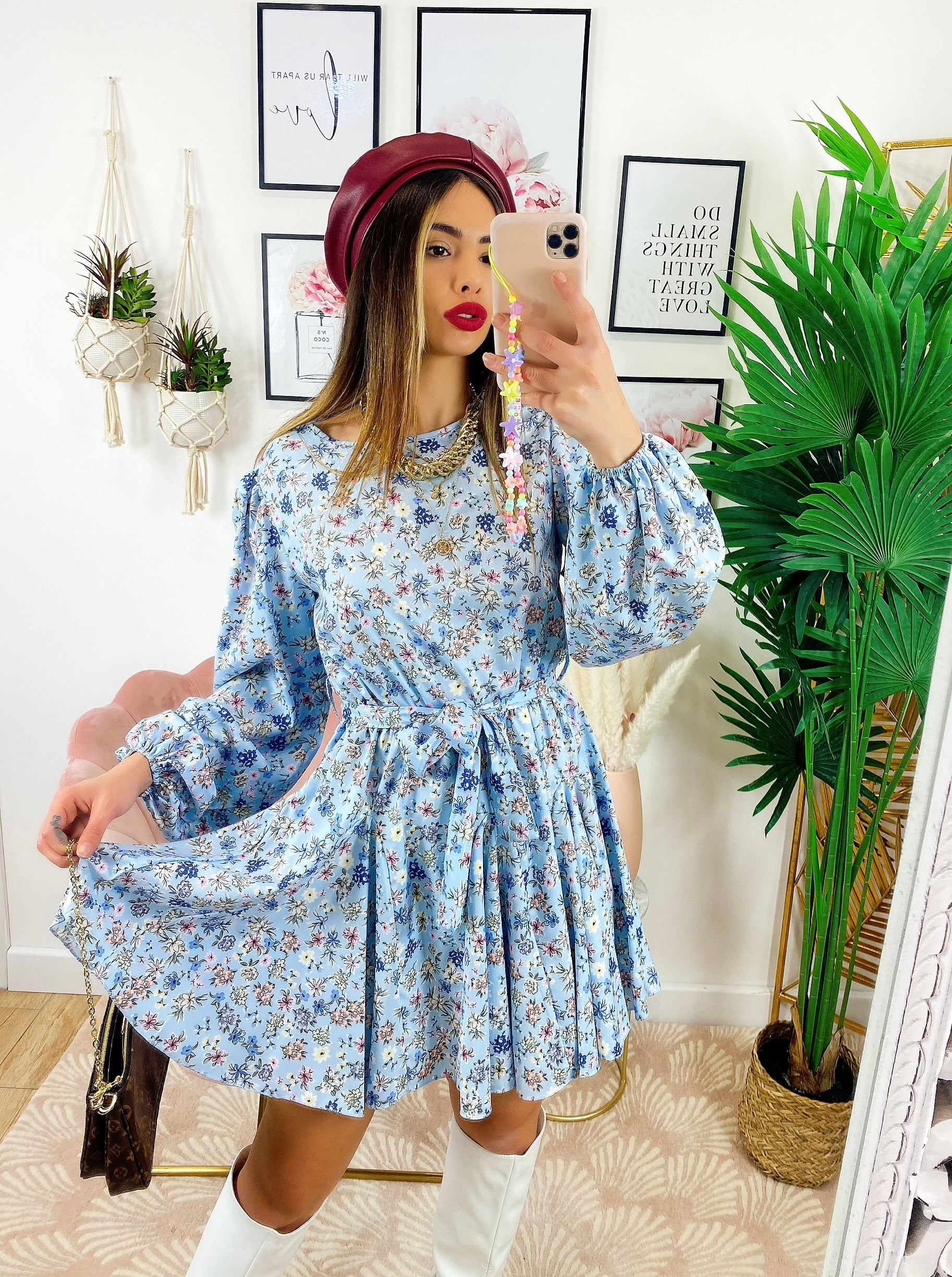 Abito a manica lunga primaverile con stampa a fiorellini, cintura in vita e manica chiusa con polsino.