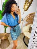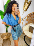 Mini abito con pailettes con scollo a V e manica corta. Foderato, Top in tessuto leggero nero e gonna piena di paillettes. Veste fino a una 42
