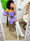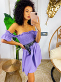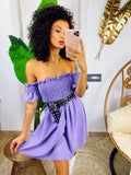 Abito con scollo a barchetta e arricciatura maniche corte. Arricciatura sul busto . Vestibilità elasticizzata.