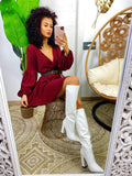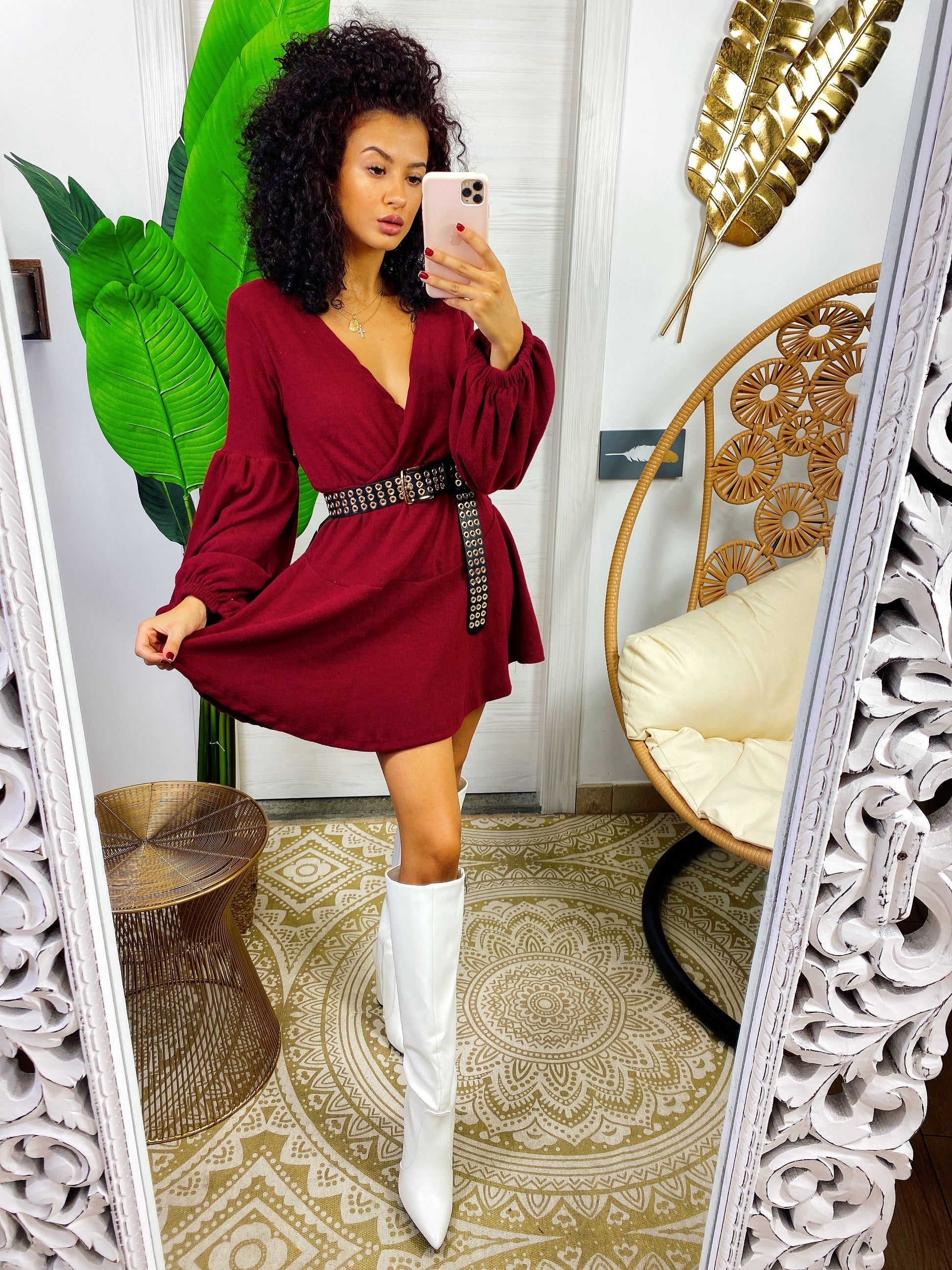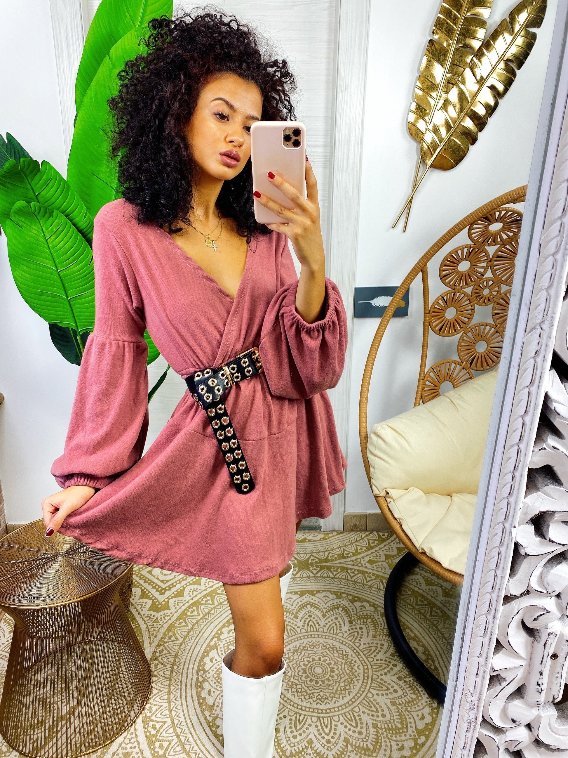 Abito in morbida ciniglia con scollo a V e manica larga con polsino. Elastico regolabile in vita.