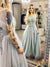 Abito da cerimonia di altissima qualità lungo con maxi gonna in tulle, paillettes incastonate sul petto a caduta e scollo a V. Si presenta con trasparenze, pizzo ricamato di alta qualità e schiena aperta con lacci in Raso doppi che si regolano fino a formare un fiocco.