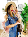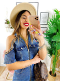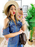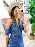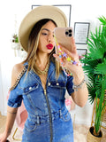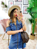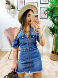 Abito in jeans con spalle scoperte rifinite con catena, zio centrale e tasche, ottima qualità