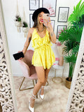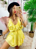 Tutina gialla con rouge, foderato con sotto pantaloncino, senza coppe regolabile al collo.