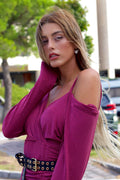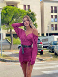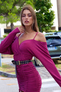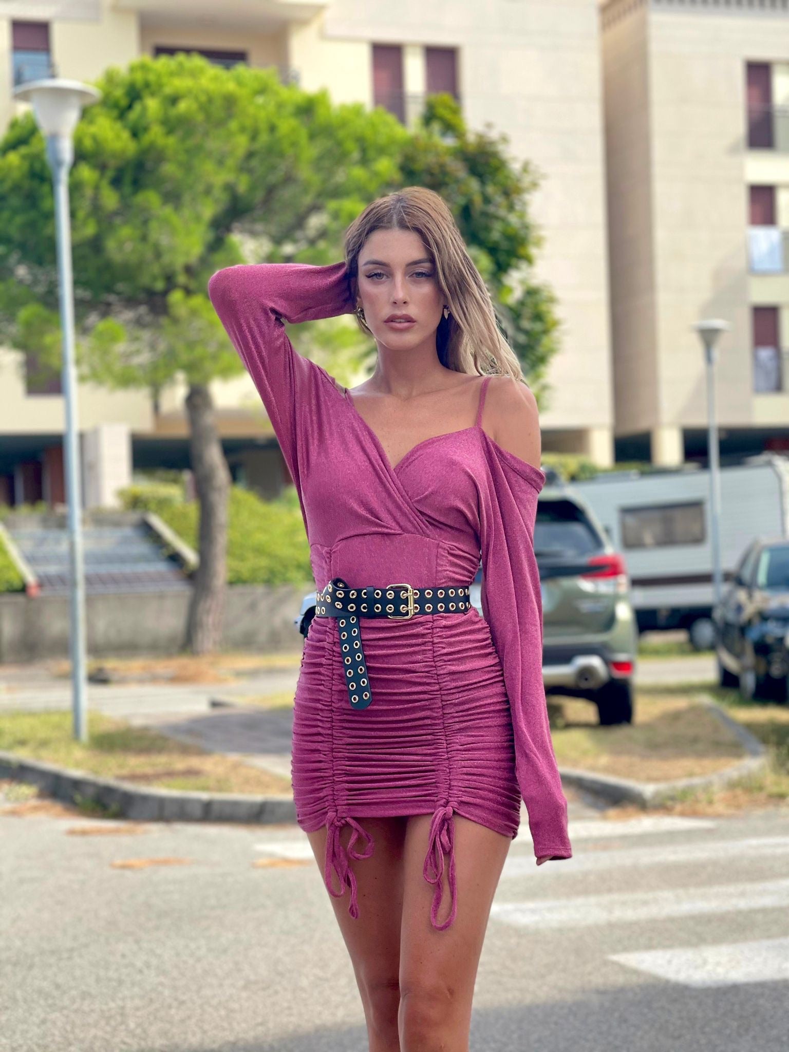 Abito in tessuto glitterato a bretellina manica lunga. Arricciato sul davanti senza coppe.