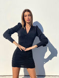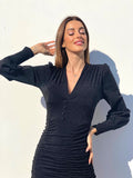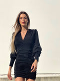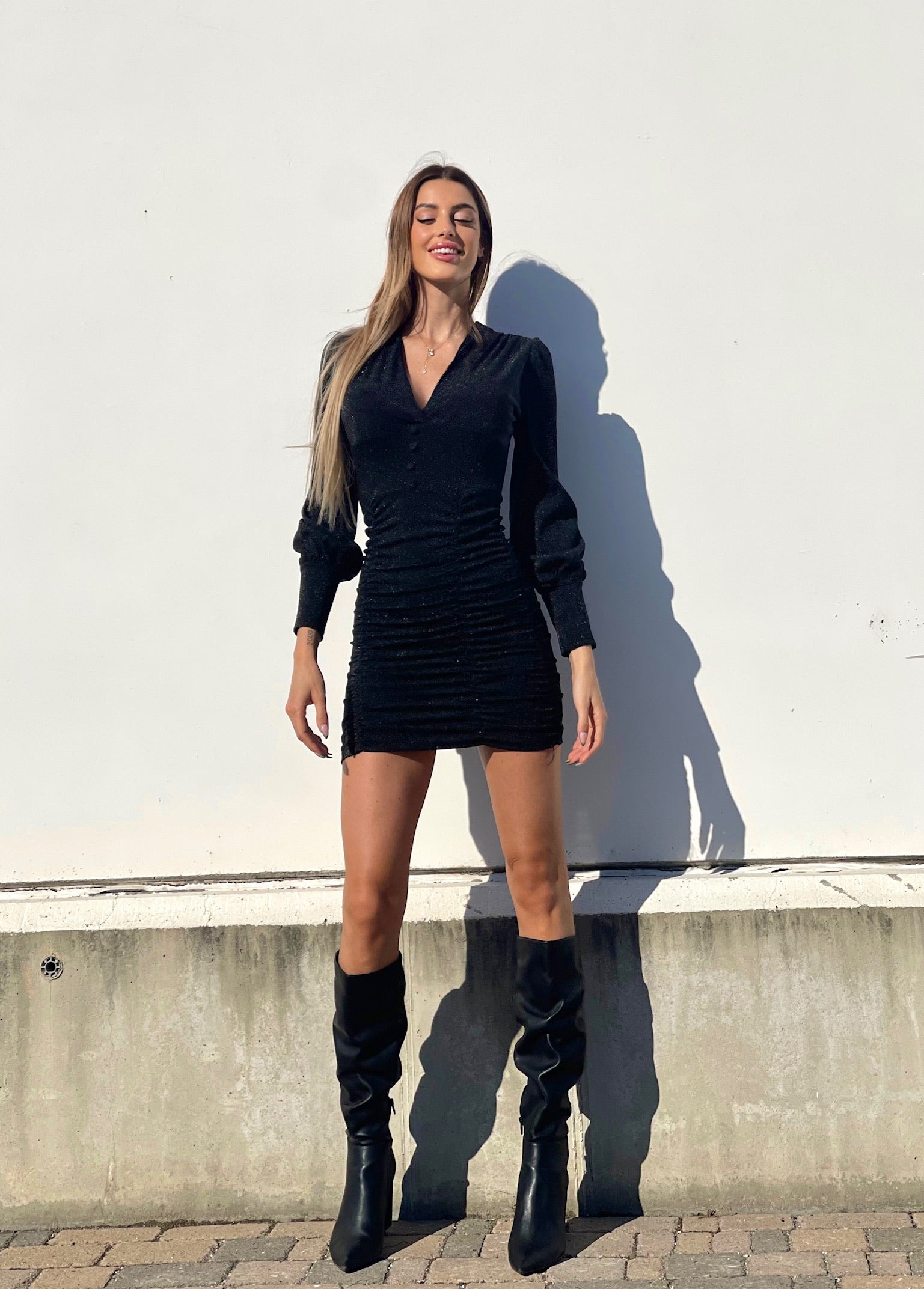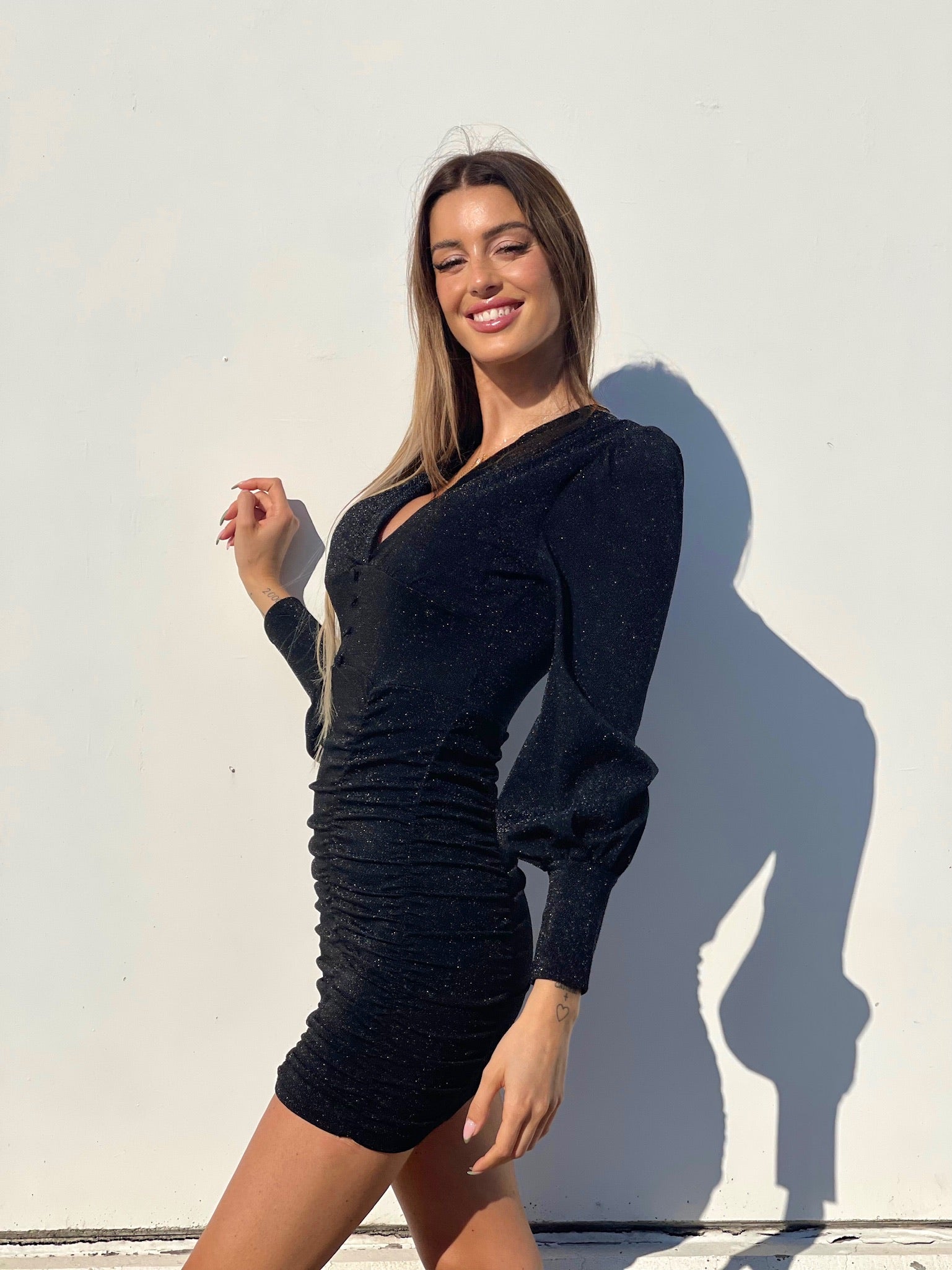 Abito perfetto per un evento in tessuto glitterato nero. Bottoncini sul davanti e arricciatura