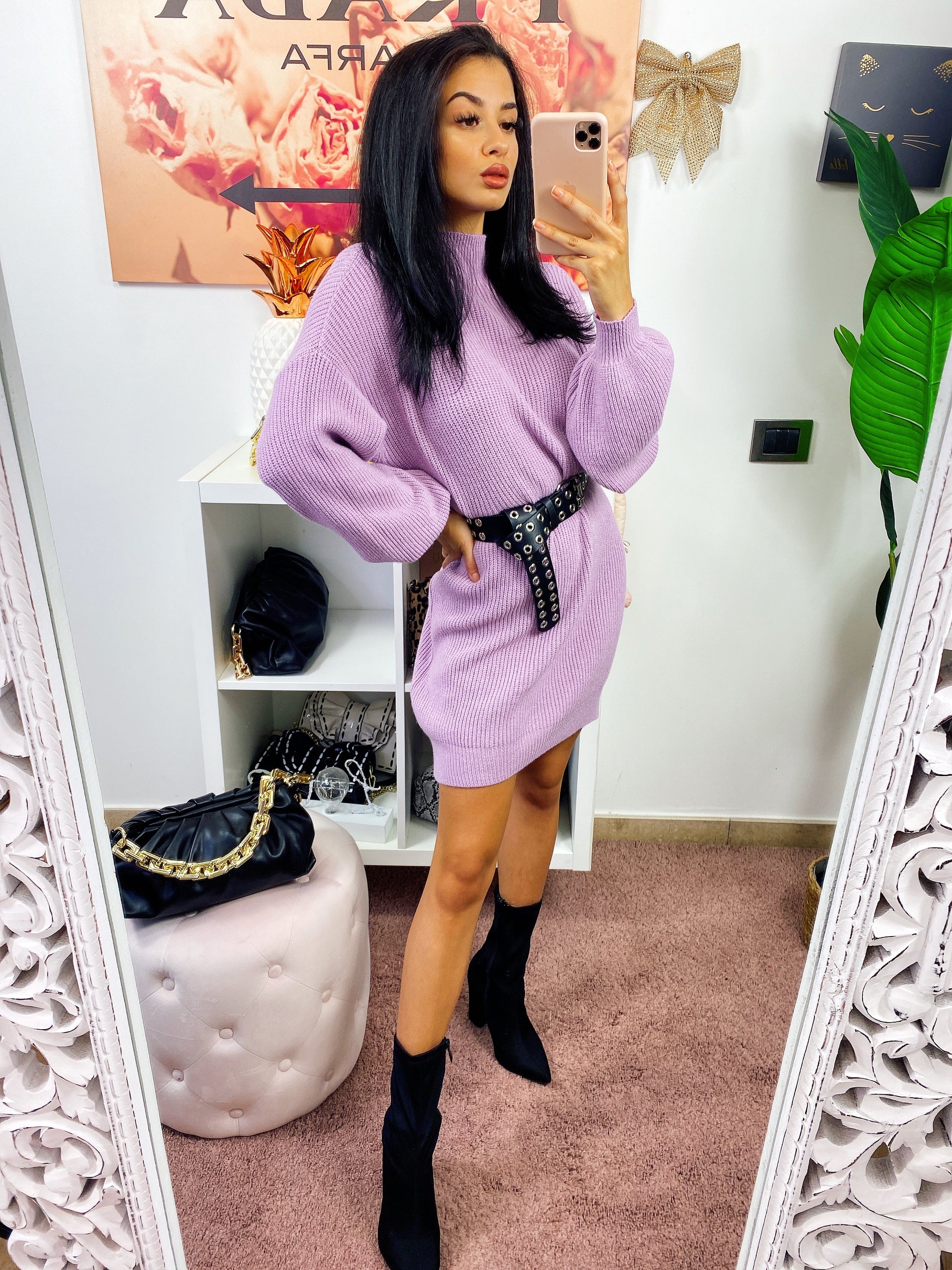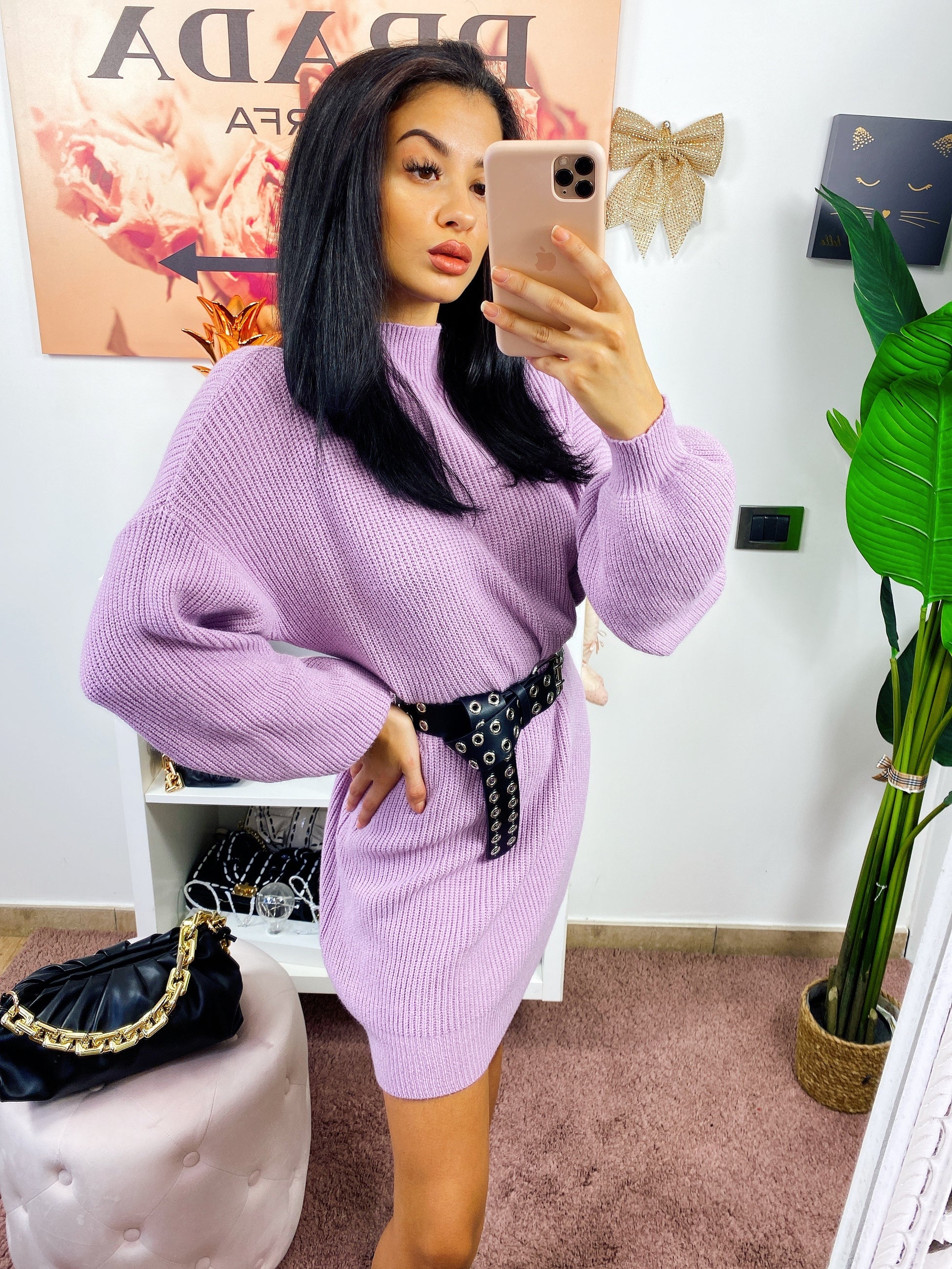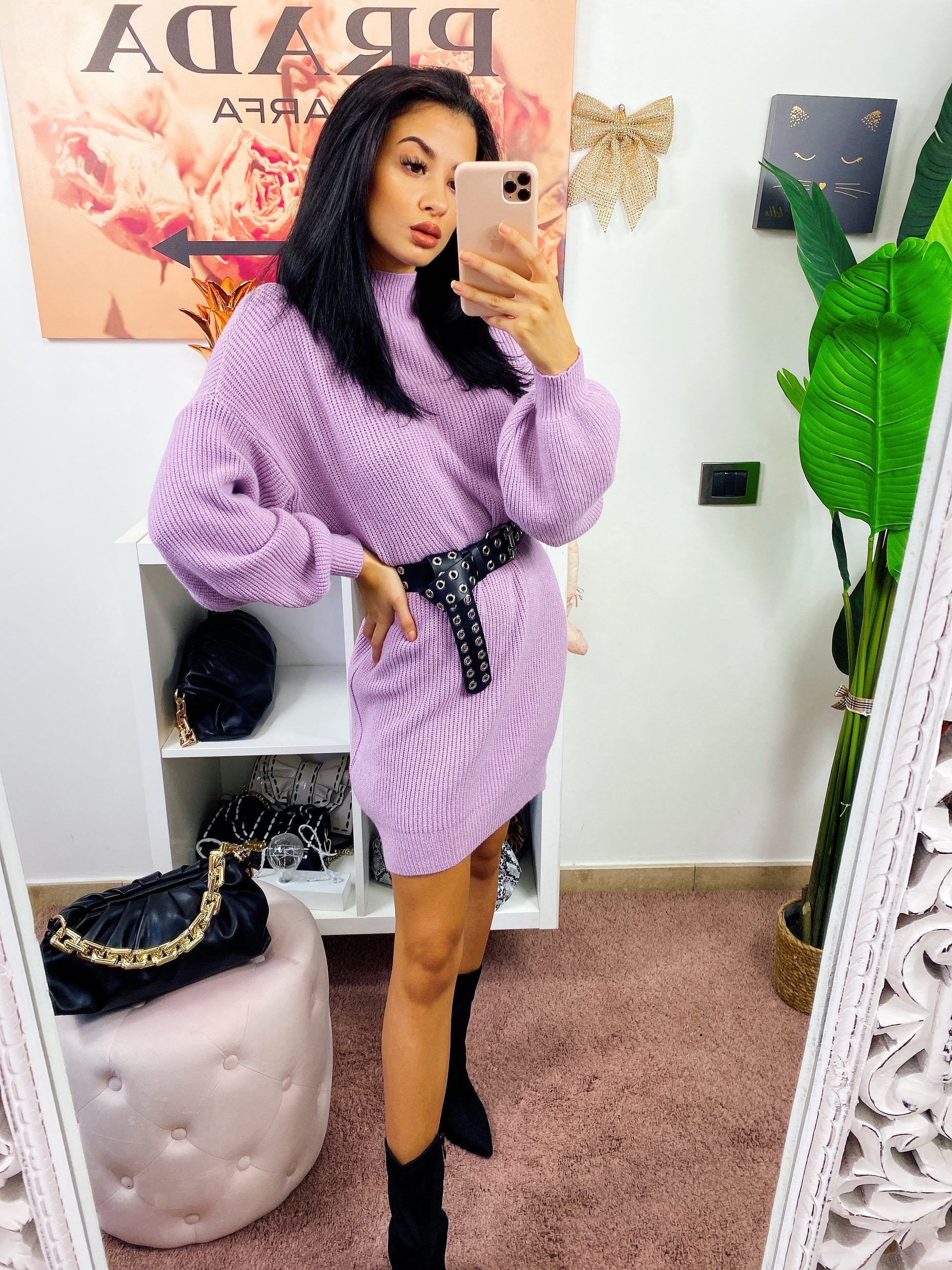 Semplice abito in tessuto medio pesante. Colore pastello in tessuto elasticizzato, girocollo e manica larga.