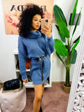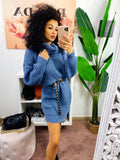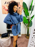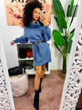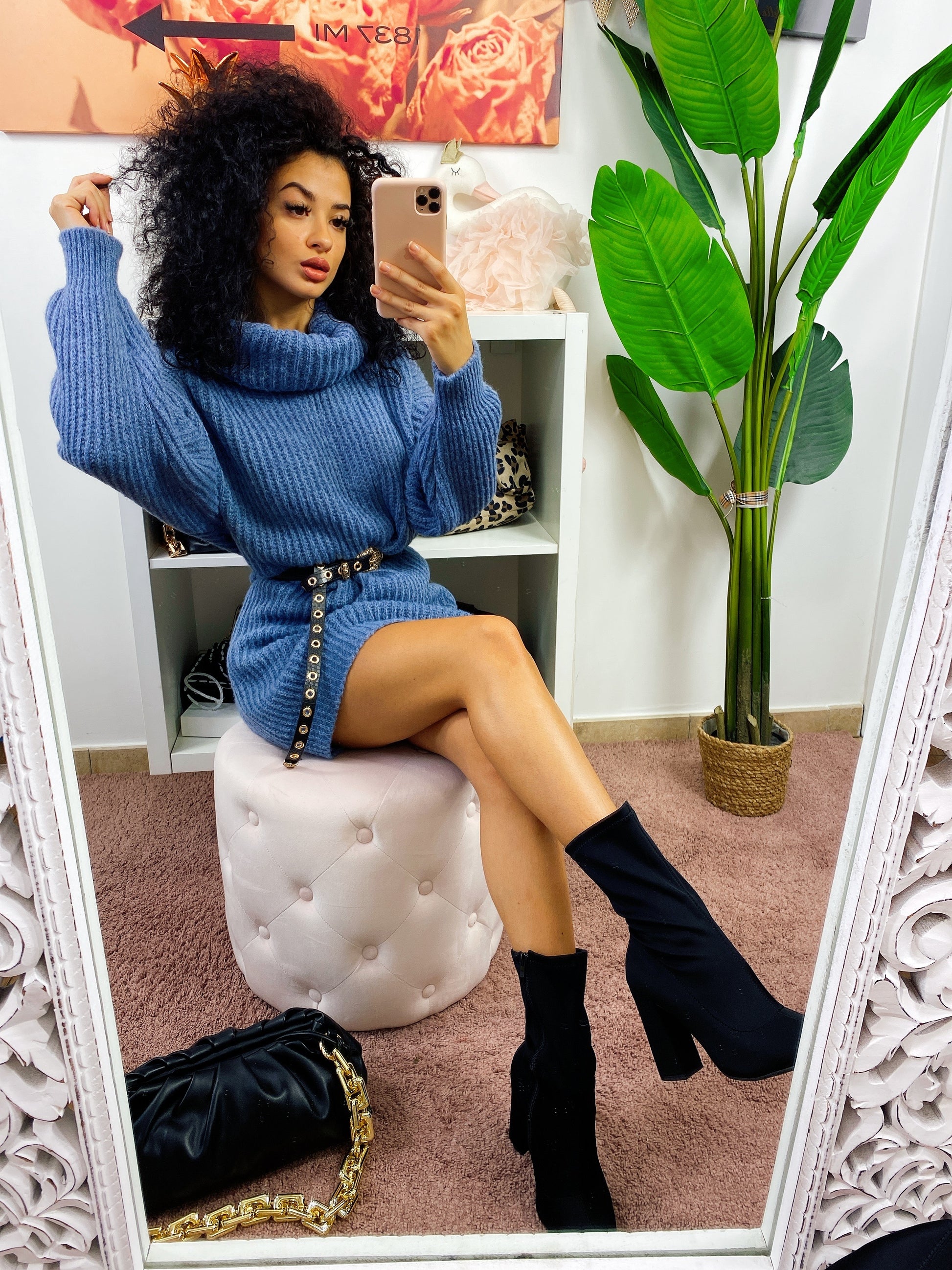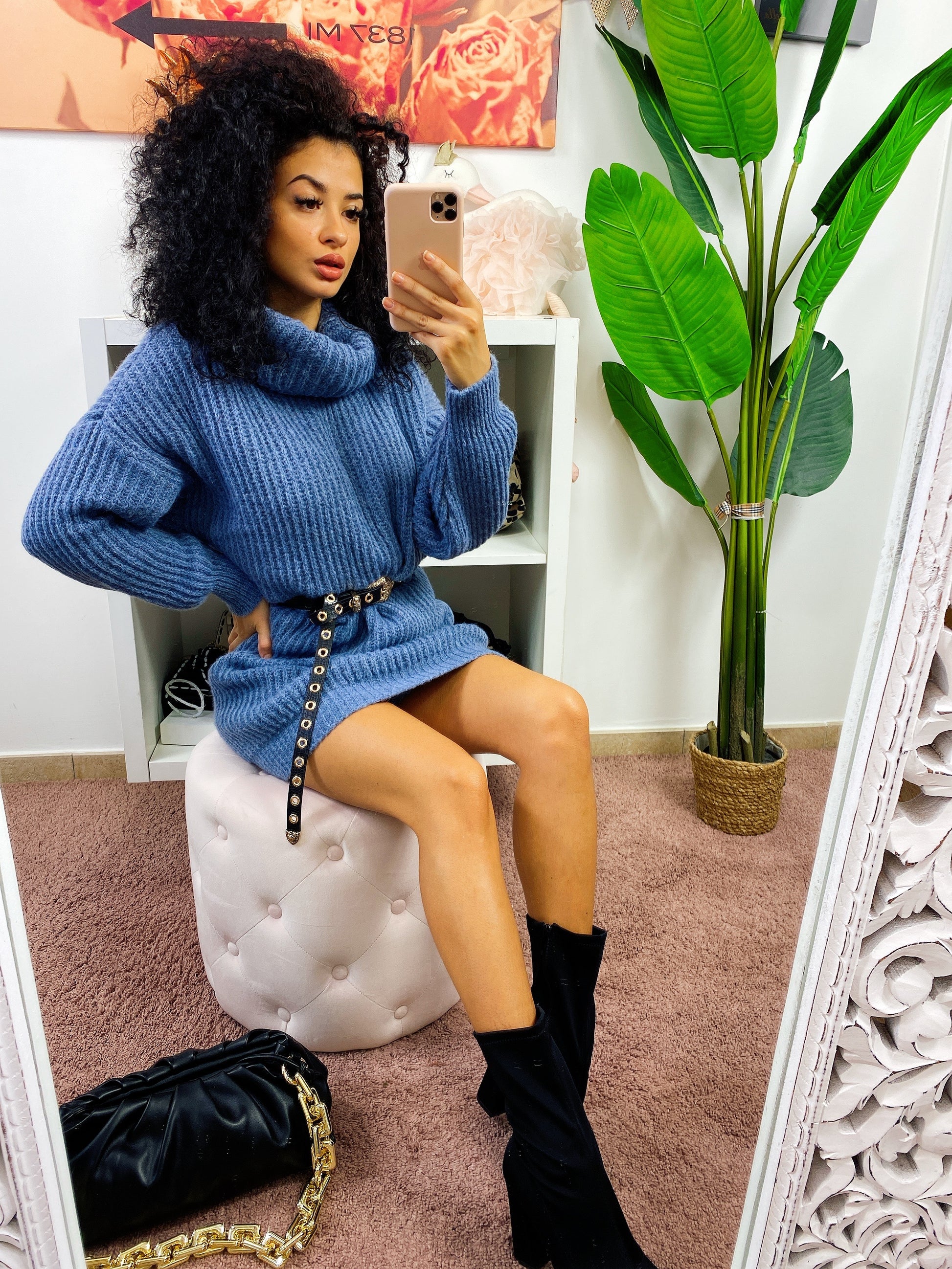 Semplice abito in lana con collo alto. Colore pastello in tessuto elasticizzato, collo alto risvoltato e manica larga.