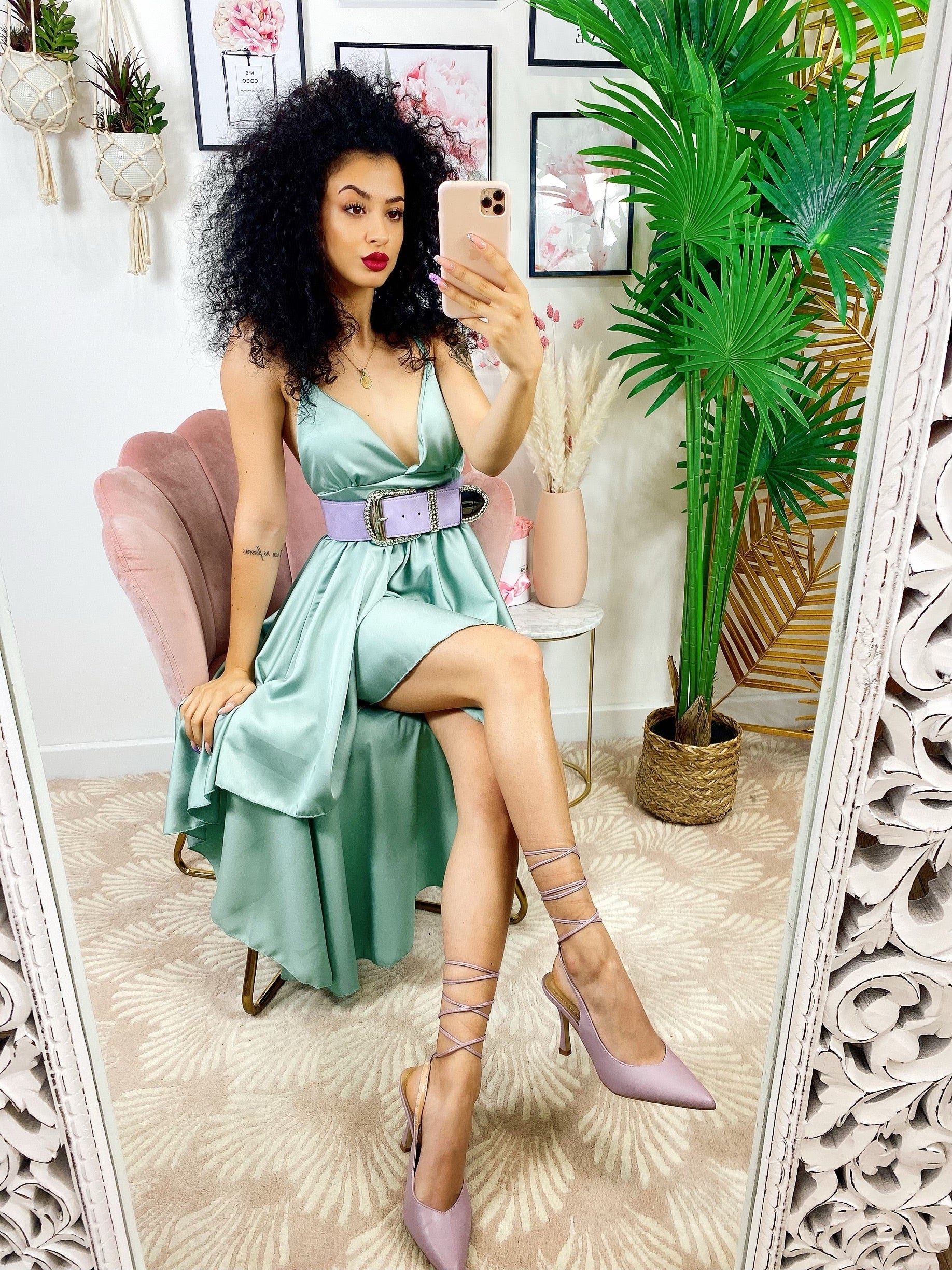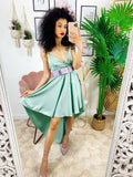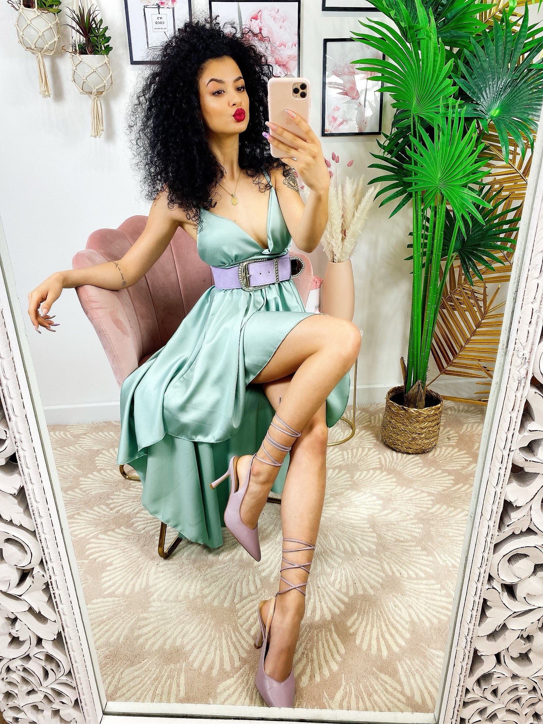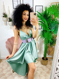 Abito in raso di altissima qualità con gonna asimmetrica, dotato di coppe e spalline regolabili.