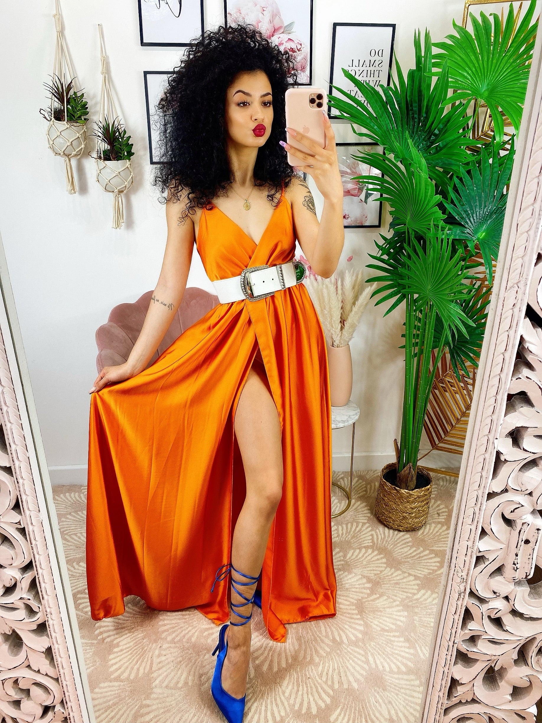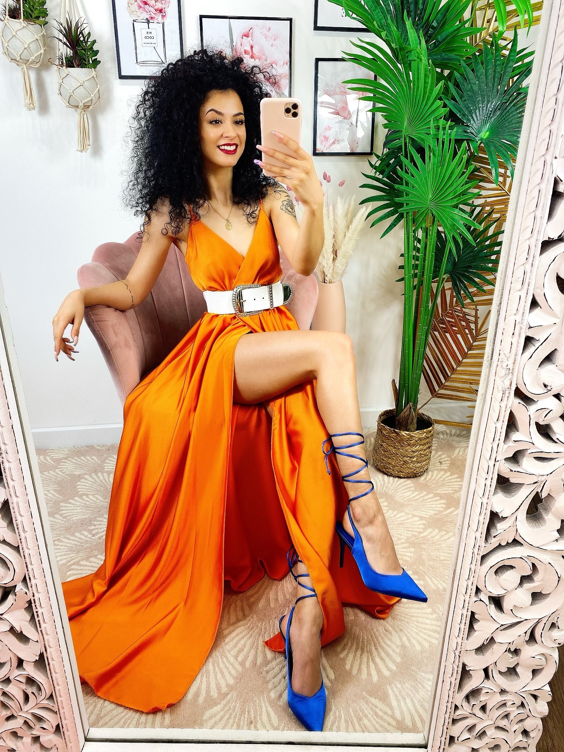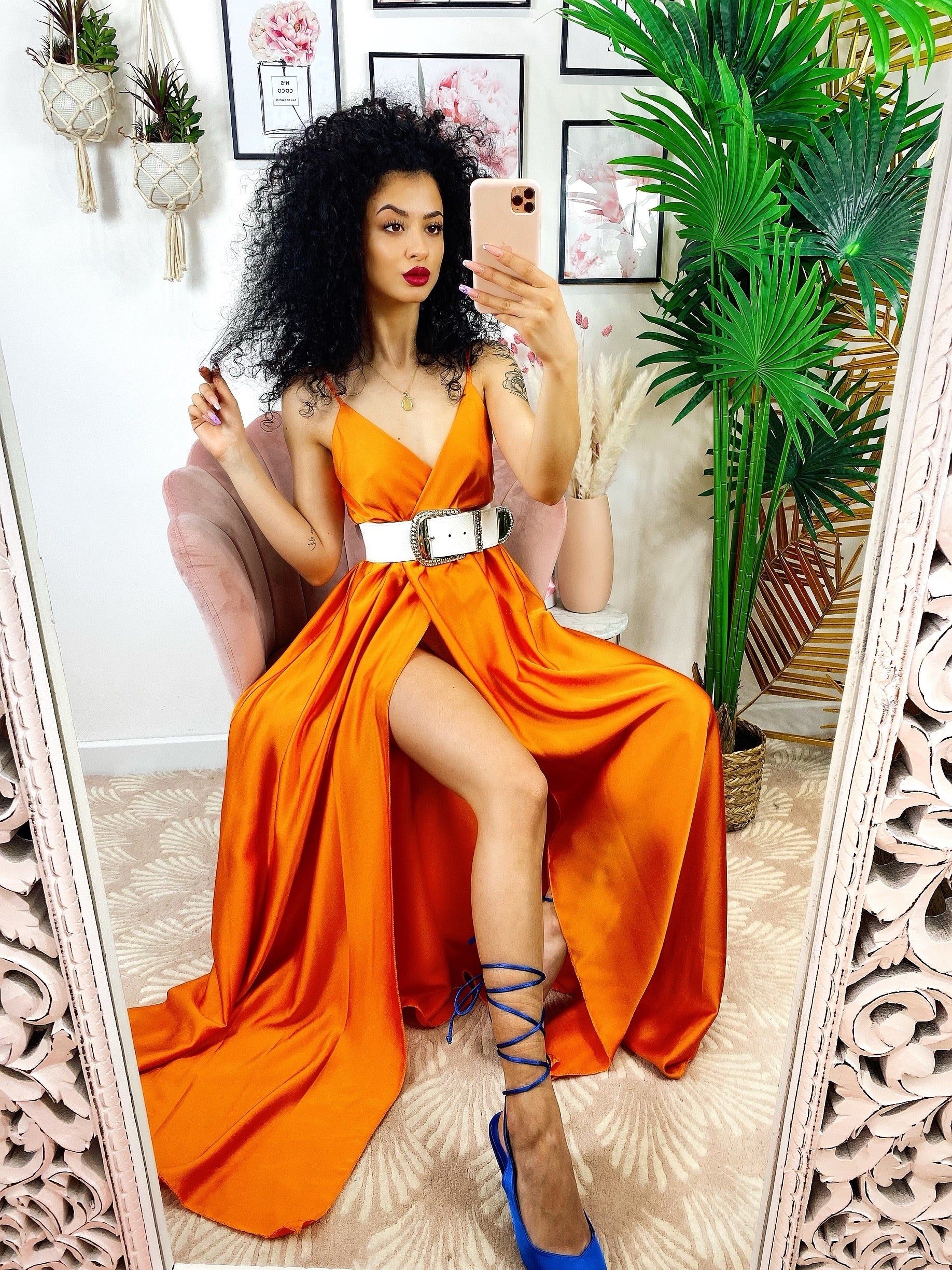 Abito in raso con maxi spacco arancione - R.a. Boutique