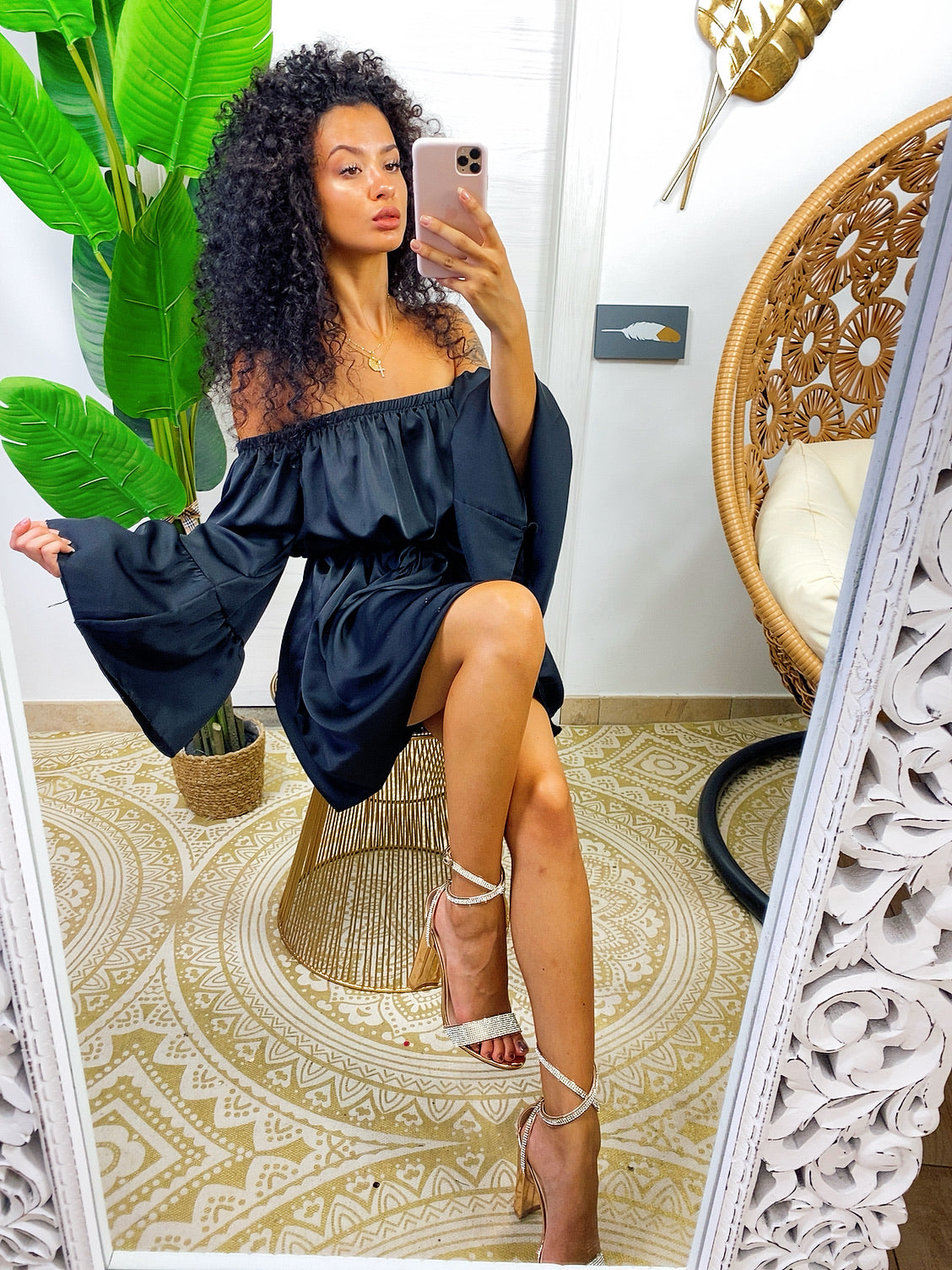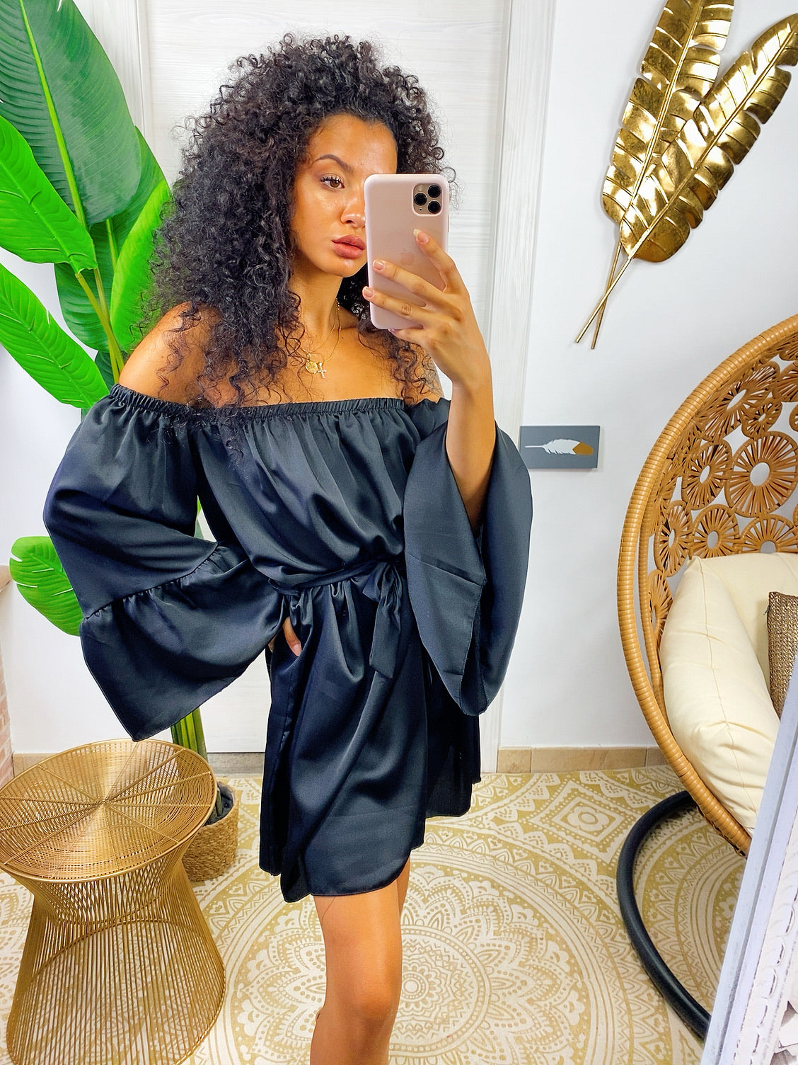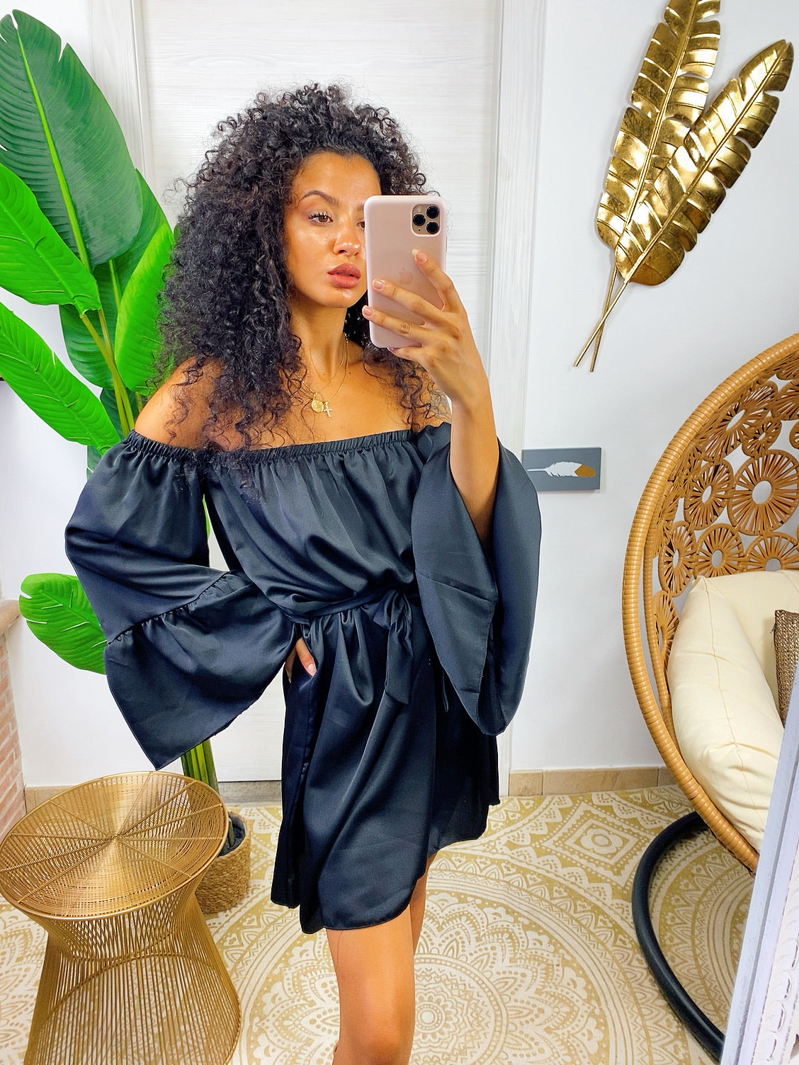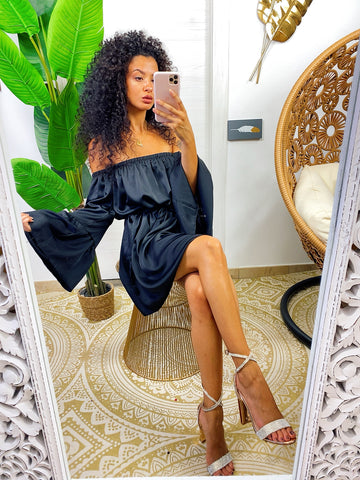 Abito in morbido raso con manica lunga ampia. Scollo a barchetta e fusciacca in vita. Abbinalo con un paio di stivali alti o un tacco aperto.