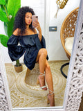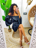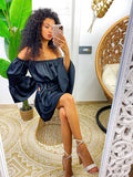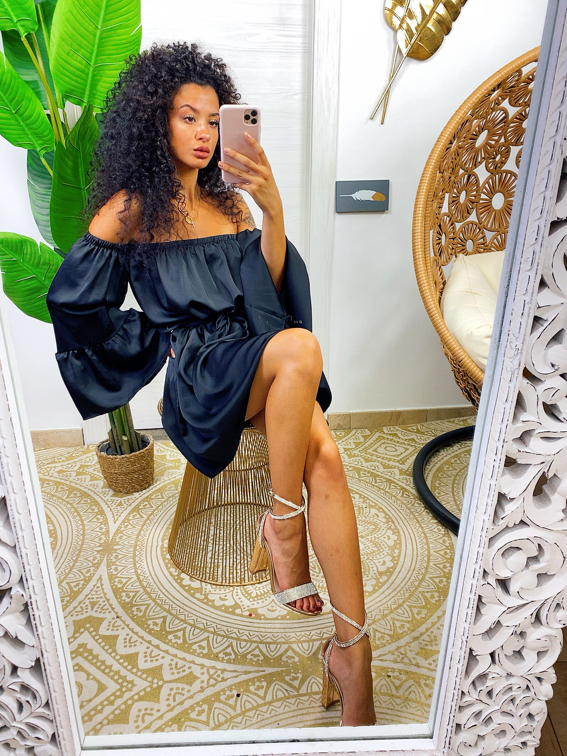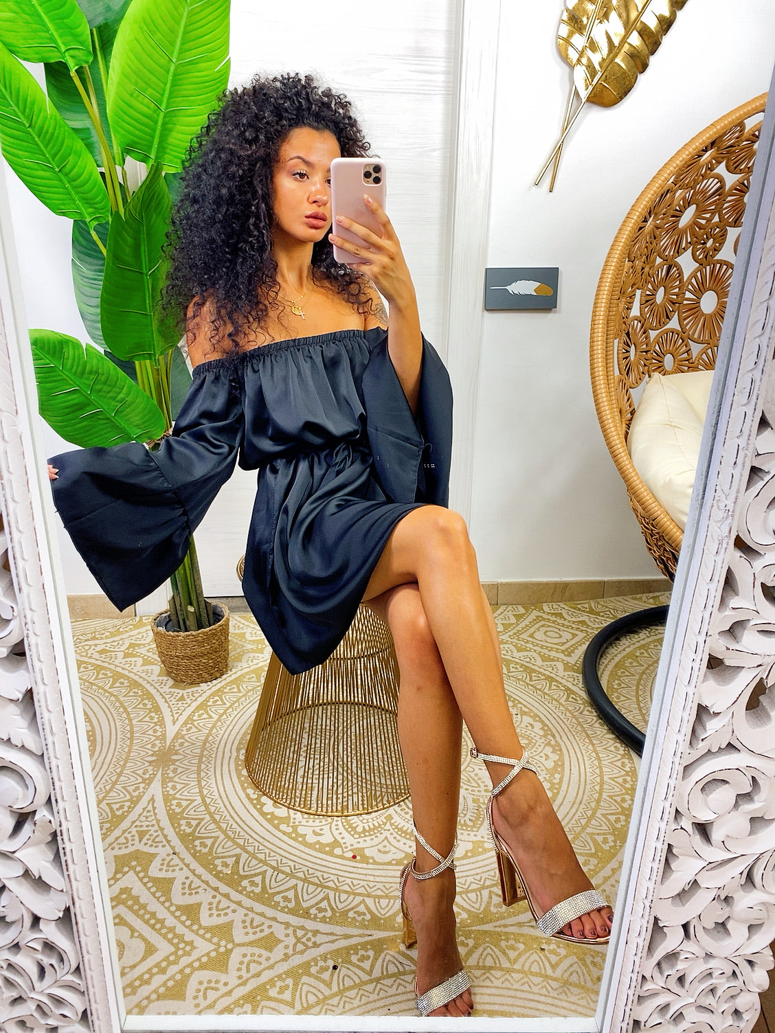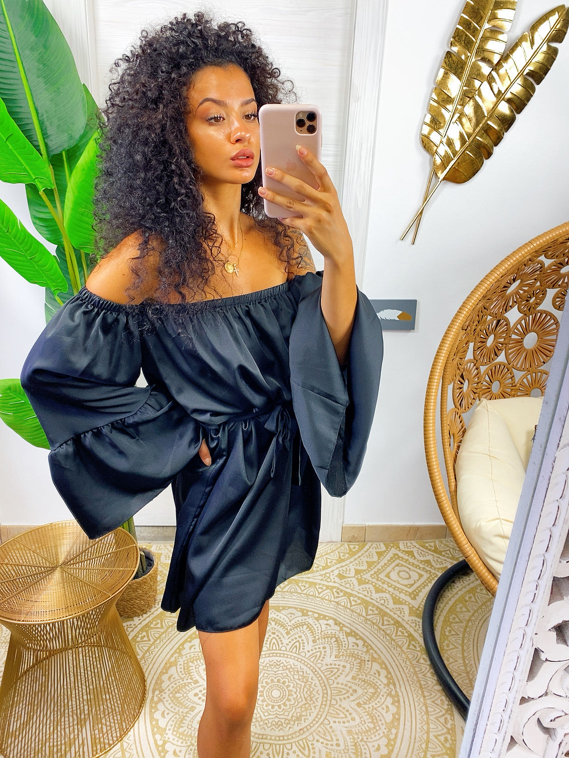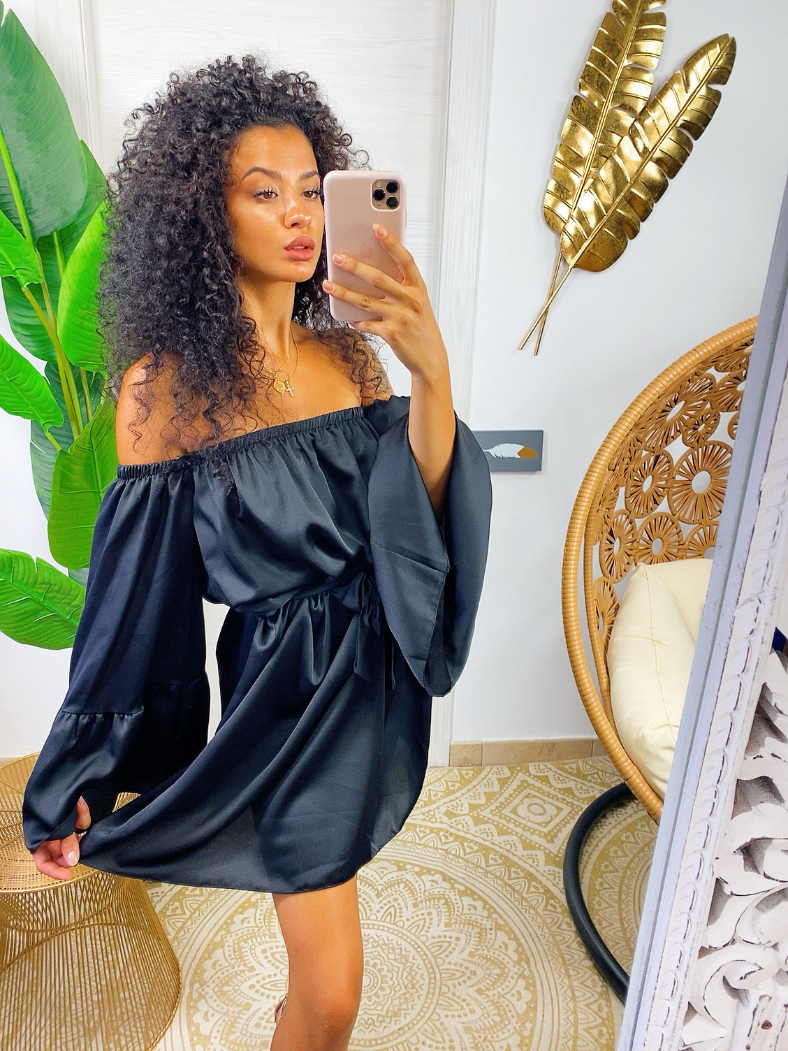 Abito in morbido raso con manica lunga ampia. Scollo a barchetta e fusciacca in vita. Abbinalo con un paio di stivali alti o un tacco aperto.