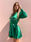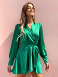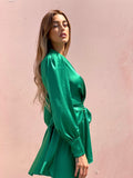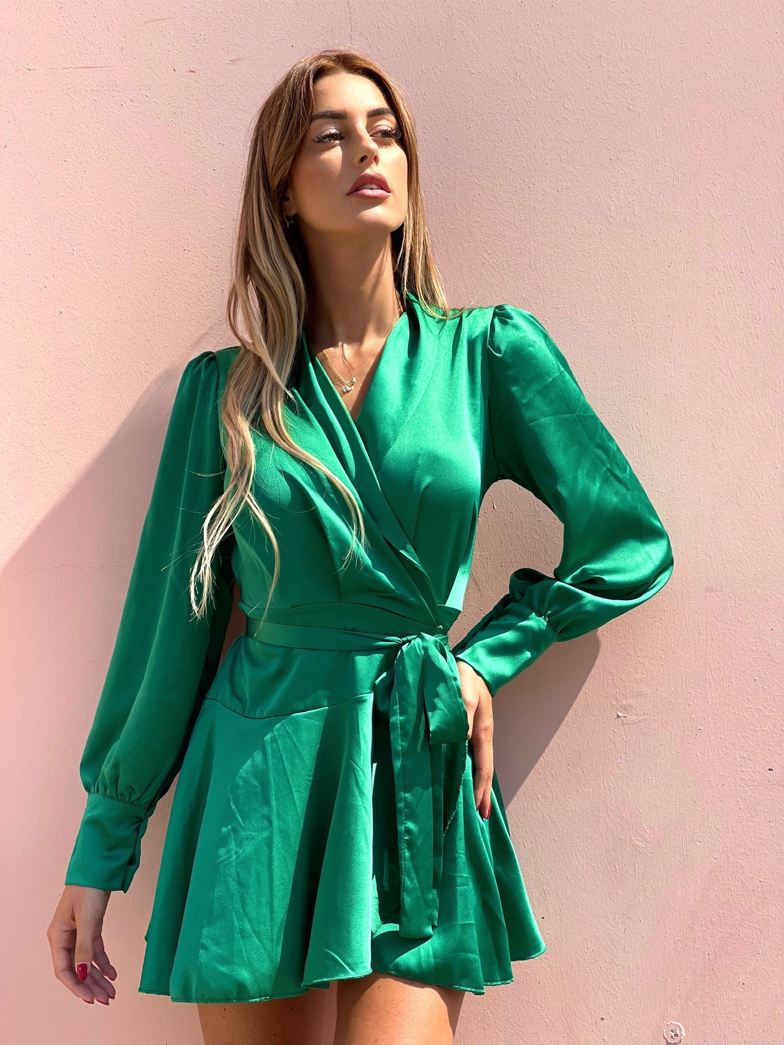 Abito in raso in un verde smeraldo sgargiante, chiusura a portafoglio e gonna asimmetrica. Fusciacca in vita tono su tono.