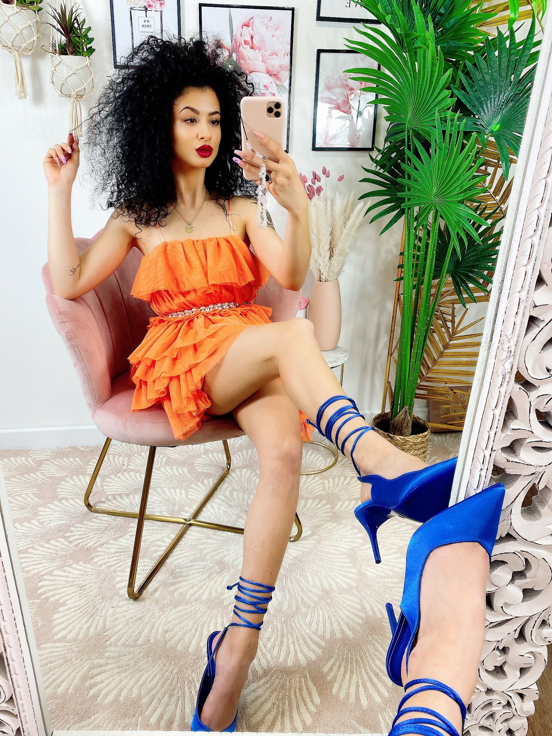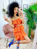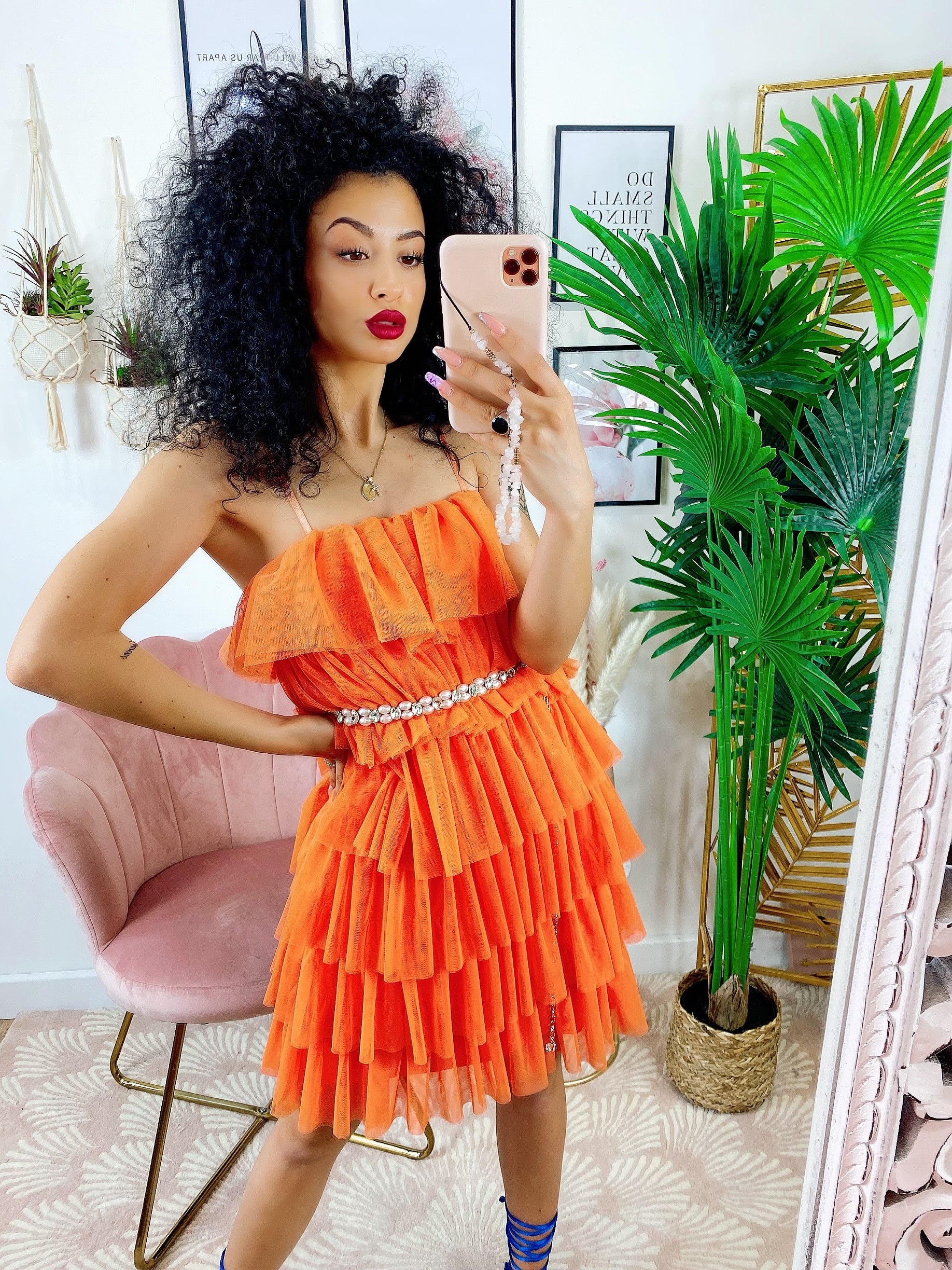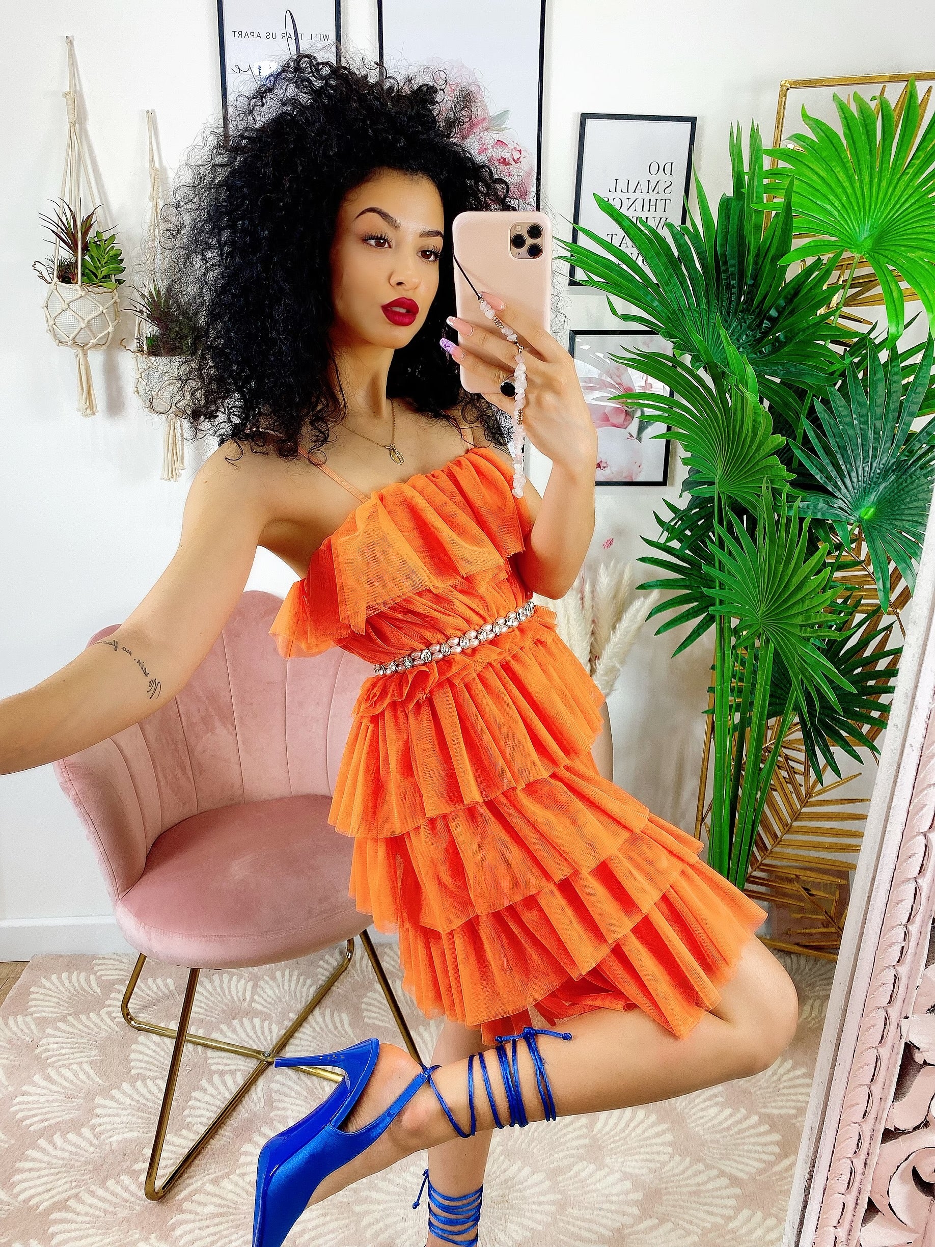 Abito in tulle con balze voluminose. Perfetto con un cinturone in vita così da esaltare la gonna.