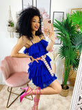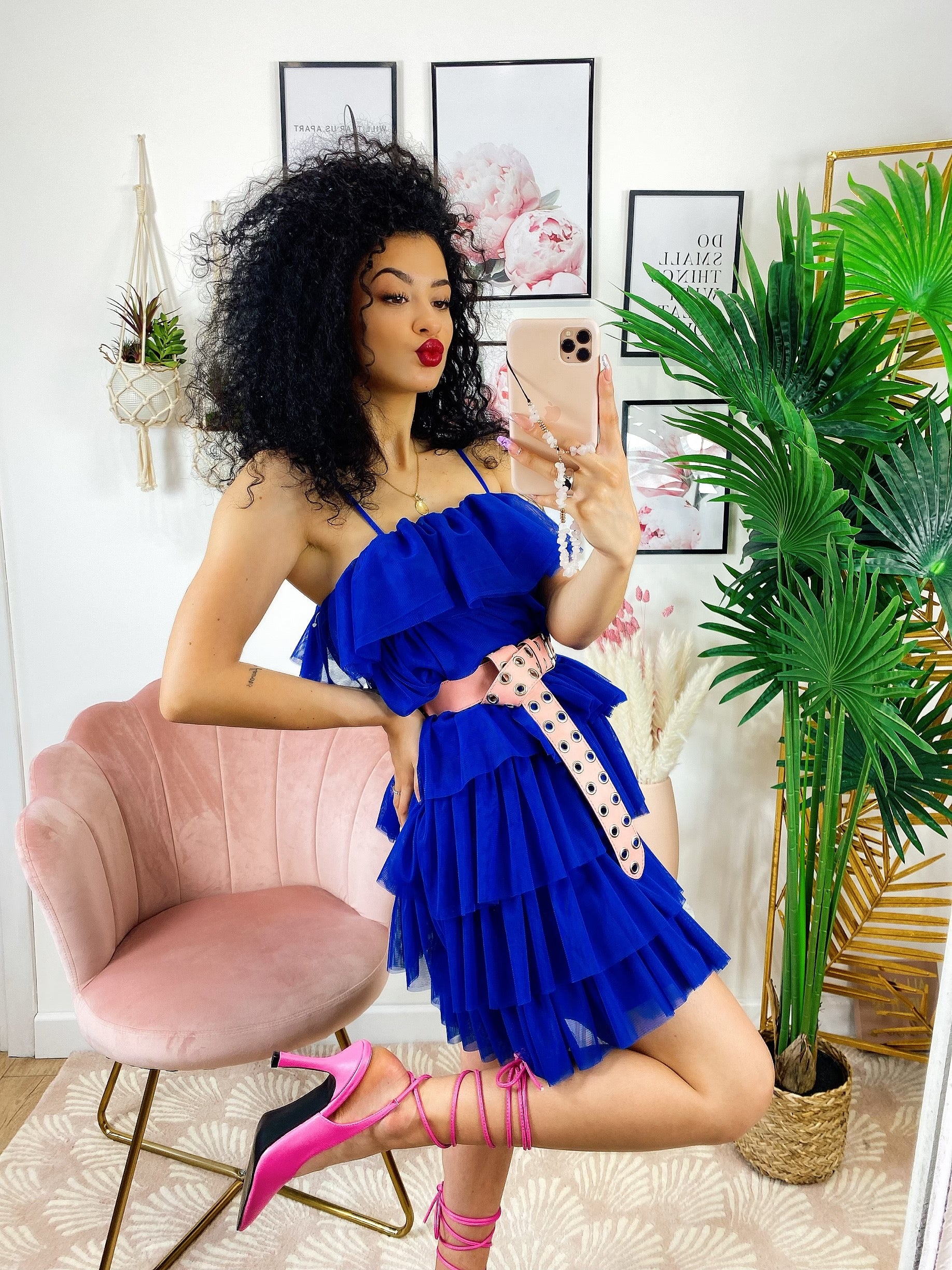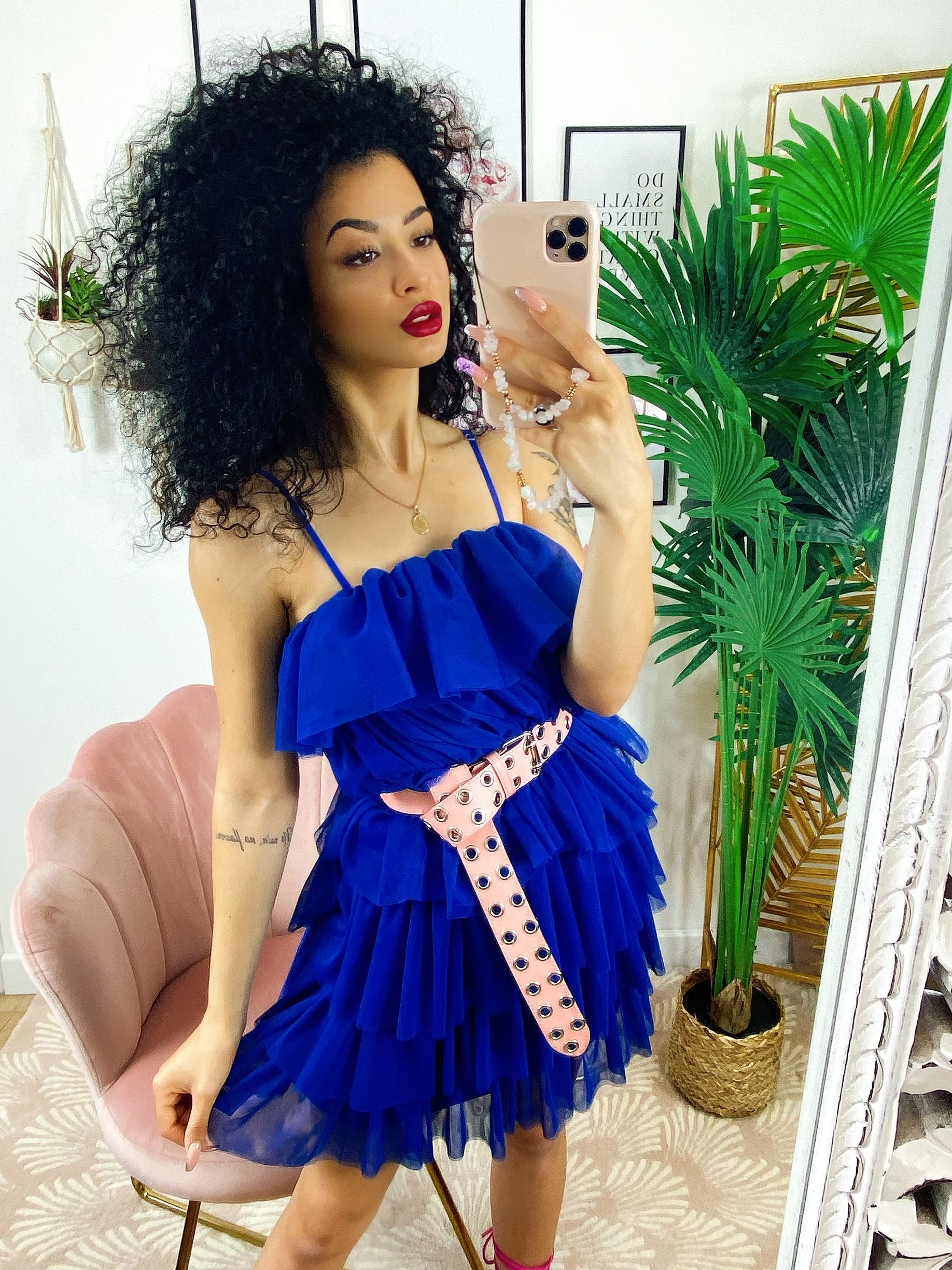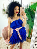 Abito in tulle con balze voluminose. Perfetto con un cinturone in vita così da esaltare la gonna.