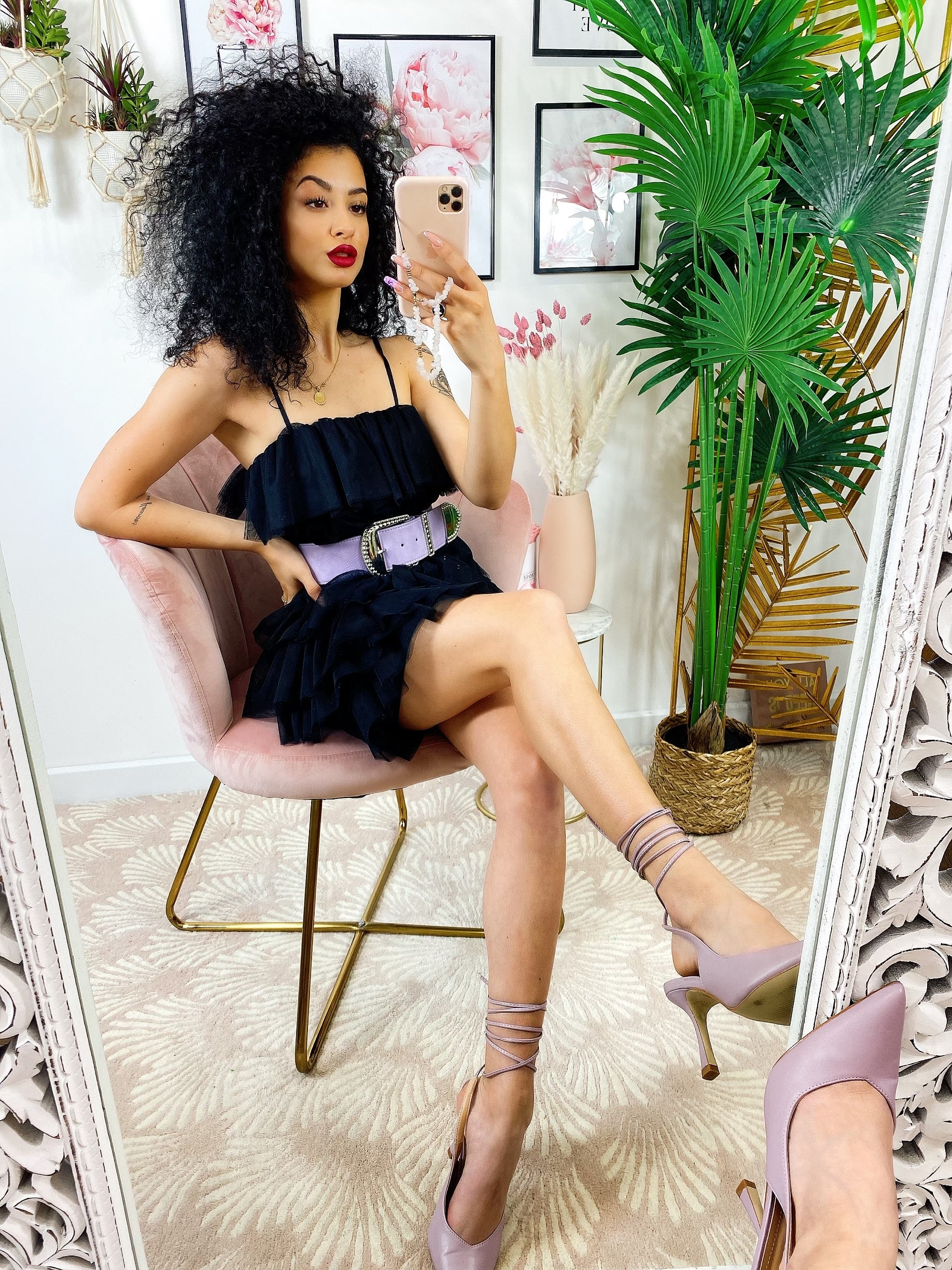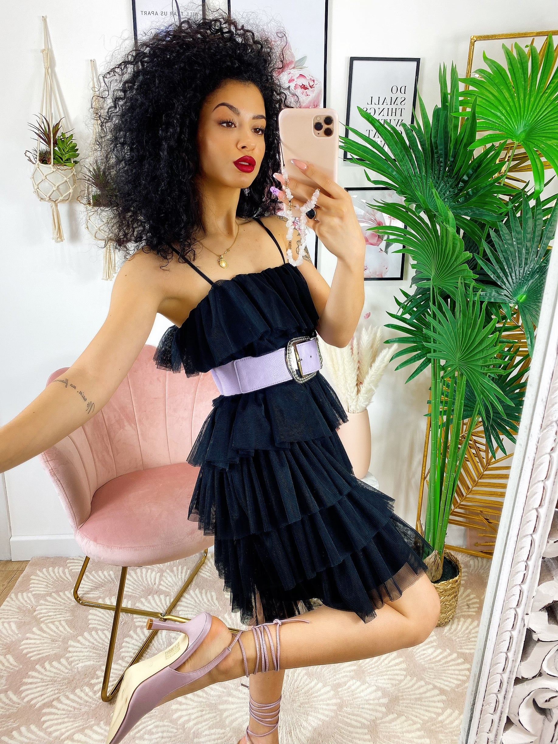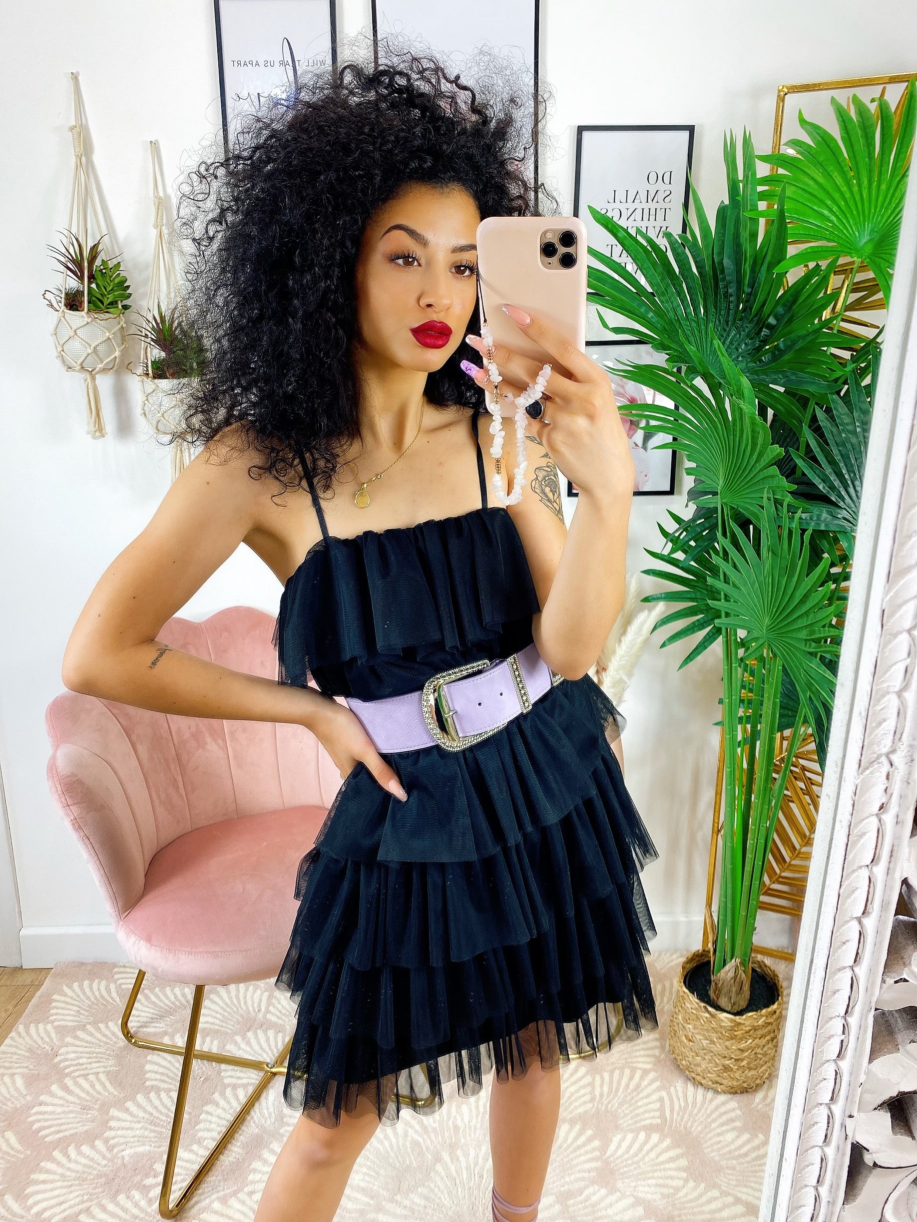 Abito in tulle con balze voluminose. Perfetto con un cinturone in vita così da esaltare la gonna.
