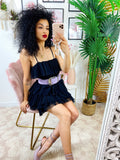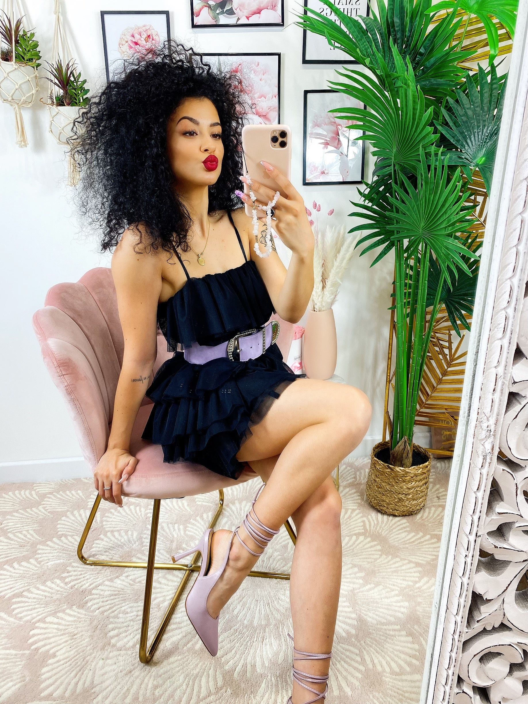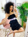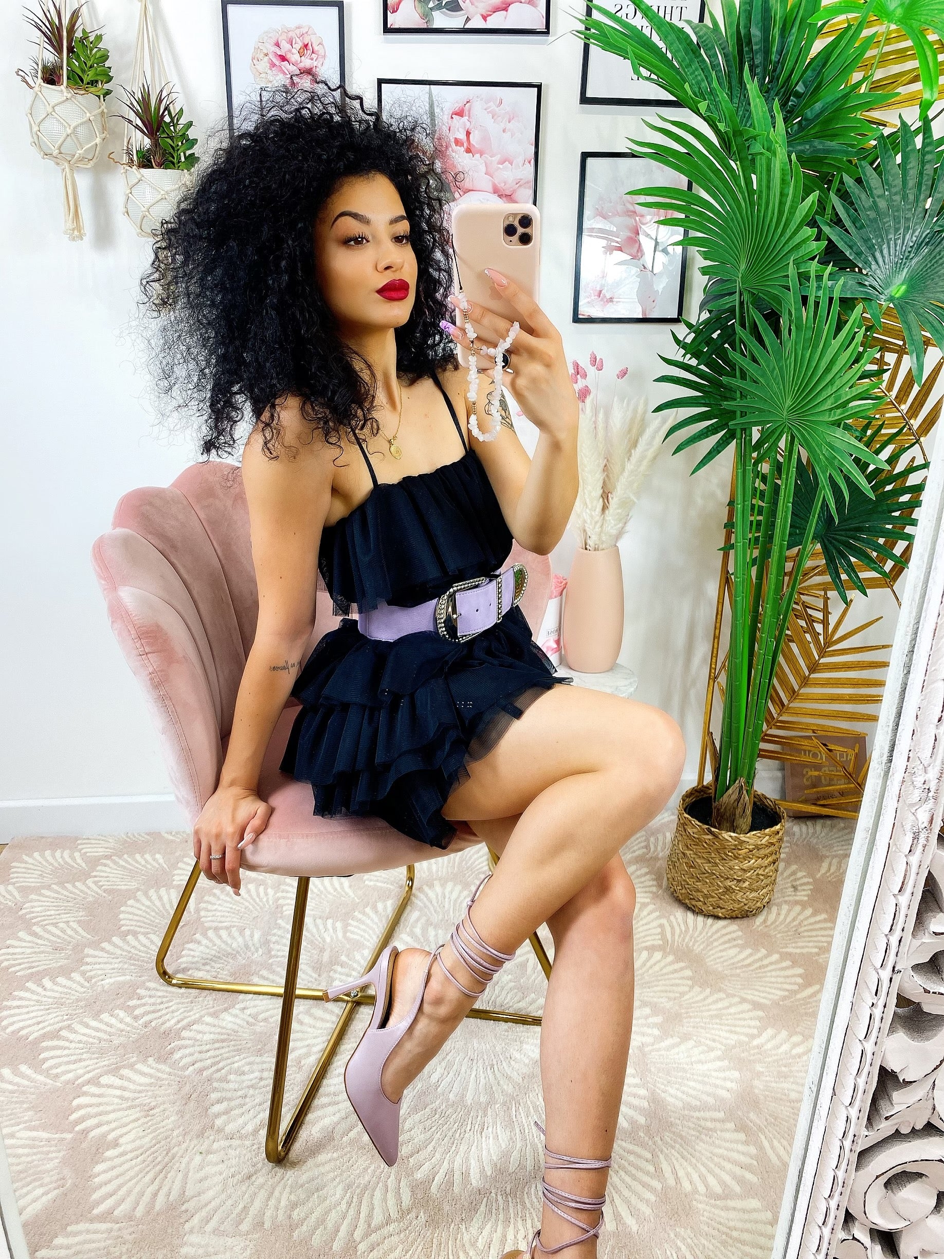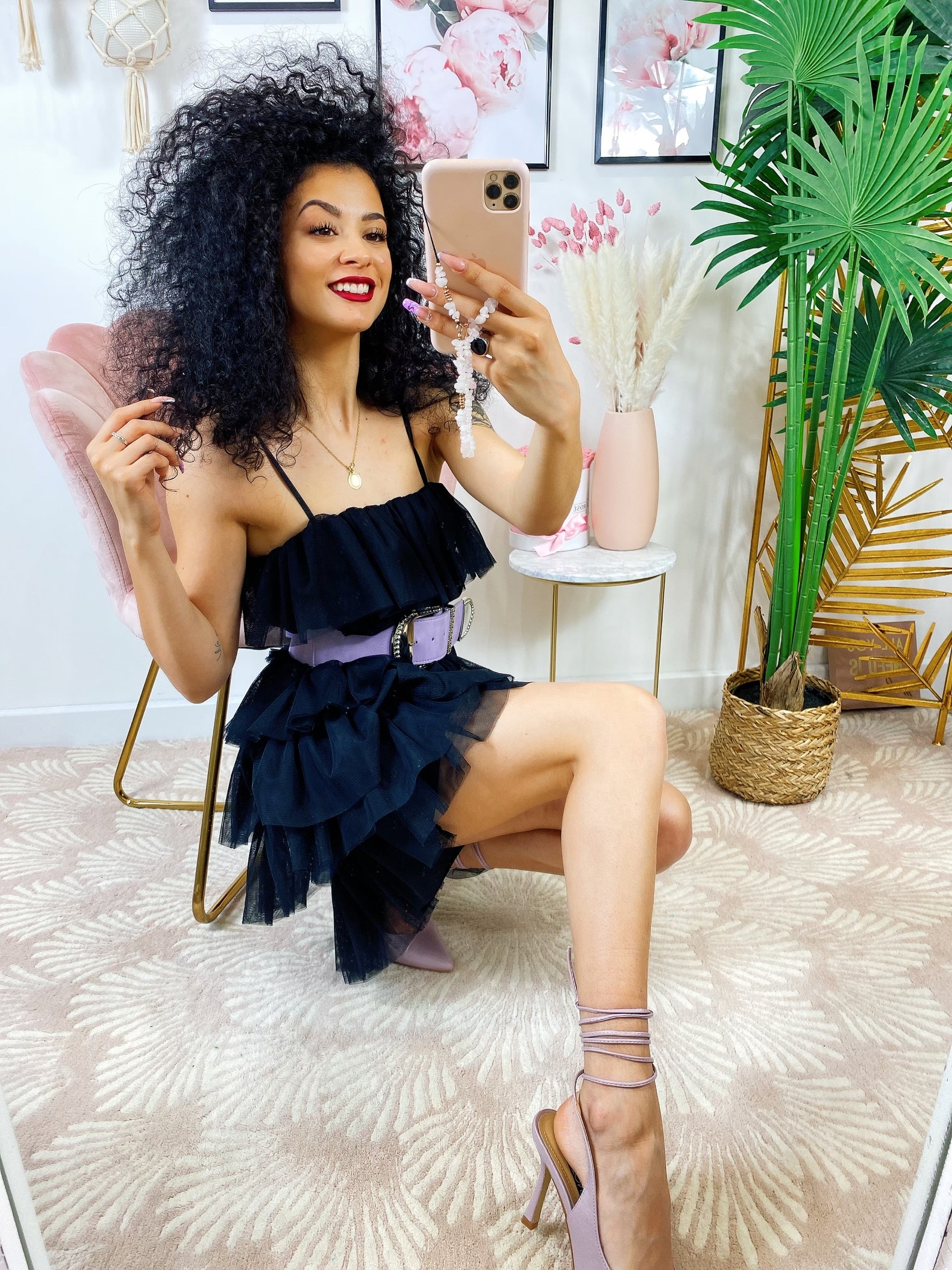 Abito in tulle con balze voluminose. Perfetto con un cinturone in vita così da esaltare la gonna.