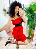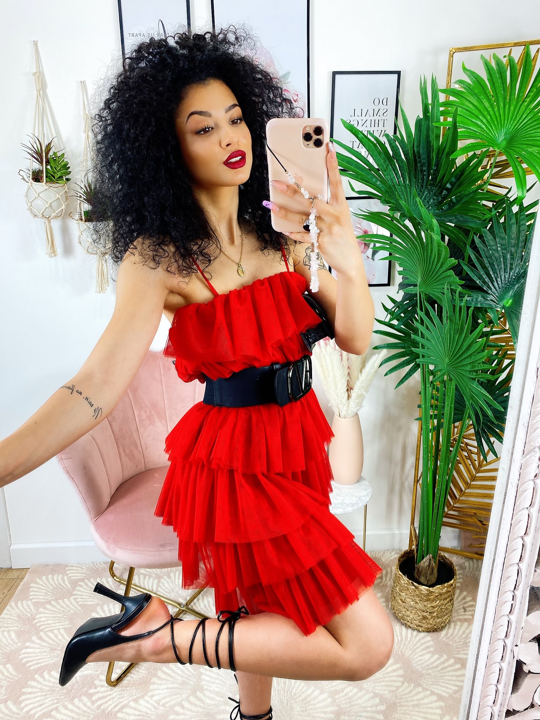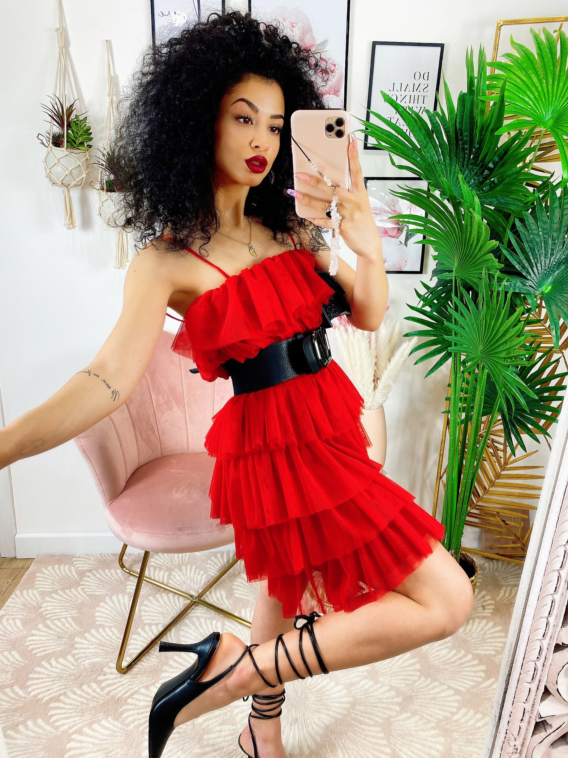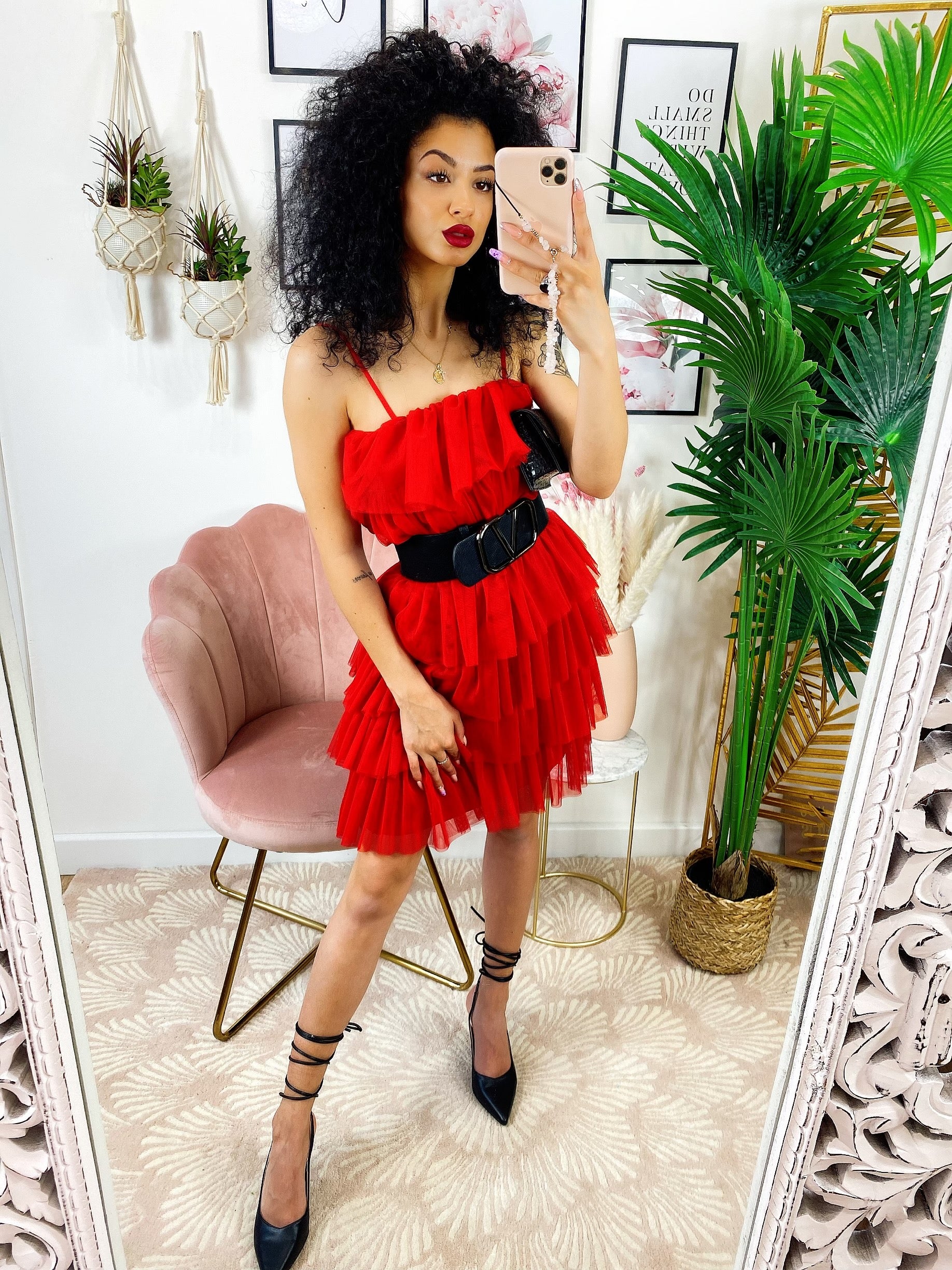 Abito in tulle con balze voluminose. Perfetto con un cinturone in vita così da esaltare la gonna.