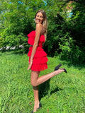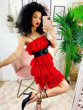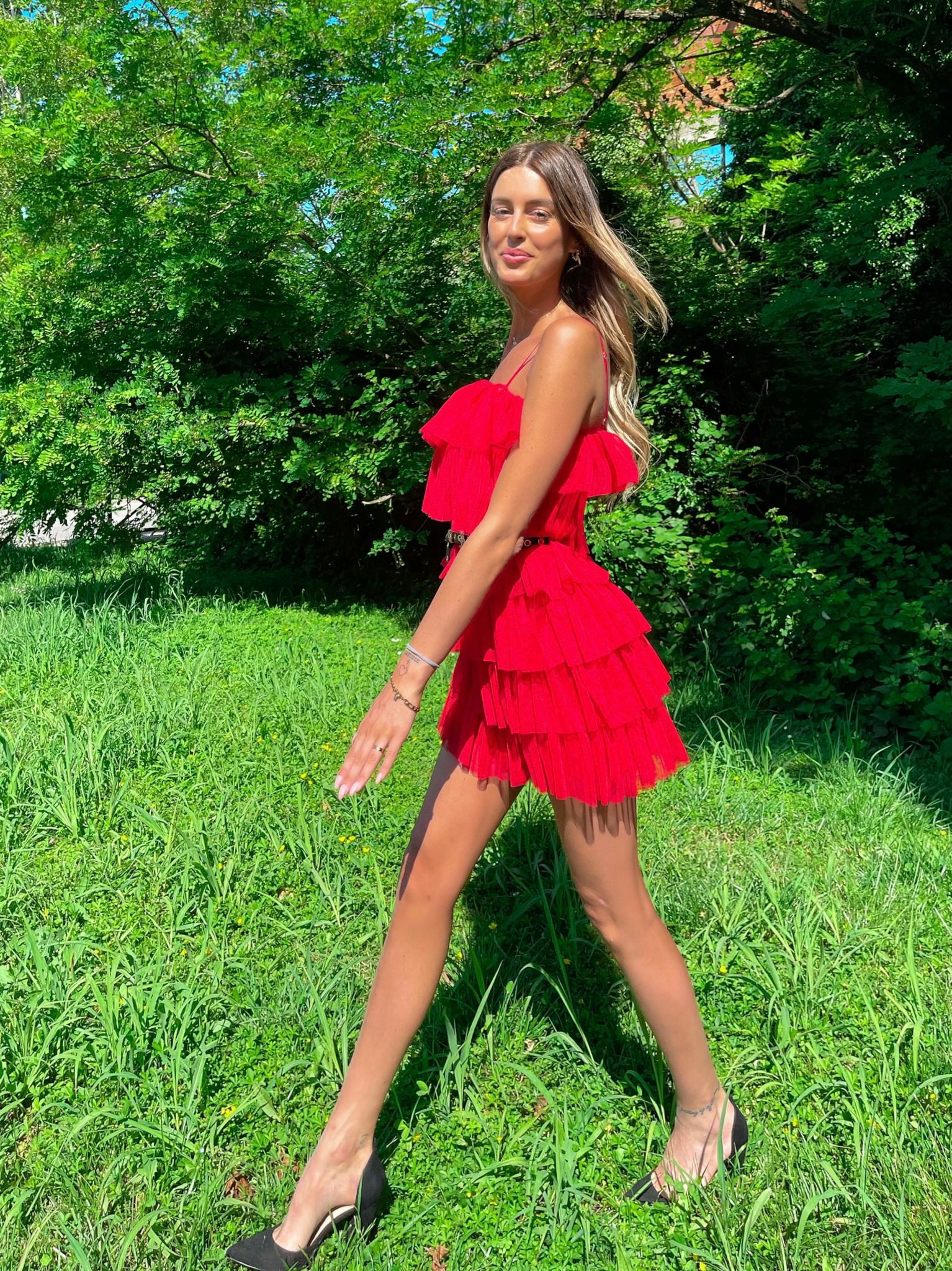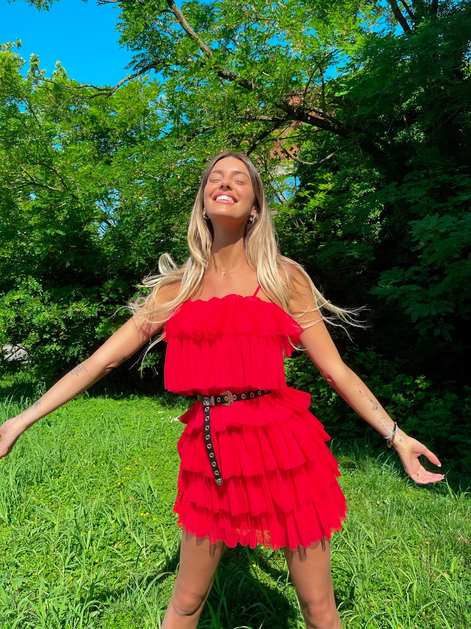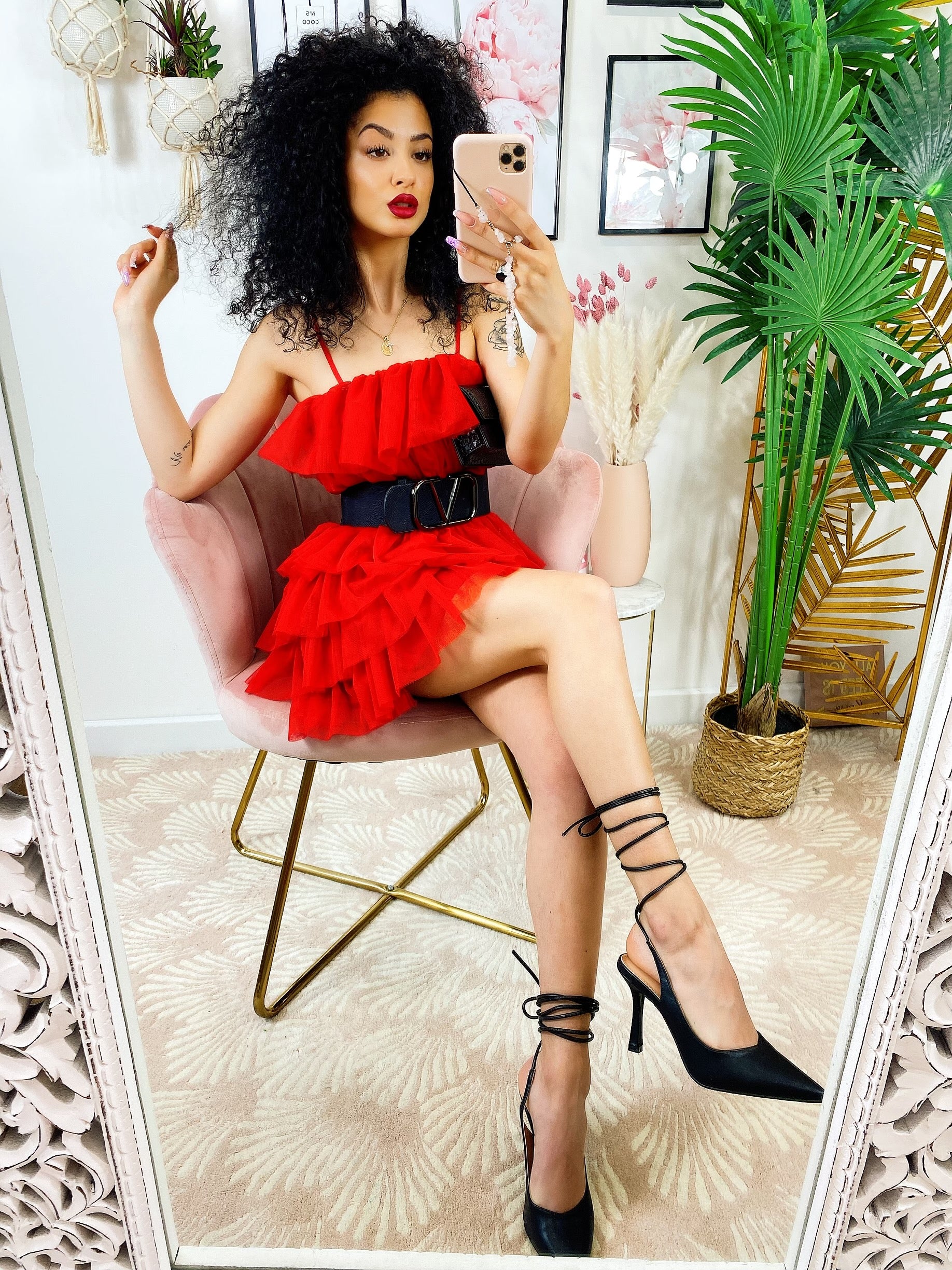 Abito in tulle con balze voluminose. Perfetto con un cinturone in vita così da esaltare la gonna.