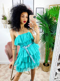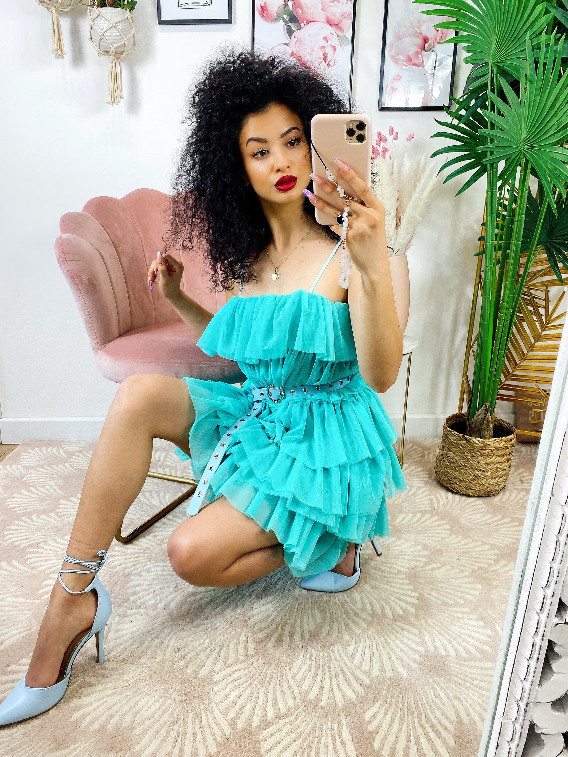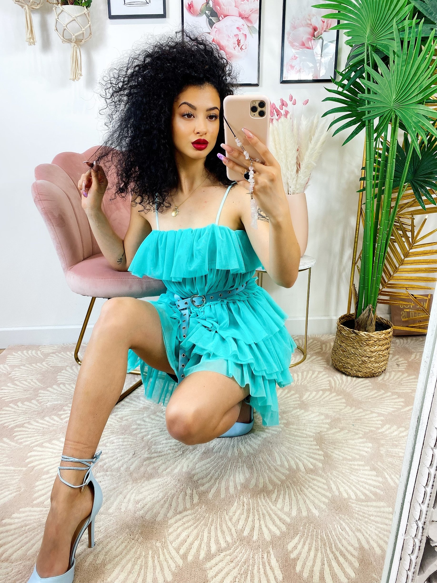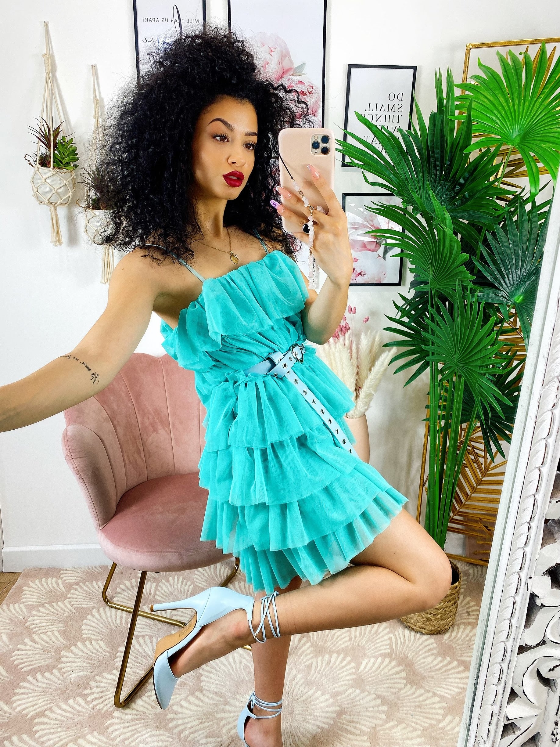 Abito in tulle con balze voluminose. Perfetto con un cinturone in vita così da esaltare la gonna.