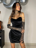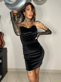 Abito in velluto con scollo a cuore e coppe, zip nel dietro. Manicotti velati inclusi