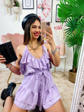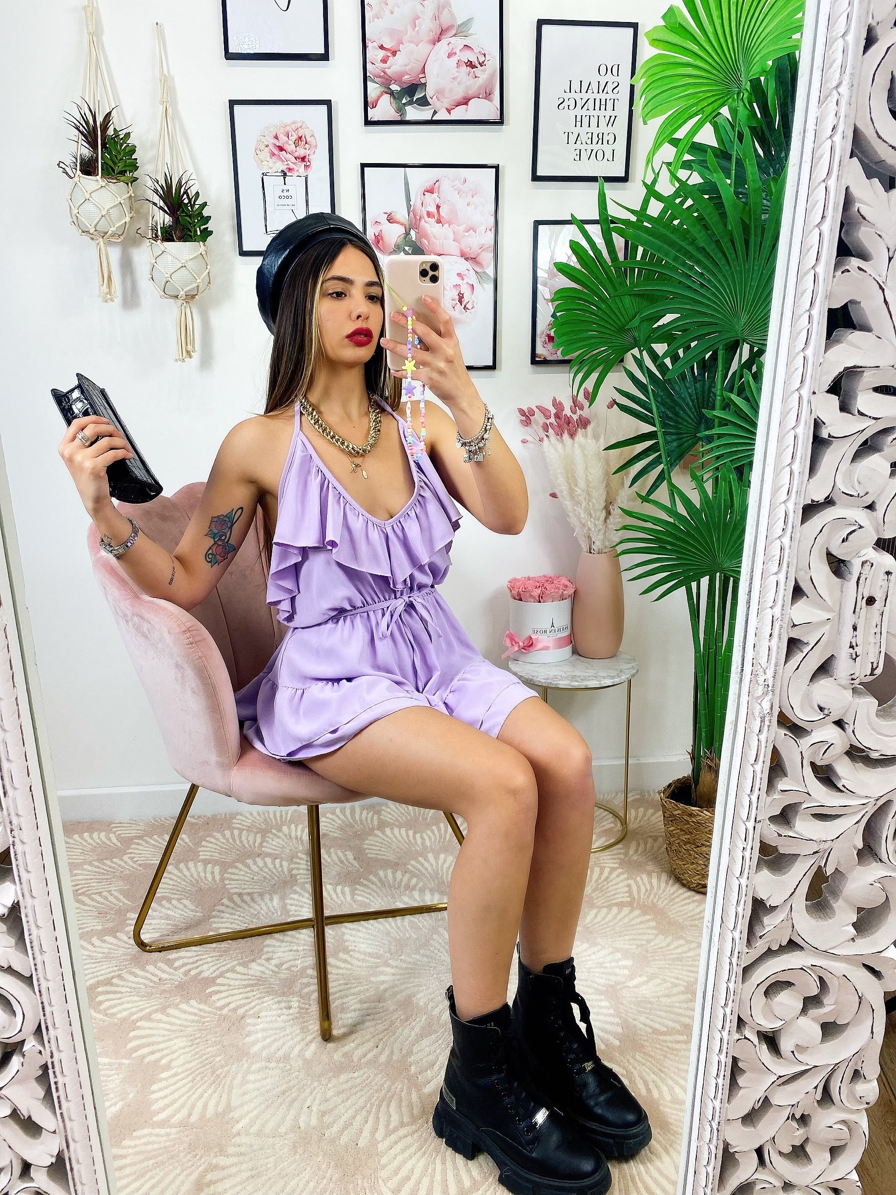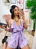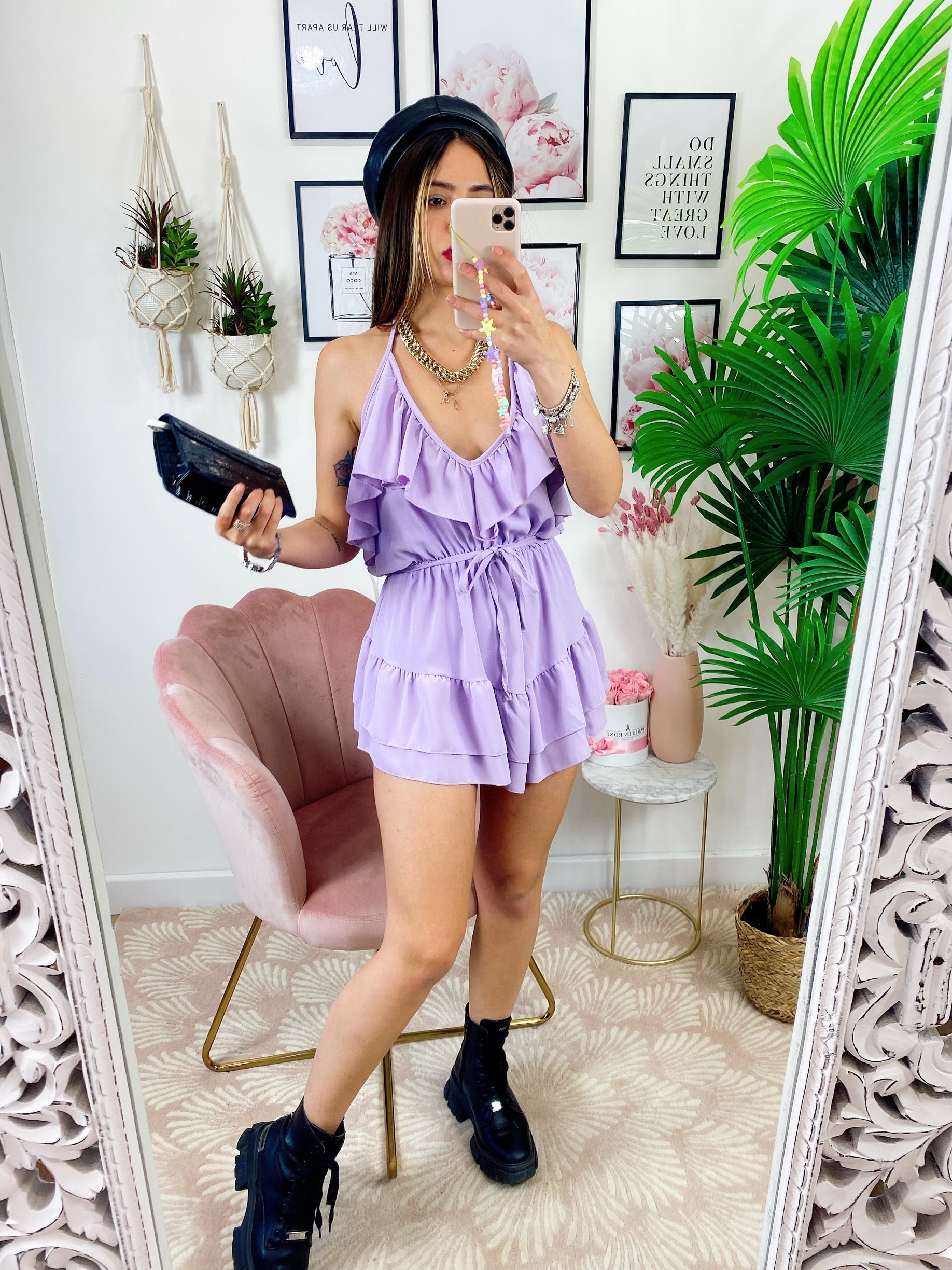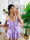 Tutina lilla con rouge, foderato con sotto pantaloncino, senza coppe regolabile al collo.