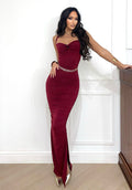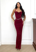 Abito lungo con drappeggio e fiocchetto bordeaux