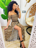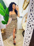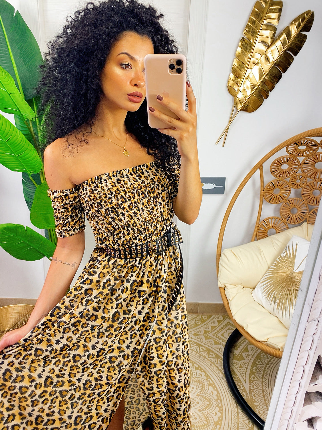 Abito A fantasia maculato, Con manica attaccata e spacco sopra al ginocchio media lunghezza.
